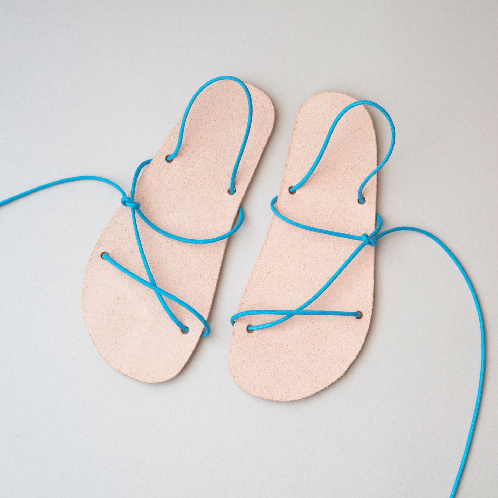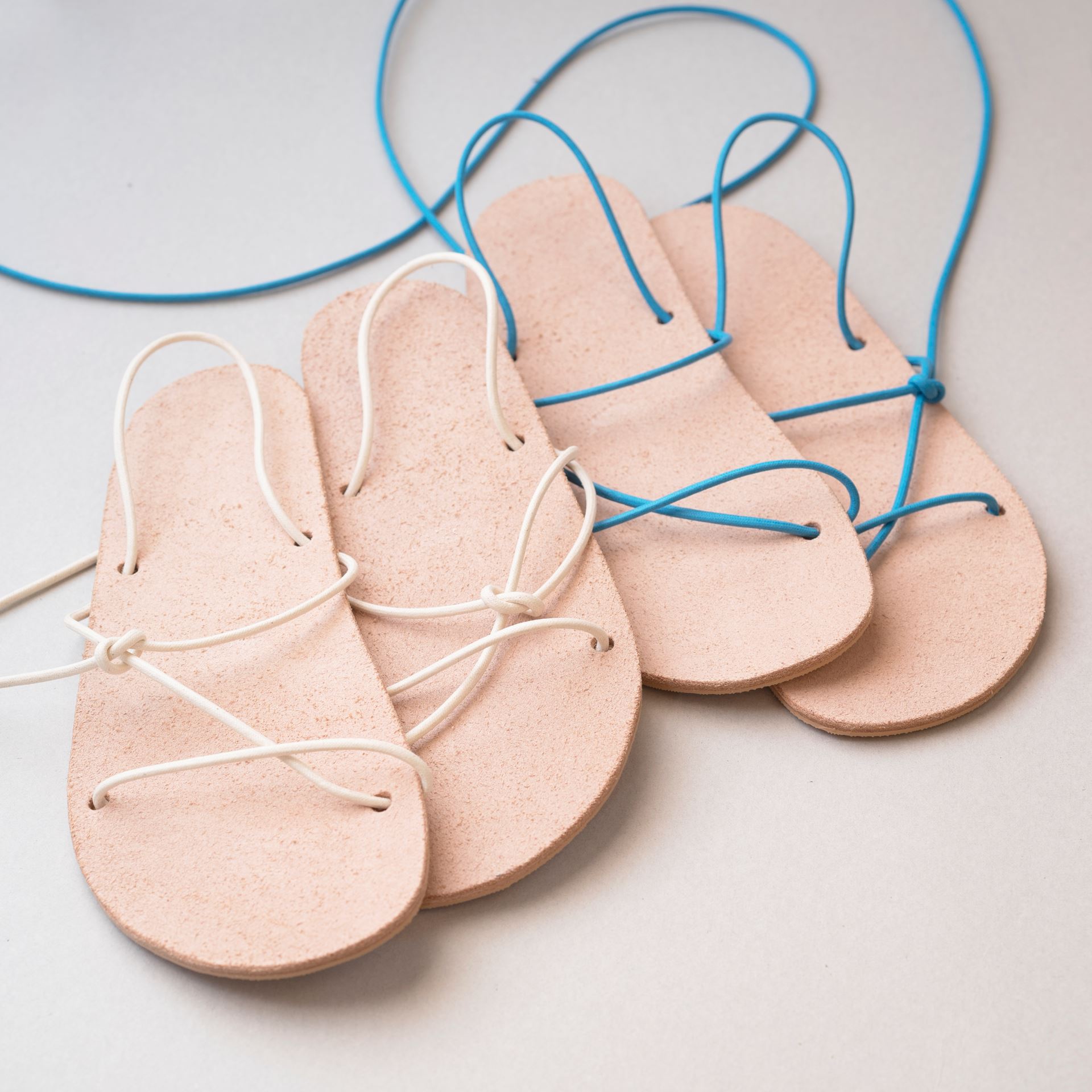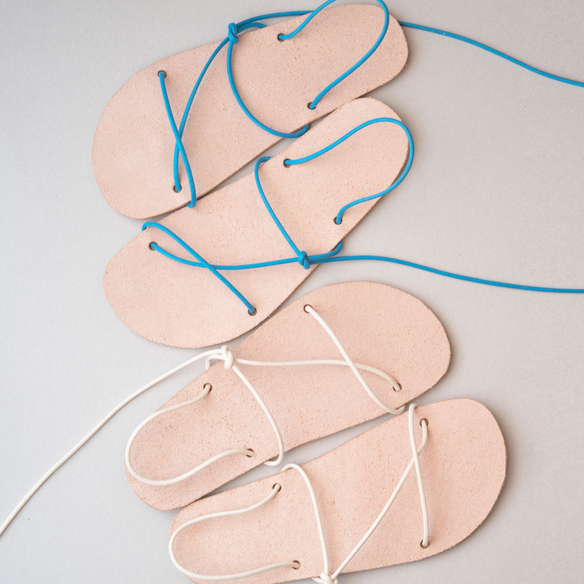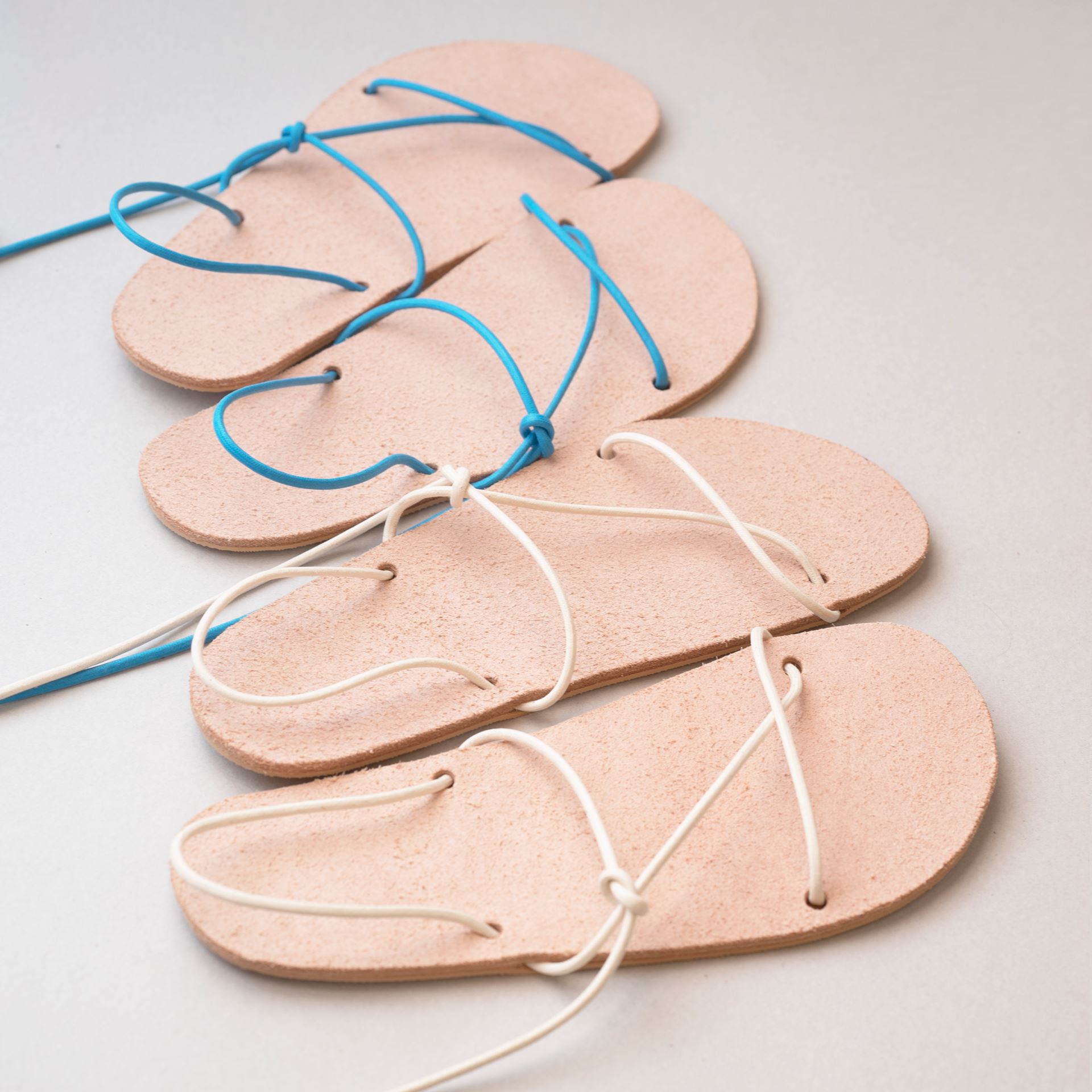 ワラーチ5型は生成りベースにオフとスカイブルー紐をそれぞれ合わせて2足お作りします。サンダルの切り抜きまですべて手作業で制作しています。