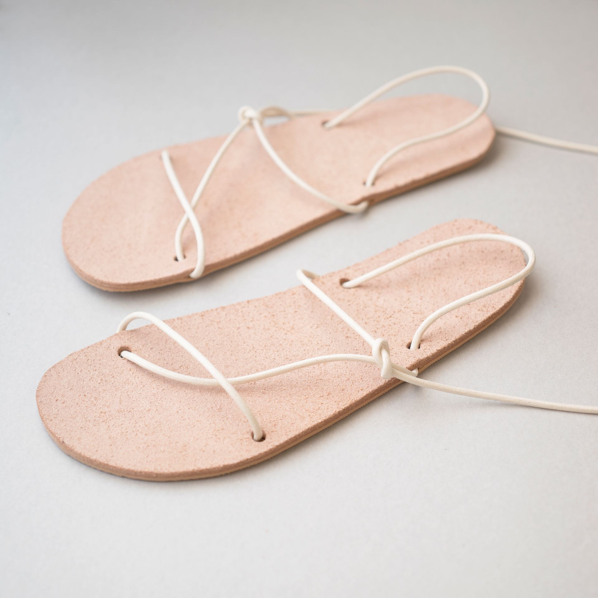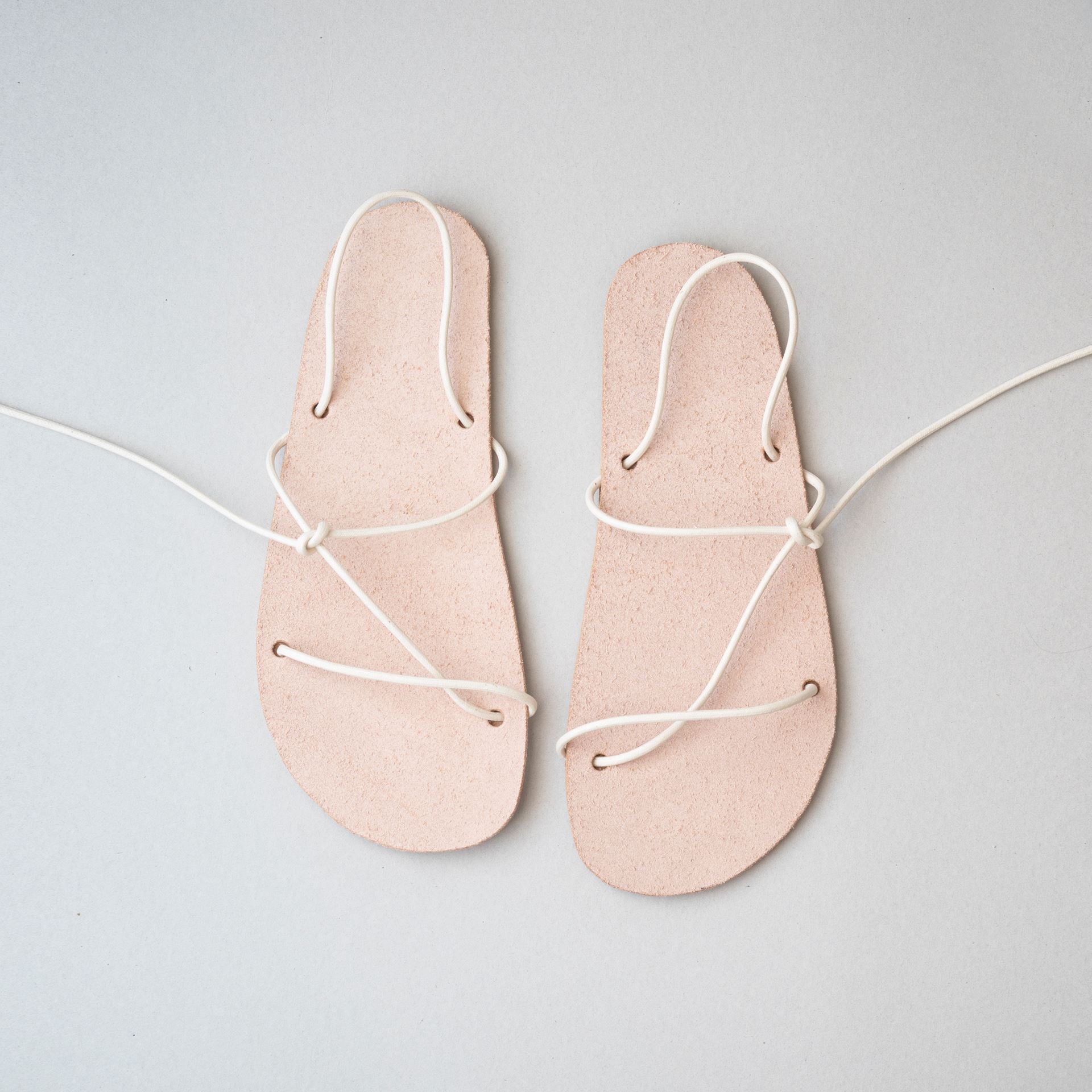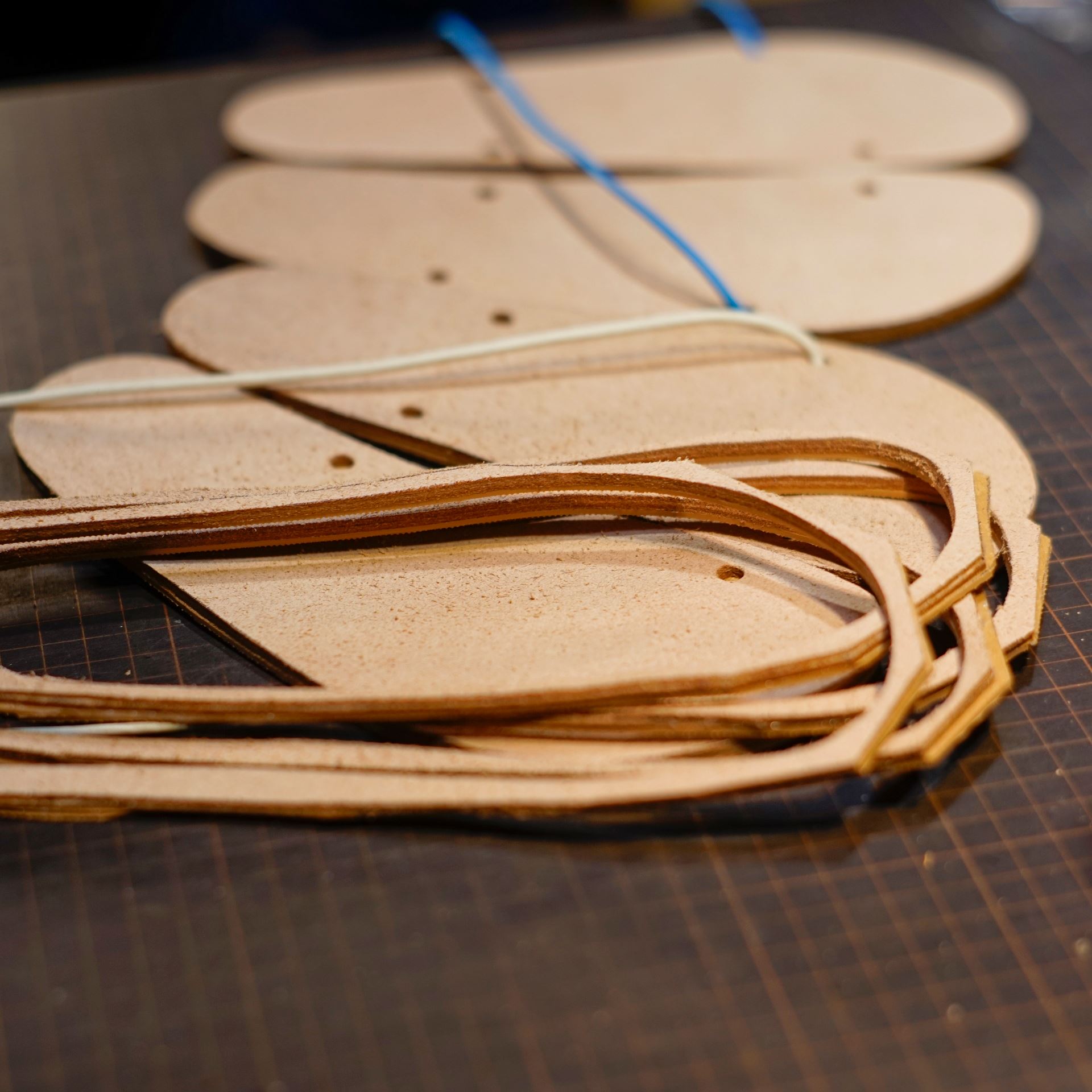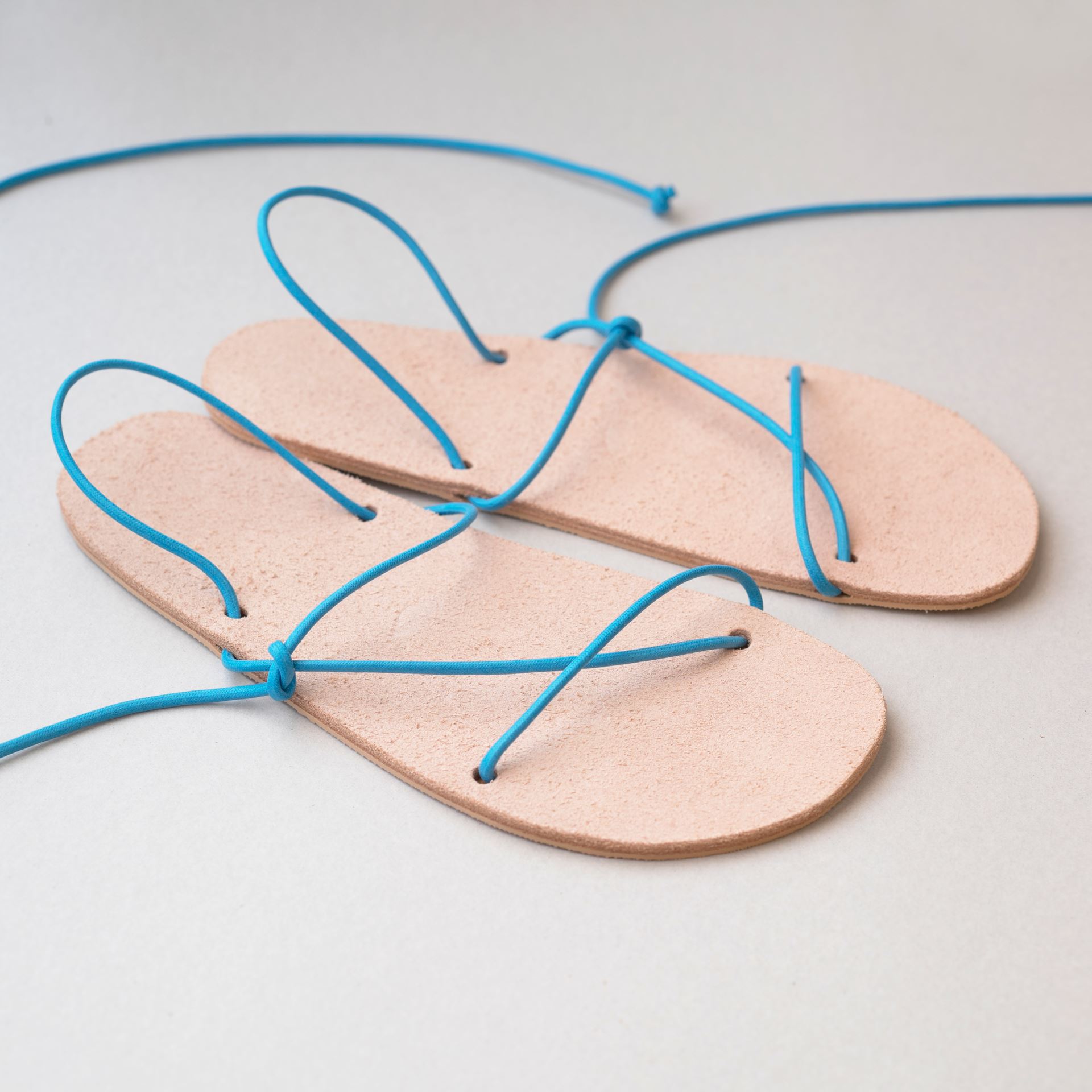 ワラーチ5型は生成りベースにオフとスカイブルー紐をそれぞれ合わせて2足お作りします。サンダルの切り抜きまですべて手作業で制作しています。