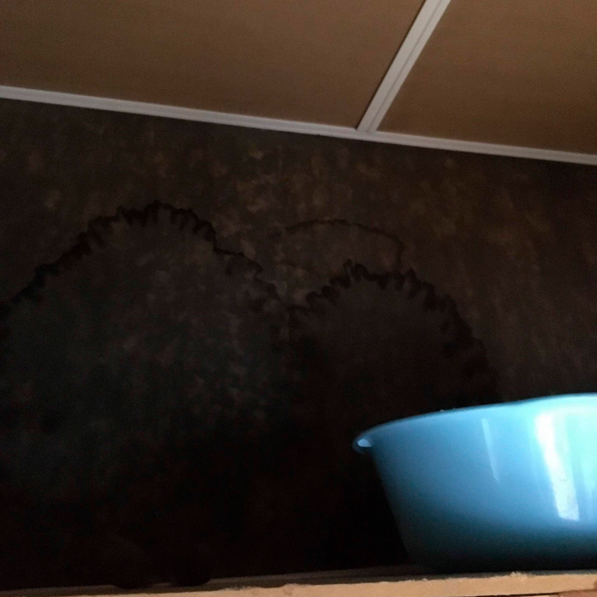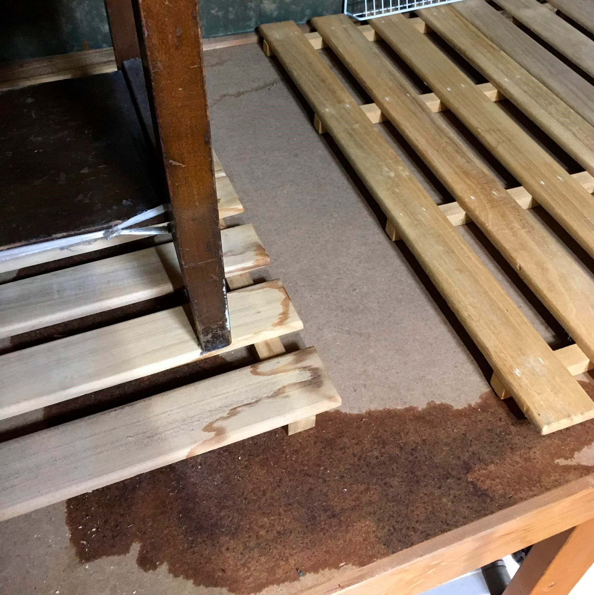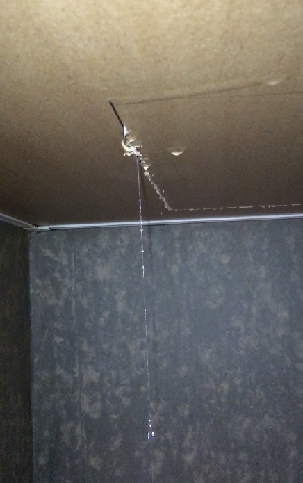 これは根本治療が必要です。写真はお見苦しいので控えますが、天井の真上の屋根が劣化して雨水が漏れていました。それを何とか修復。屋根からの雨漏りはとりあえず止まりました。