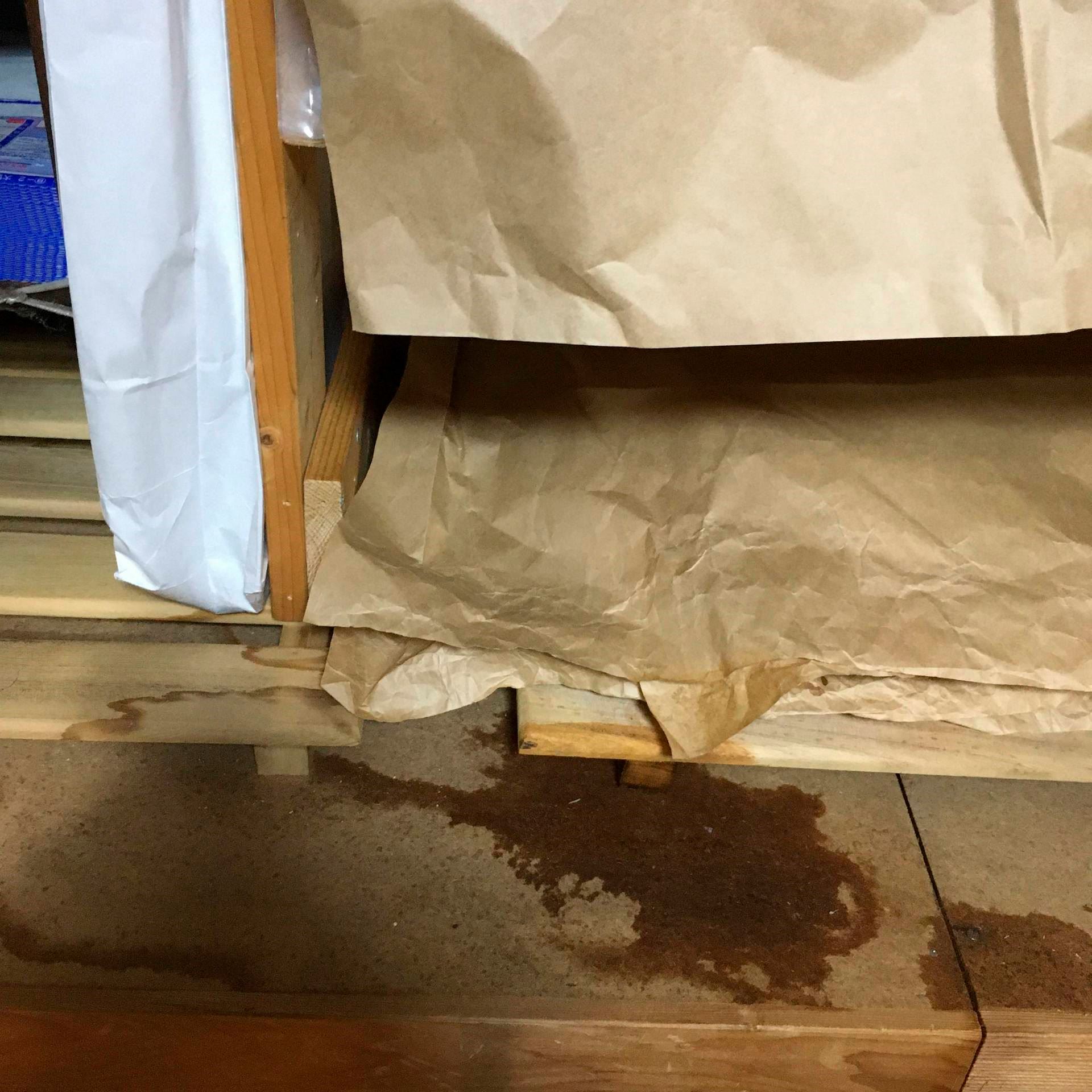 急ぎ大量の革を押入れから引っ張り出し確認。シミになった革が数枚!損害はあまりありませんでしたが、精神的ショックが。