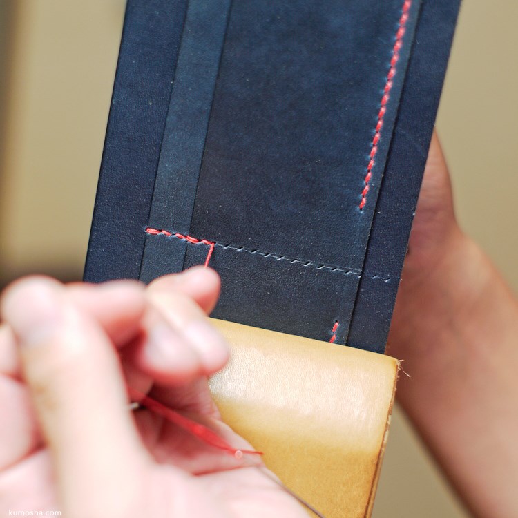 濃い紺色にビビッドな赤いラミー糸が映えますね。ぐるりと縫い上げると印象がグッと引き締まります。