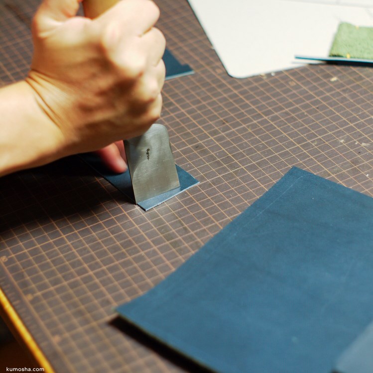 紺の栃木レザーをカットします。カットはまず型紙からケガキ線を入れて、革包丁でパーツを一つずつ切り出していきます。ロットごとに色が変わってくるのでなるべく同じ革からパーツを取り出すようにしています。切り出したパーツを早速手縫い。急いでいたため途中写真少な目ですがご容赦ください。