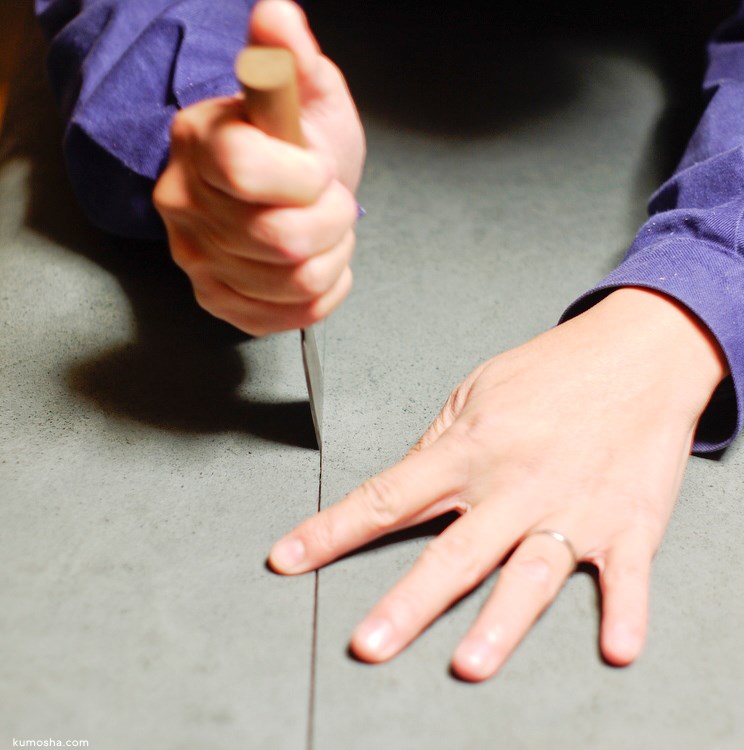 黒の床ベロアをカットします。ロットによって色の濃さが若干異なります。今回の黒は少々薄くて光の当たり具合では灰に見えます。