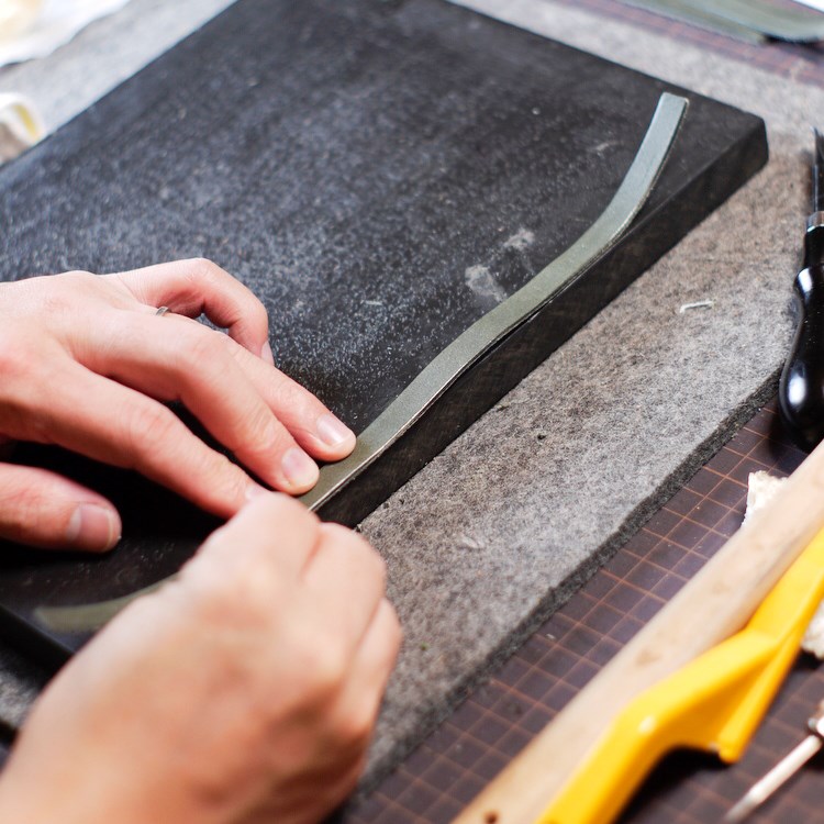 今回は栃木レザーのオイルヌメ、灰色を使っておつくりしていきます。厚手のヌメ革にケガキ線を入れて、革包丁でまっすぐカットしていきます。革包丁は研ぎたてで切れ味抜群。気持ちよく切れます。