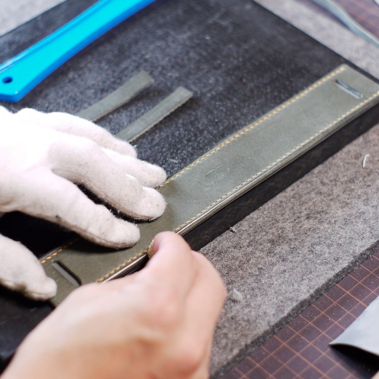 ベルト系の商品で一番手間がかかるのがコバ(革の断面)磨きです。小さなパーツひとつひとつにヘチマで磨きを入れておきます。