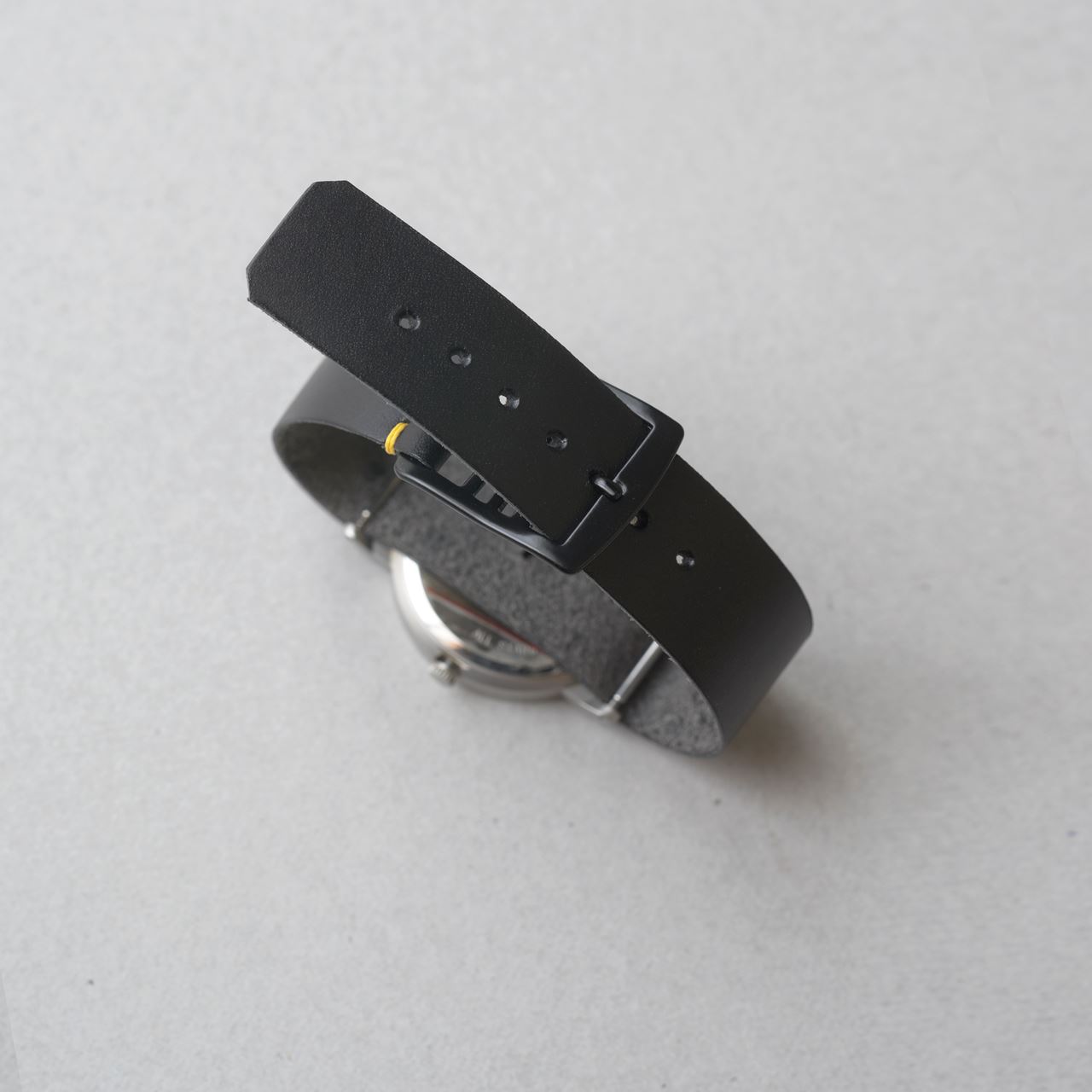 時計のベルトでは必須となるベルトループもデザイン上の邪魔になるので、スイス軍で採用されていたベルトバックルを参考にして、余ったベルトの先を内側に通すスイス軍式を採用しました。これでベルトループの無い理想のベルトに近づきました。