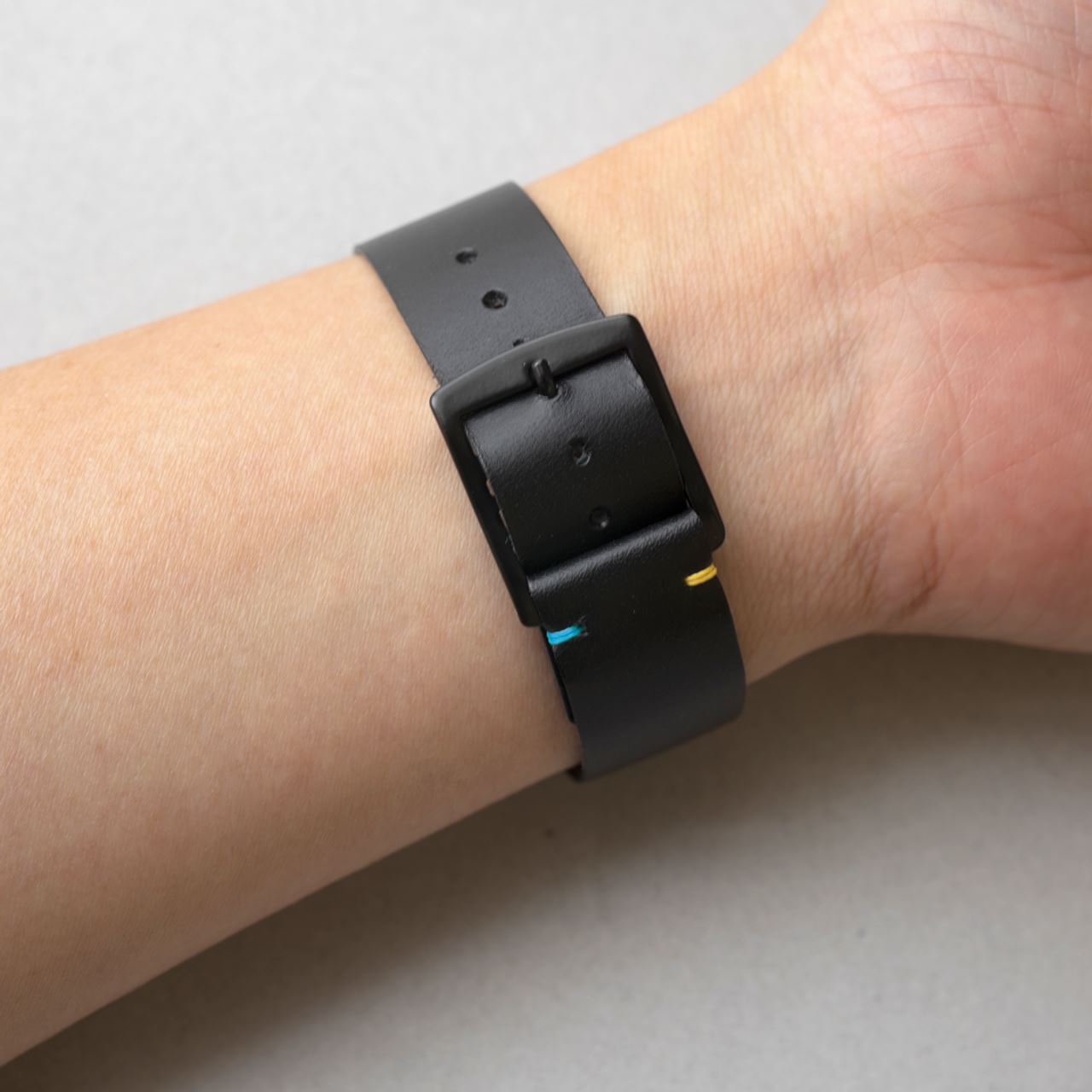 あれこれ試作しまして、一つの完成形が出来上がりました。まず革は厚手のイタリアンソフトから薄くてもハリのあるイタリアンハードに変更しました。もちろん貼り合わせや、縫い合わせの無い一枚革です。幅は18mmなのでAW10などにも使用可能です。