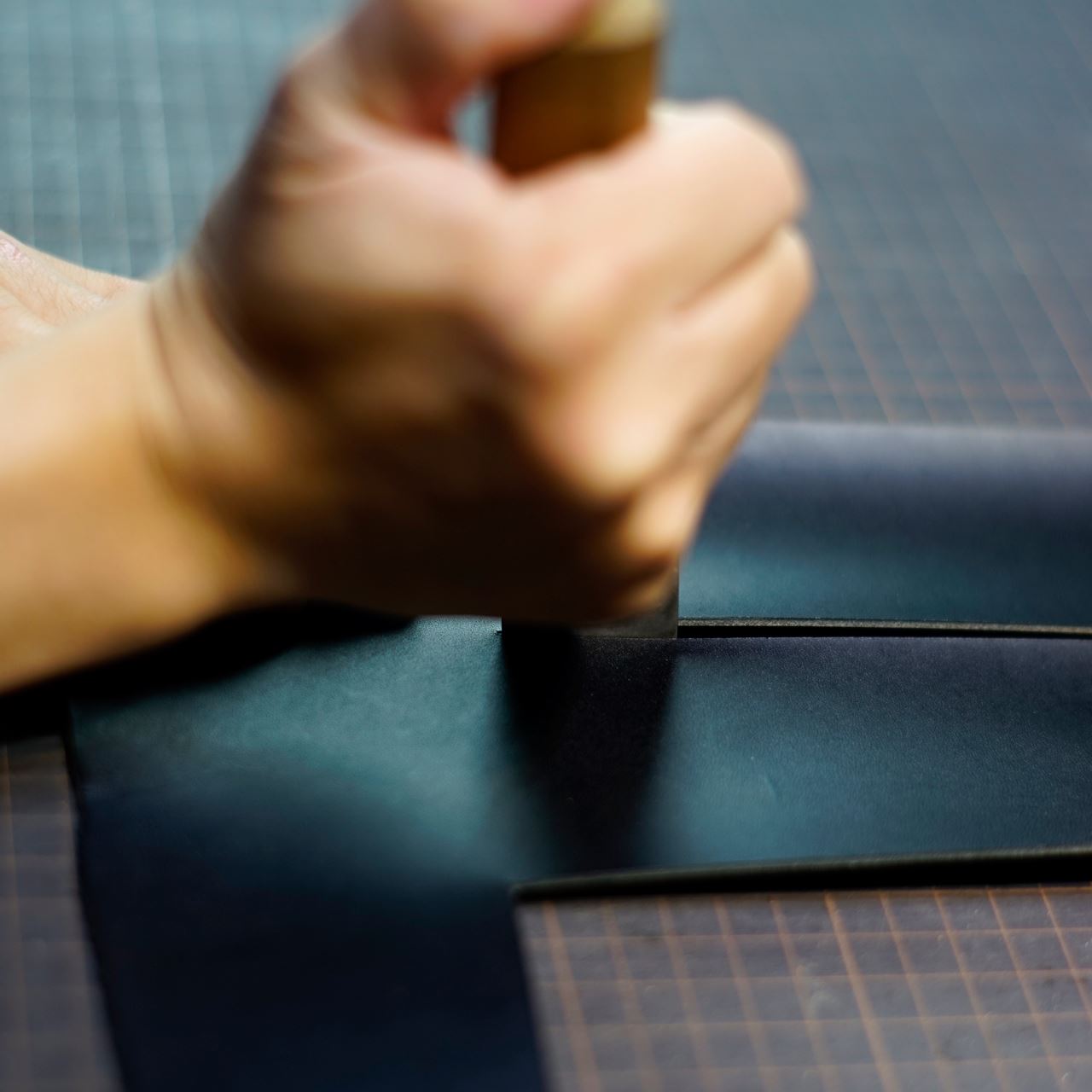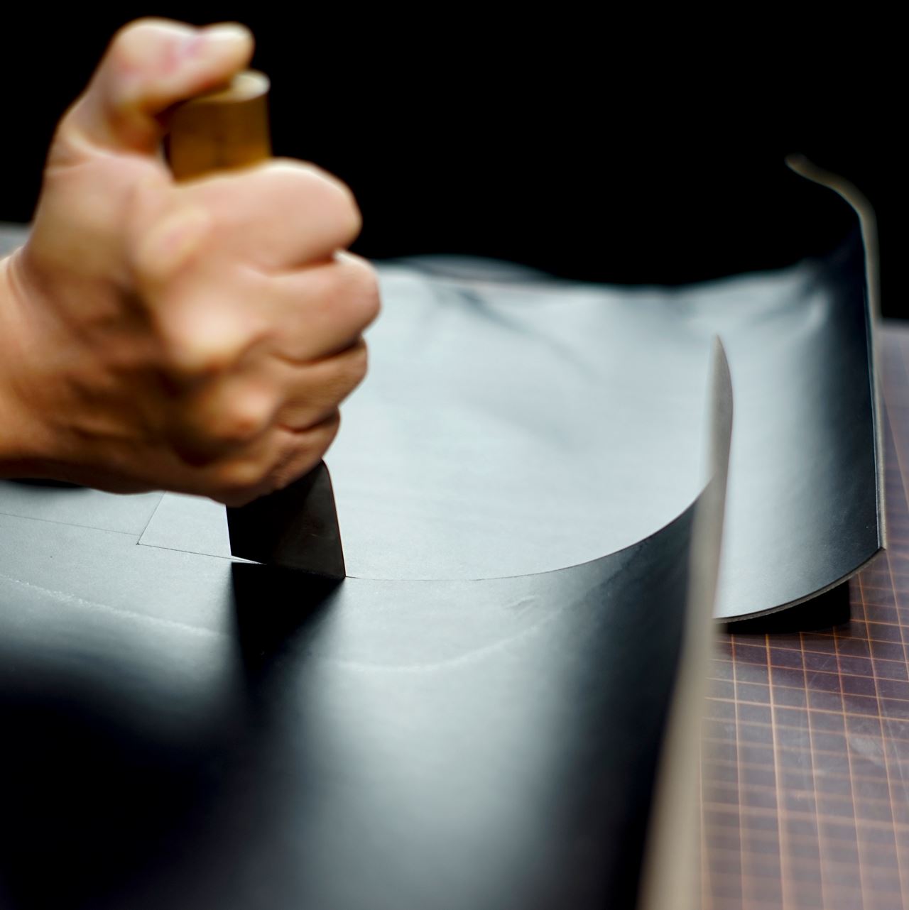 まずは持ち手と内ポケットの制作から取り掛かります。どちらも黒革ご希望ですので、イタリアンハードの黒革からパーツを切り出します。