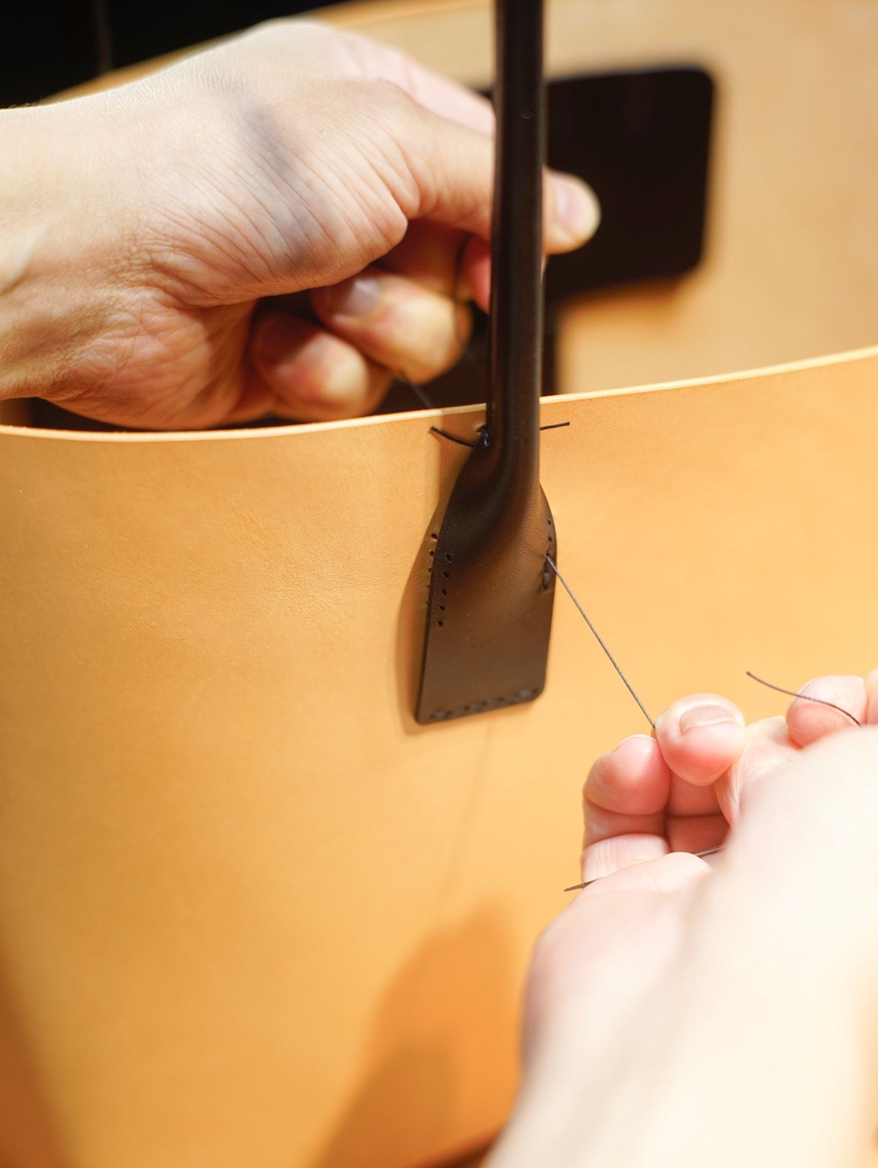 Eさんからご依頼いただいた、黒革と生成り革のコンビネーションのトートバッグ2型を引き続き進めていきます。