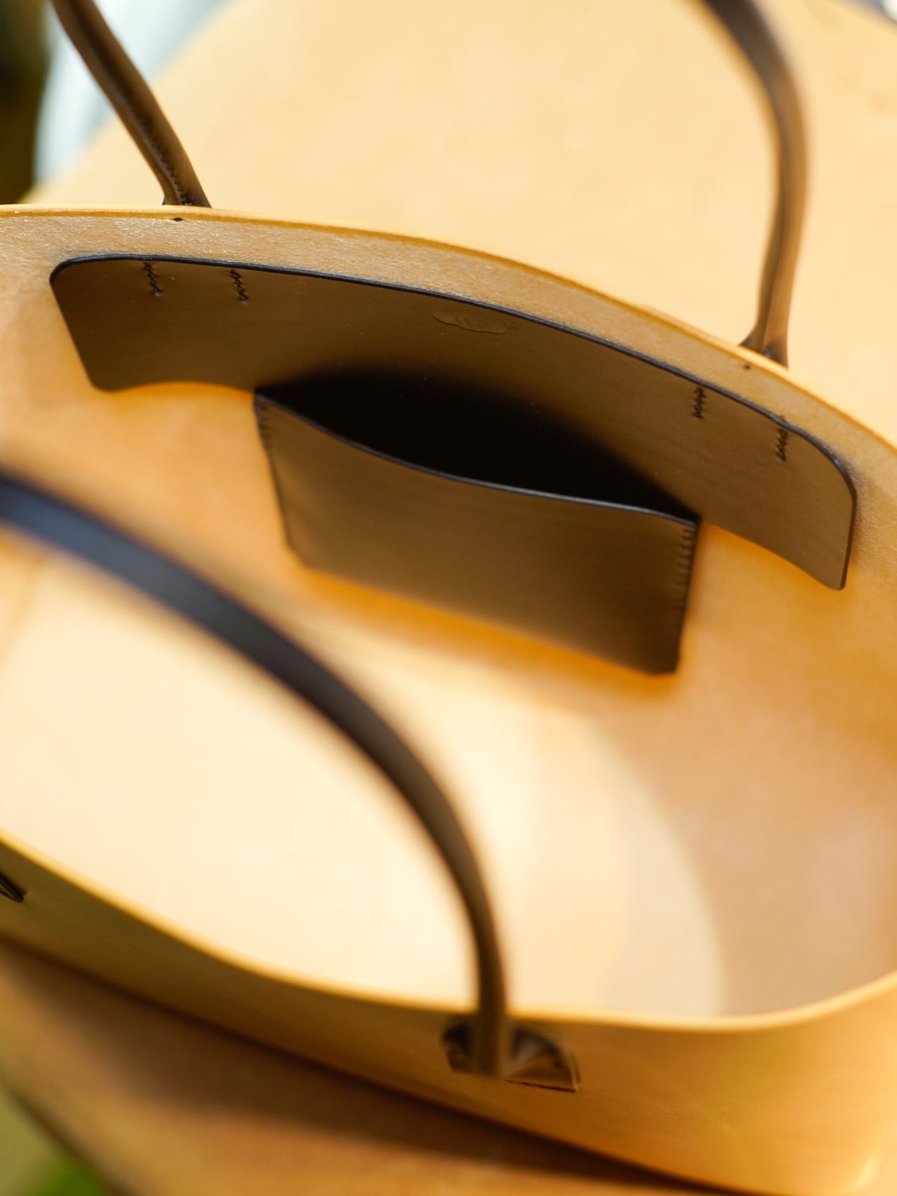 厚手の植物タンニン鞣し革一枚革と麻糸の手縫いでつくった、しっかりと自立するシンプルなトートバッグです。肩にもかけられる長さの持ち手は丸みを帯びた筒状にして手縫いしましたので、手に持った時の指へのアタリがソフトでしっかりした印象を与えてくれます。