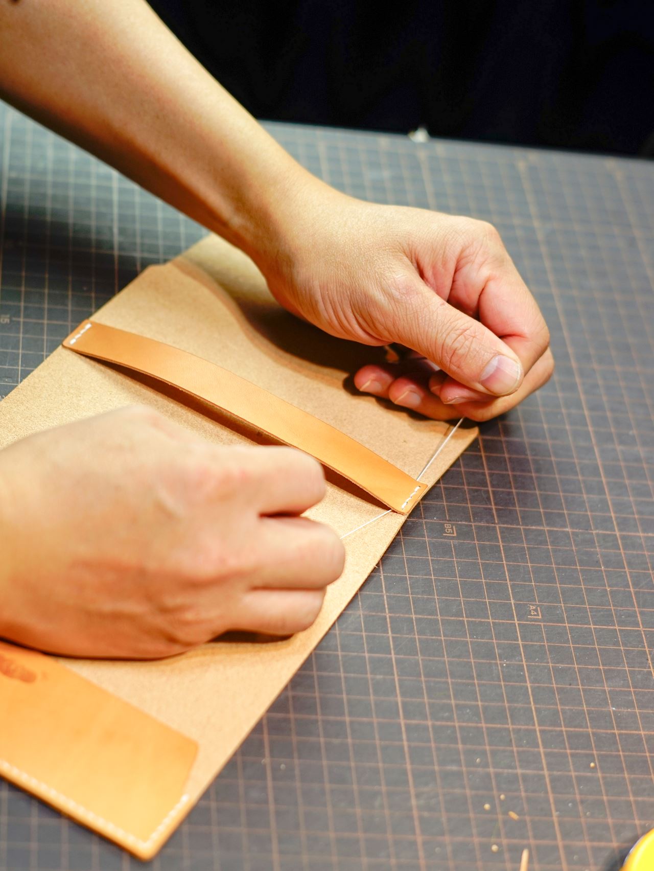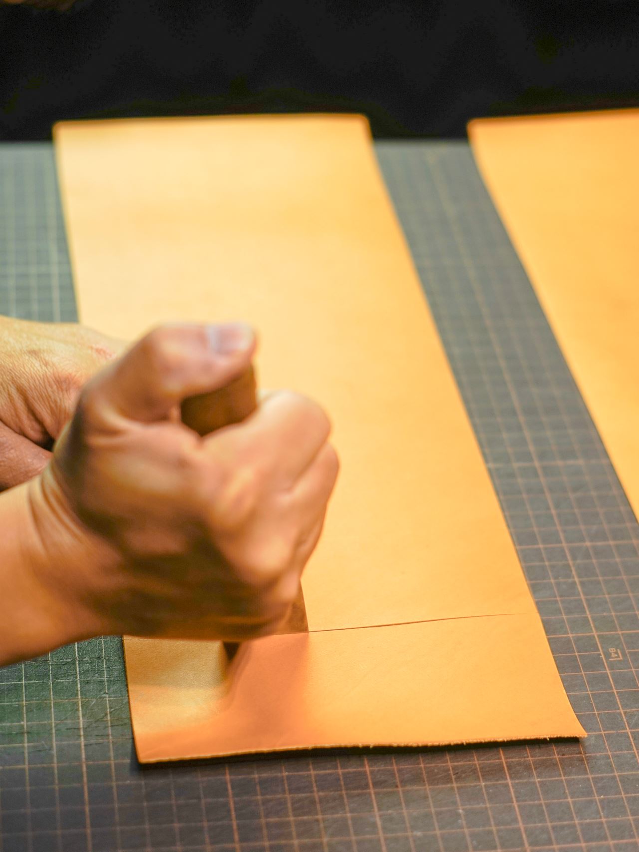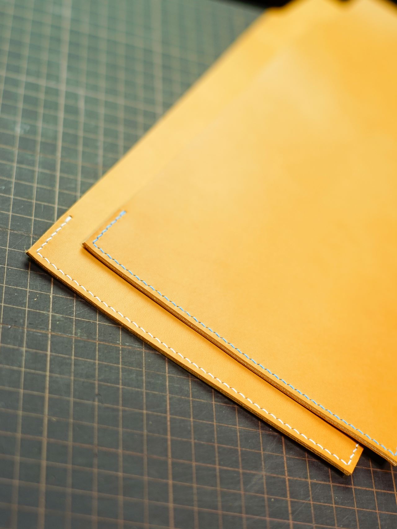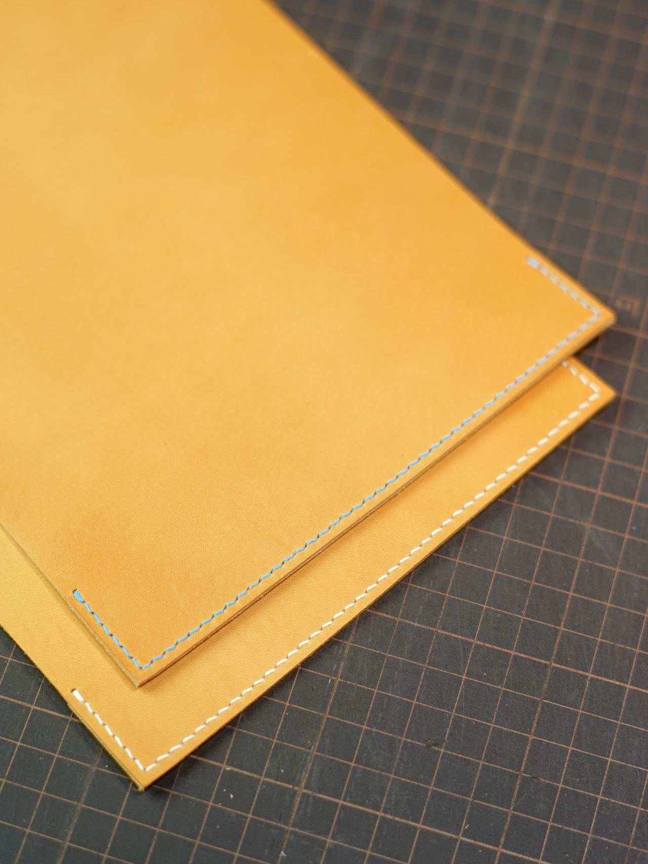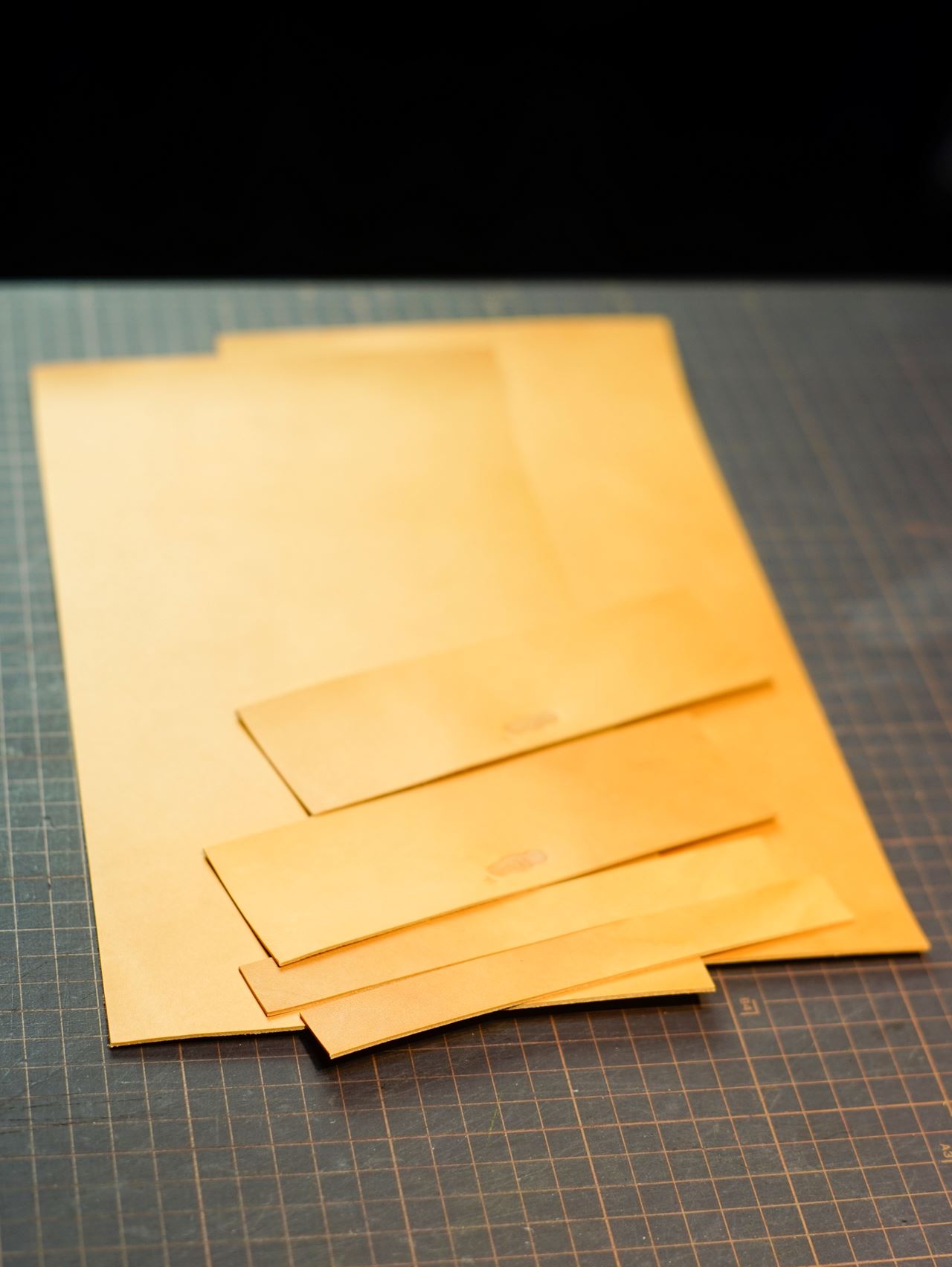 生成り革を2つ分カットして、くも舎刻印、目打ち、軽いコバ磨きを済ませておきます。