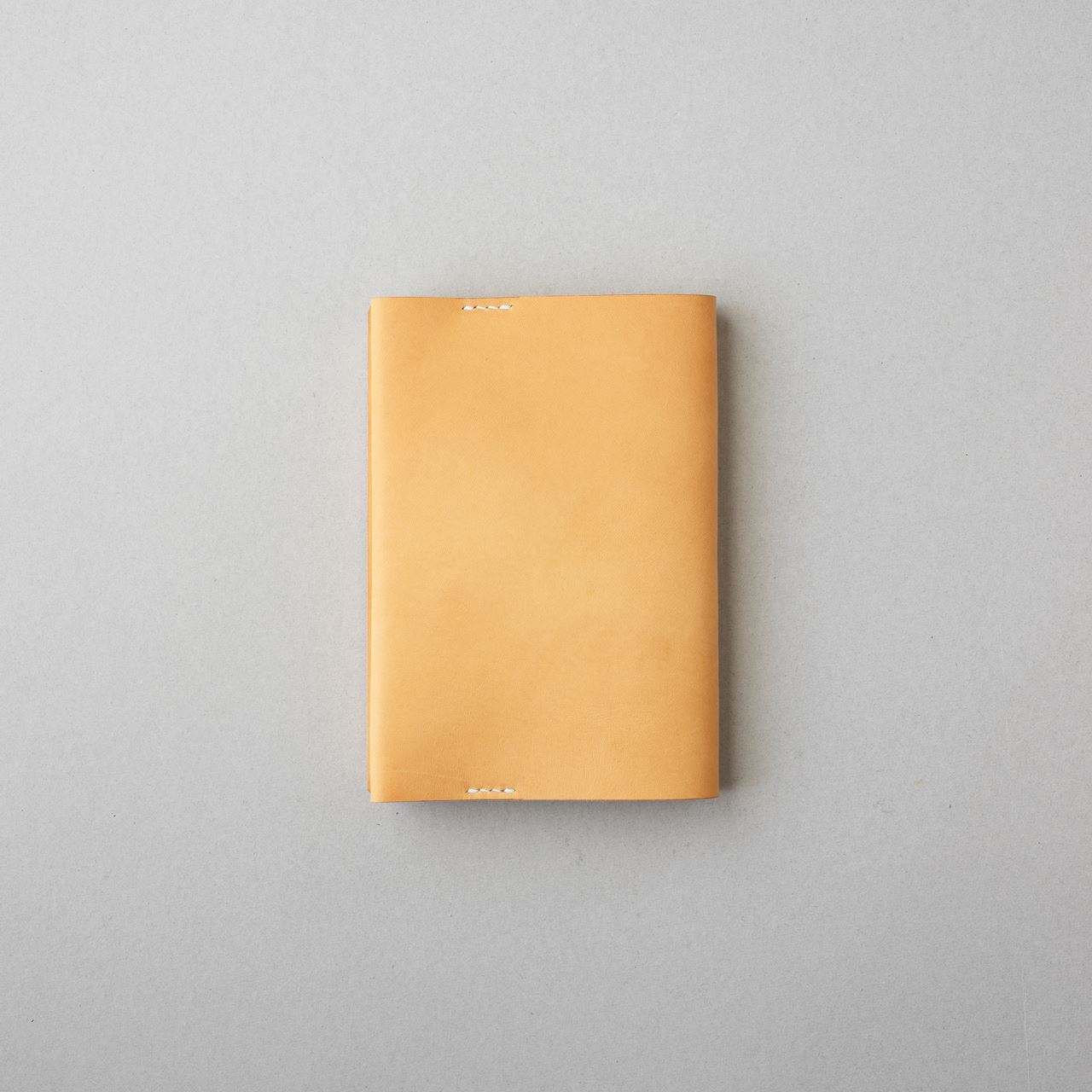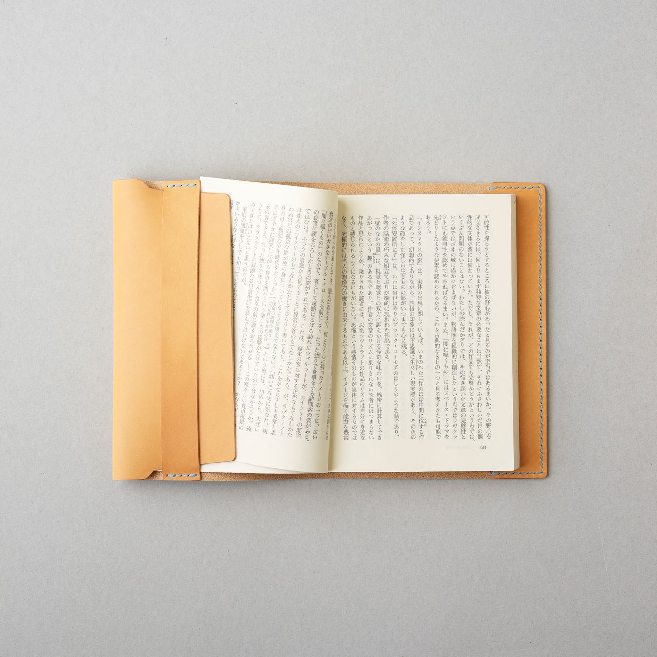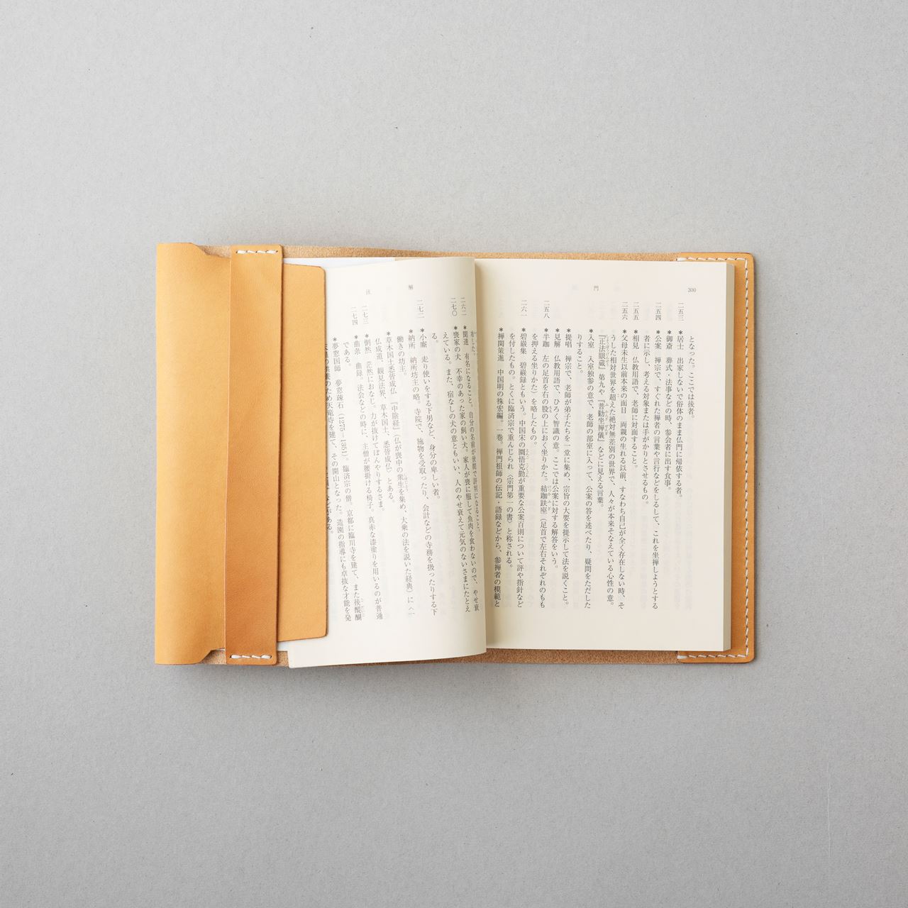 植物タンニン鞣し革に麻糸で手縫いを施したシンプルなつくりです。差込部にステッチを入れることで、ブックカバー1型をよりスマートに、本を読みやすく進化させました。