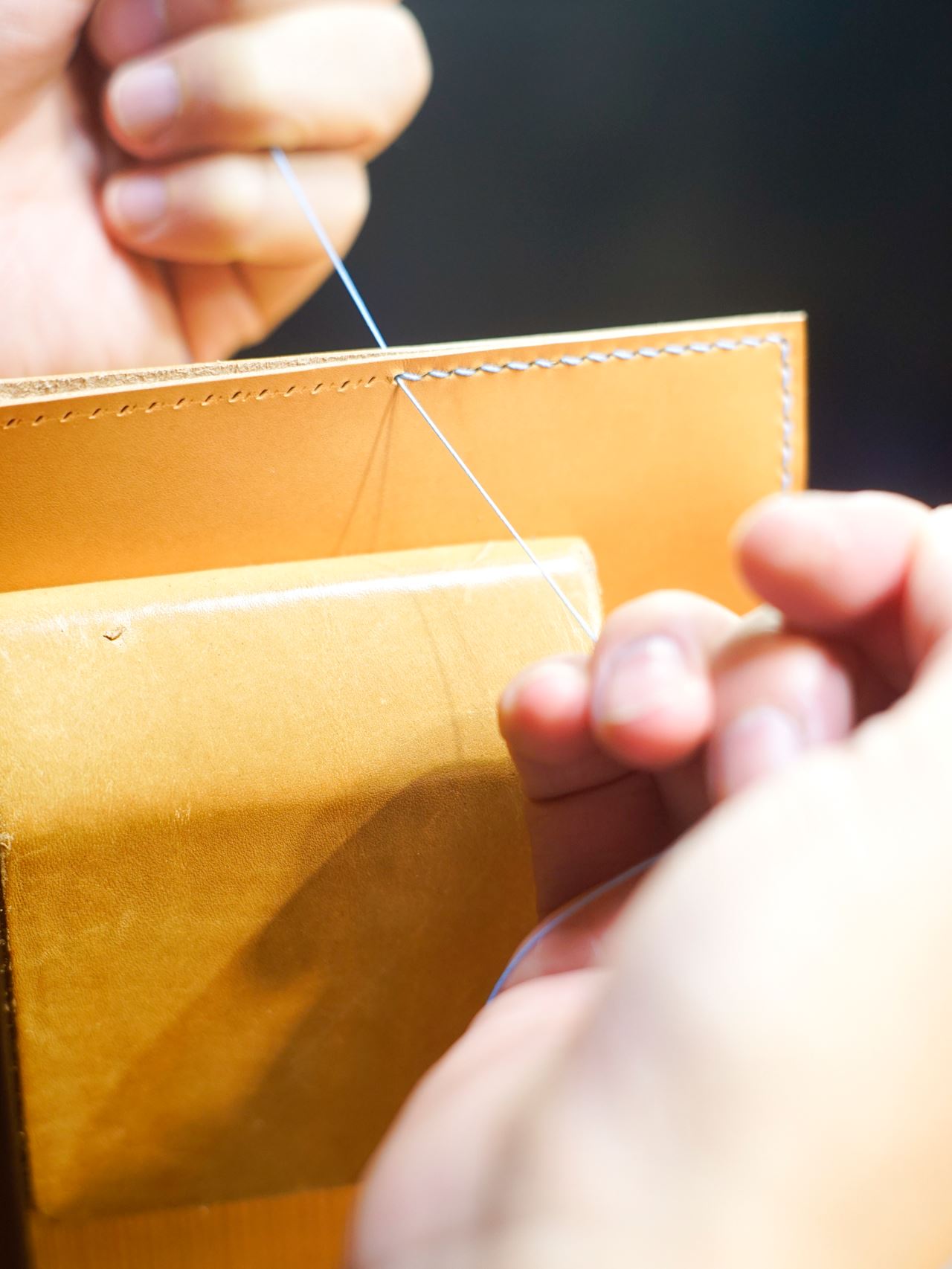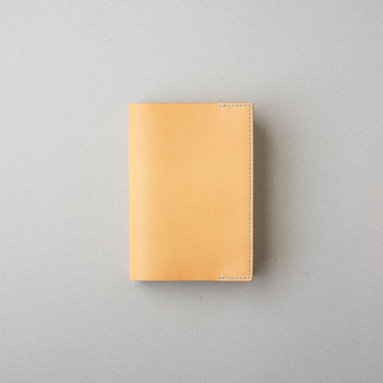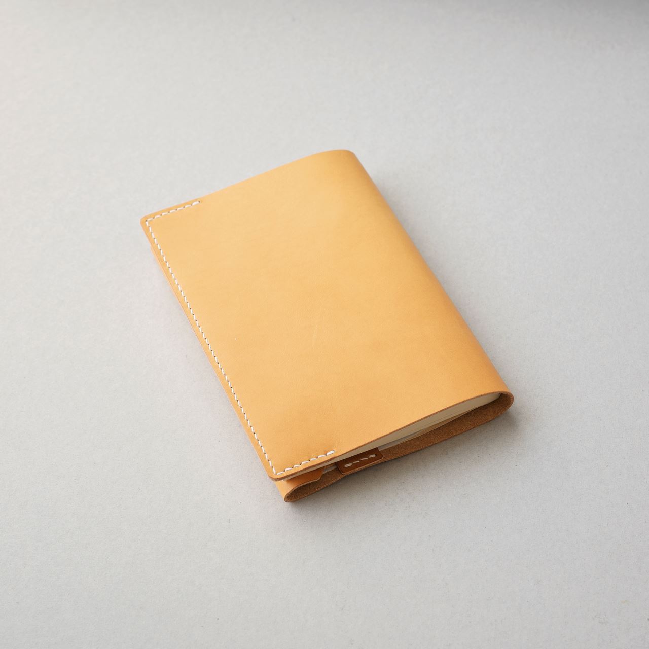 植物タンニン鞣し革に麻糸で手縫いを施したシンプルなつくりです。差込部にステッチを入れることで、ブックカバー1型をよりスマートに、本を読みやすく進化させました。