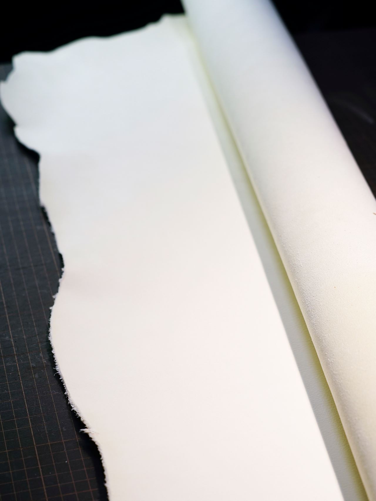 今回使用する革はイタリアンシボのビアンコ(白)になります。シボの白は今まで使用したことが有りませんでしたので、とても楽しみな革です。銀面(革の表面)が白いのはもちろんですが、床面もしっかり白いです。わかりづらいと思いますが、銀面には細かいシボがはいっていてとても柔らかい革です。