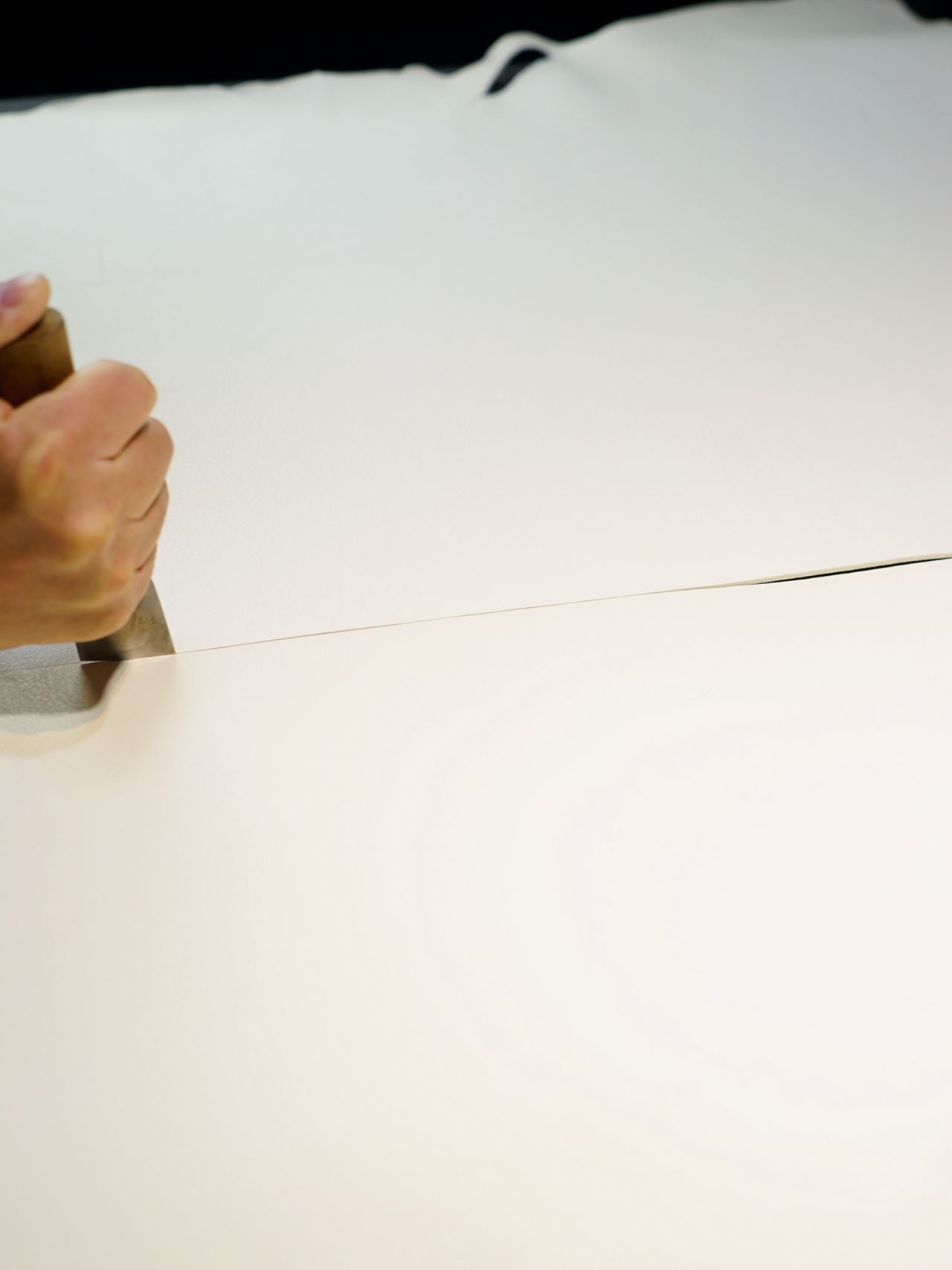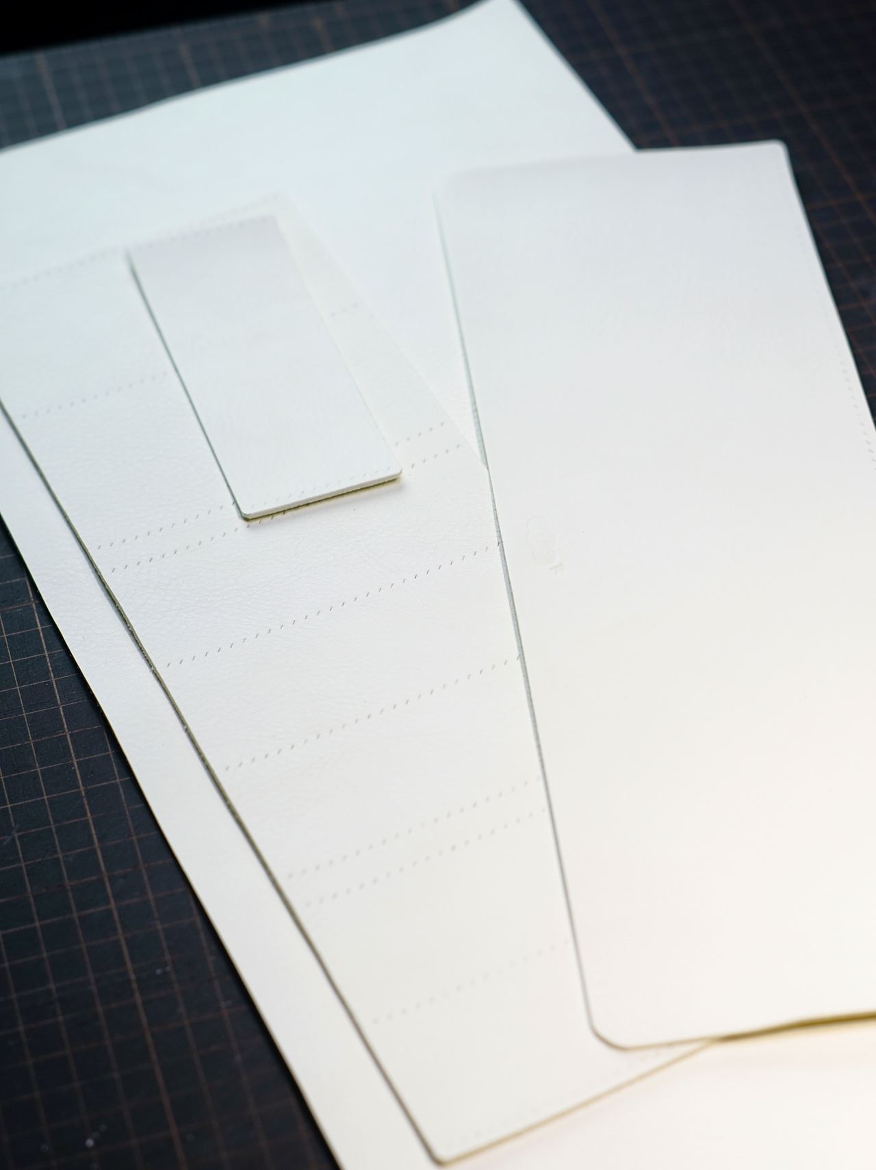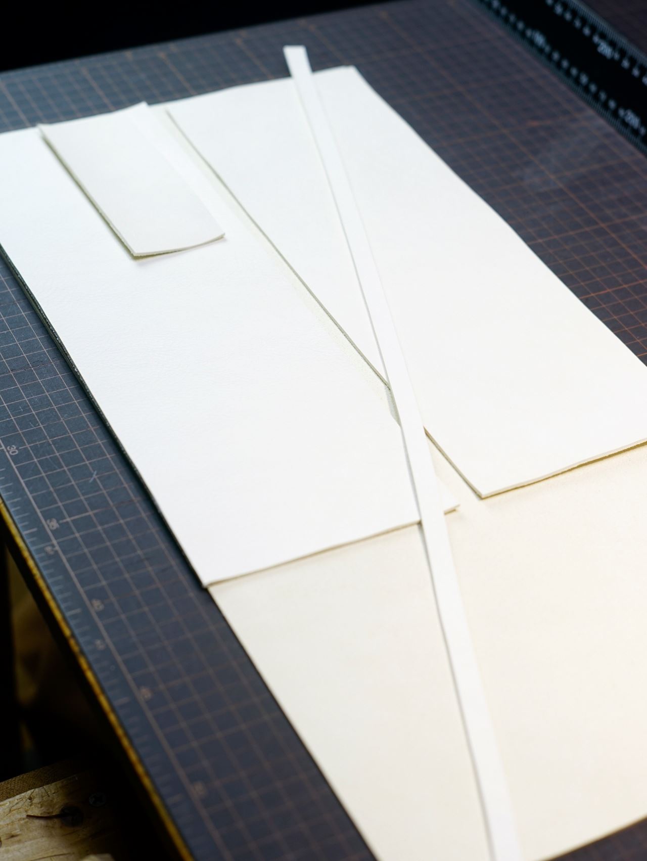 型紙からケガキ線をいれて革包丁で切り出します。雪のように真っ白い革で眩しいです。