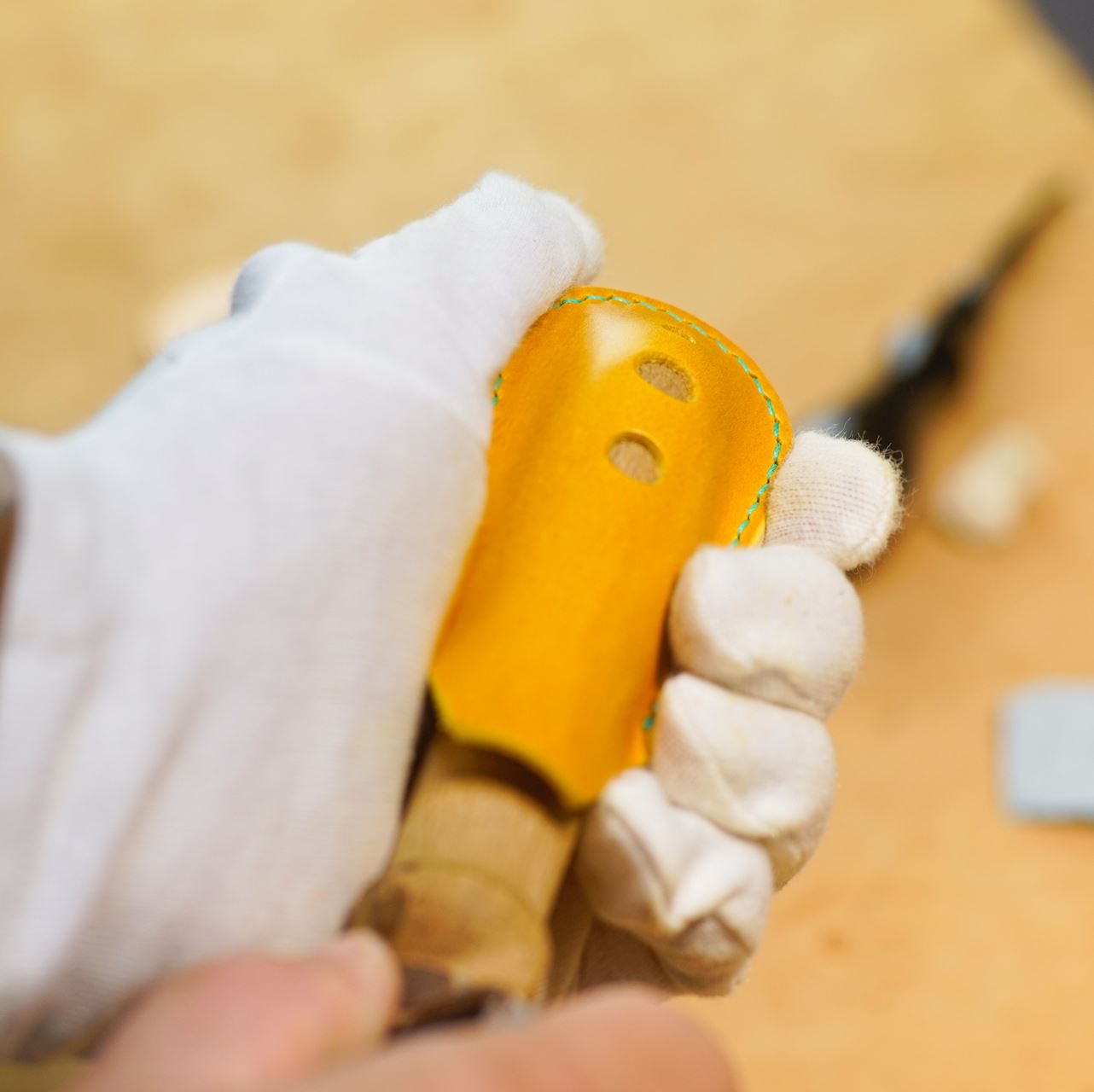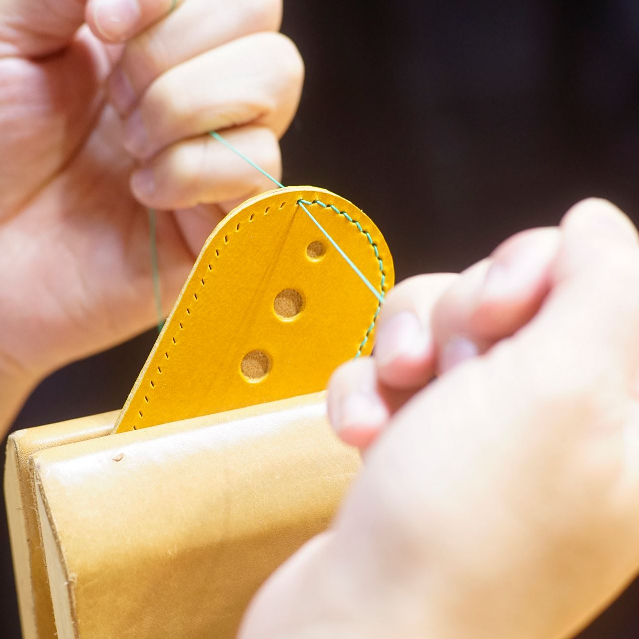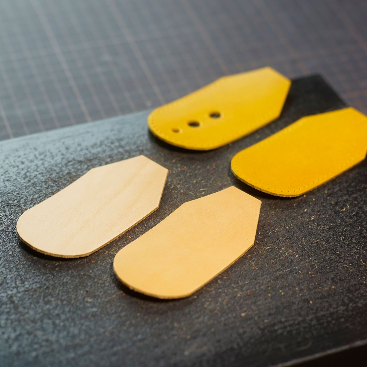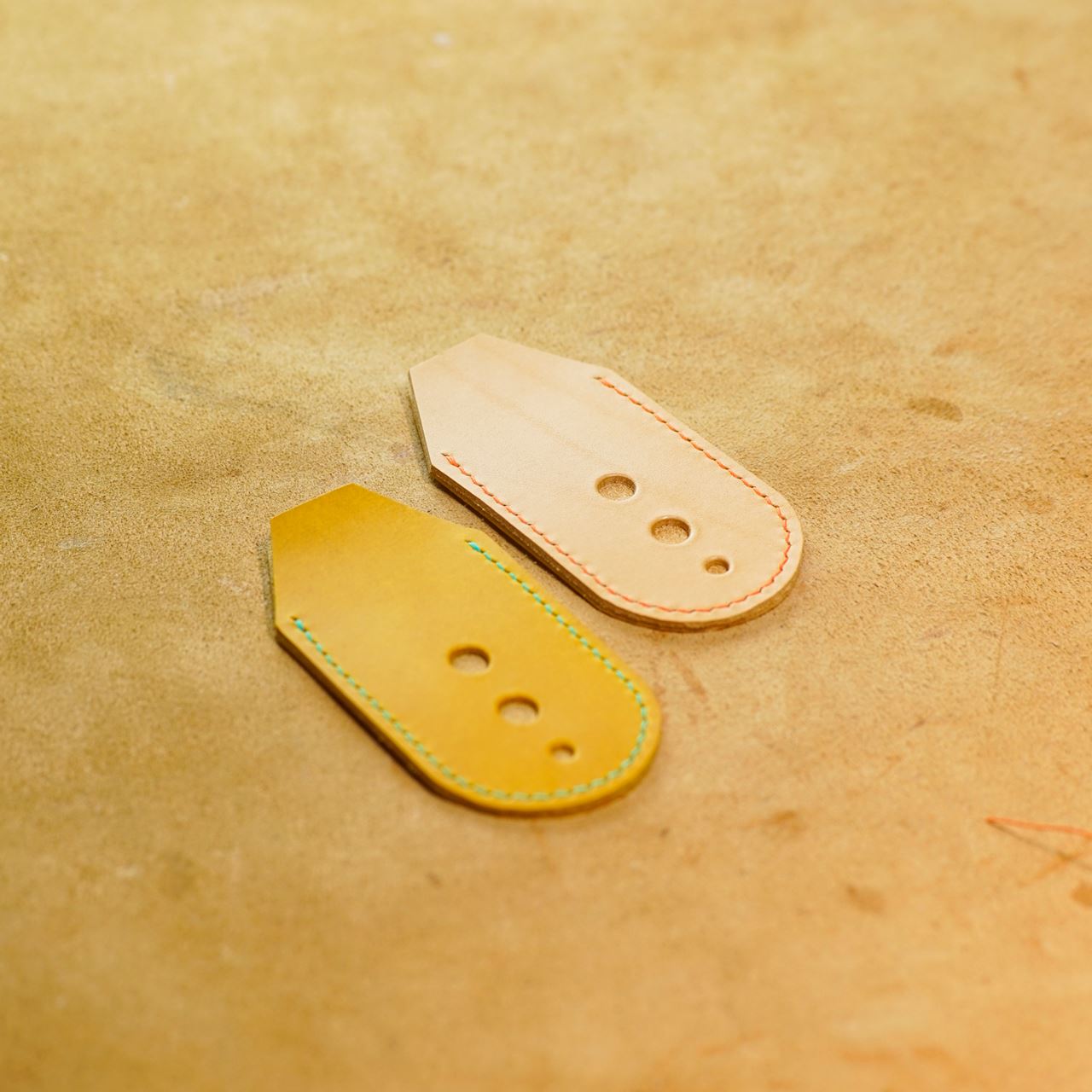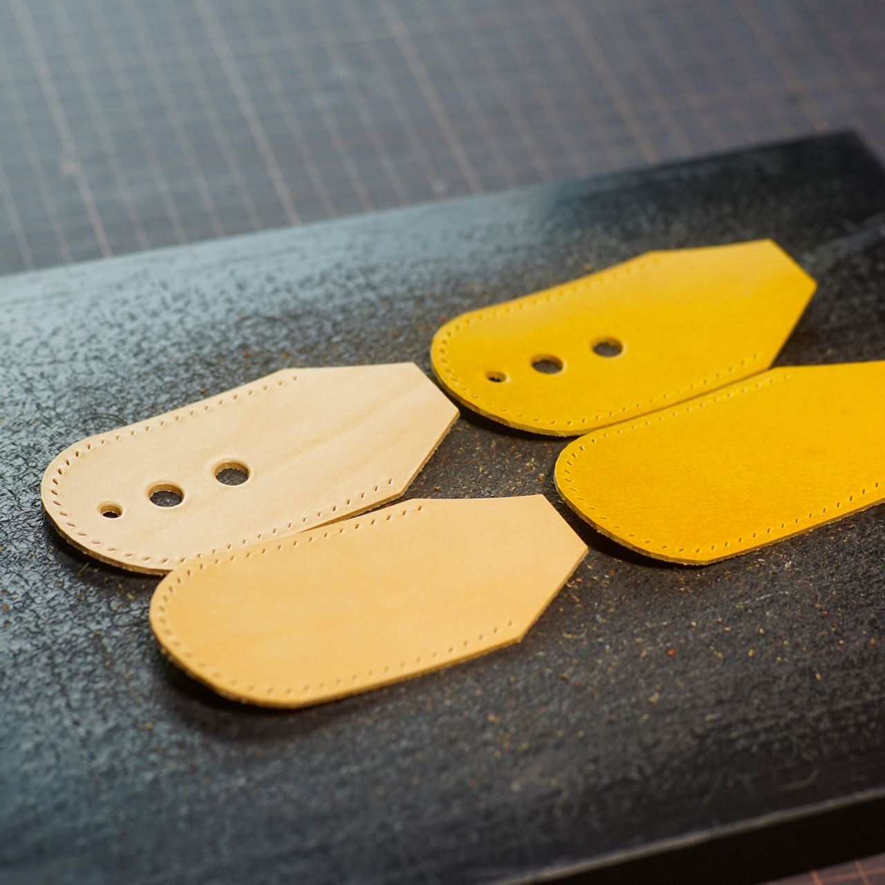 今回は黄と生成りの革でそれぞれ制作します。革をカットしてから目打ちと穴あけをします。