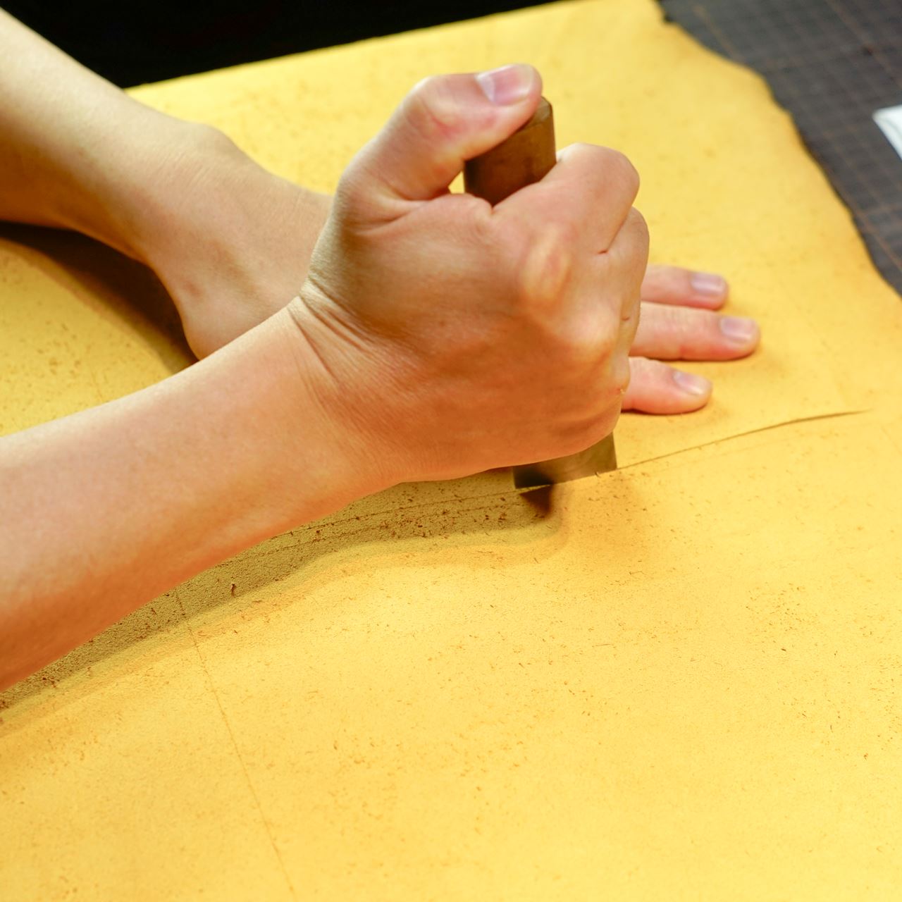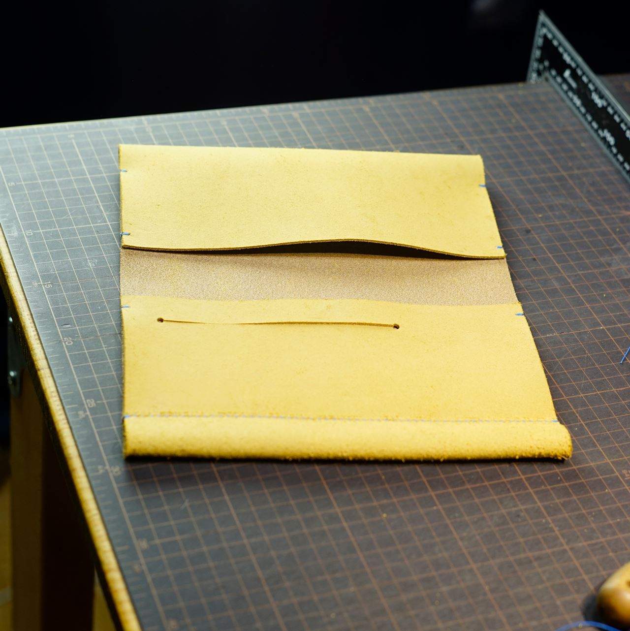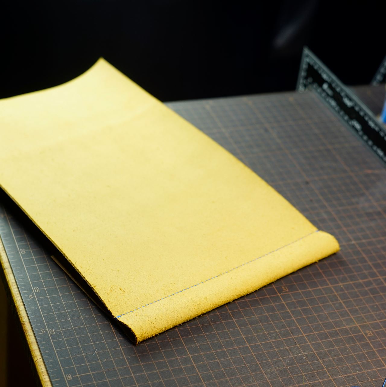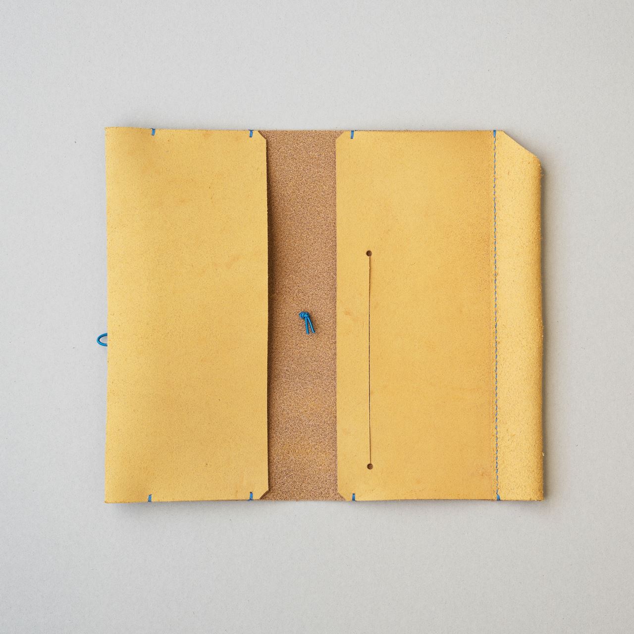 栃木レザーの黄色の床革をカットして、パーツ類を揃えます。カット後に目打ちを施して手縫いの準備を進めます。今回は六花リネン糸の21孔雀の糸でステッチします。