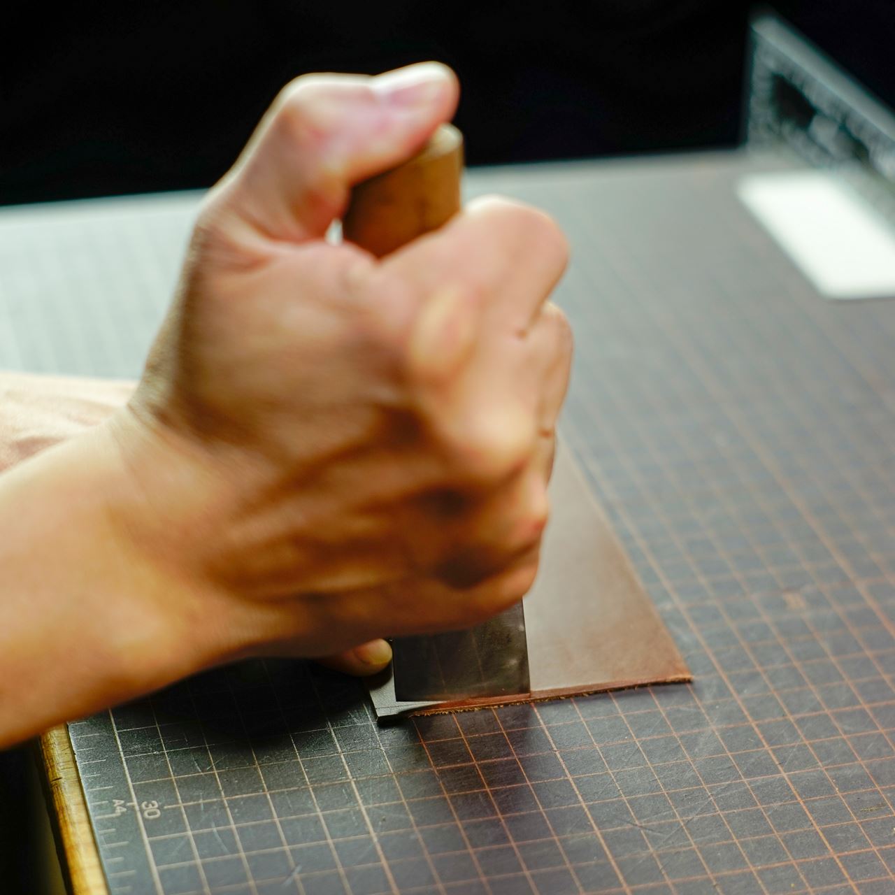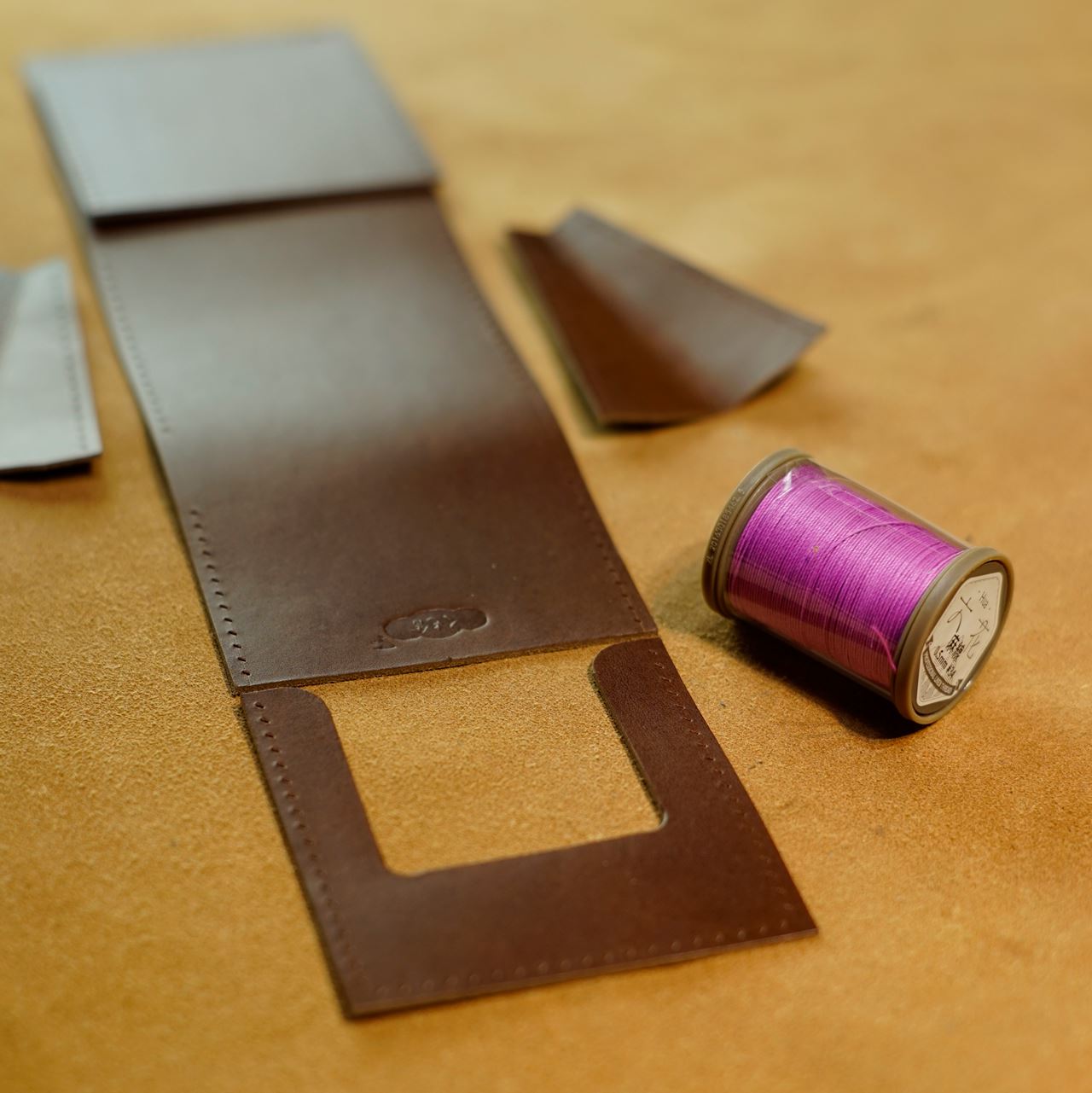 今回使用するのはイタリアンハードのチョコです。型紙から各パーツを切り出して、刻印の打刻と手縫いの目打ちを先に行なっておきます。
