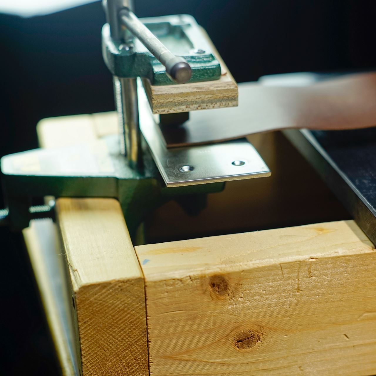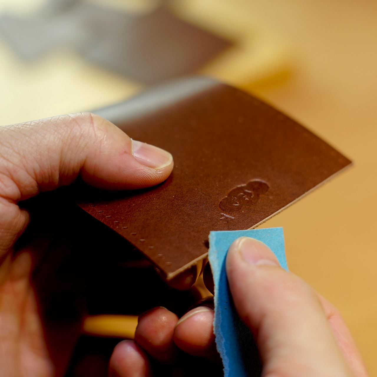 全てのパーツ組上げの前に磨けるコバ(革の断面)は磨いておきます。やすり掛け、ヘチマ磨きを繰り返しながら、コバに丸みを付け、適度な艶を与えます。