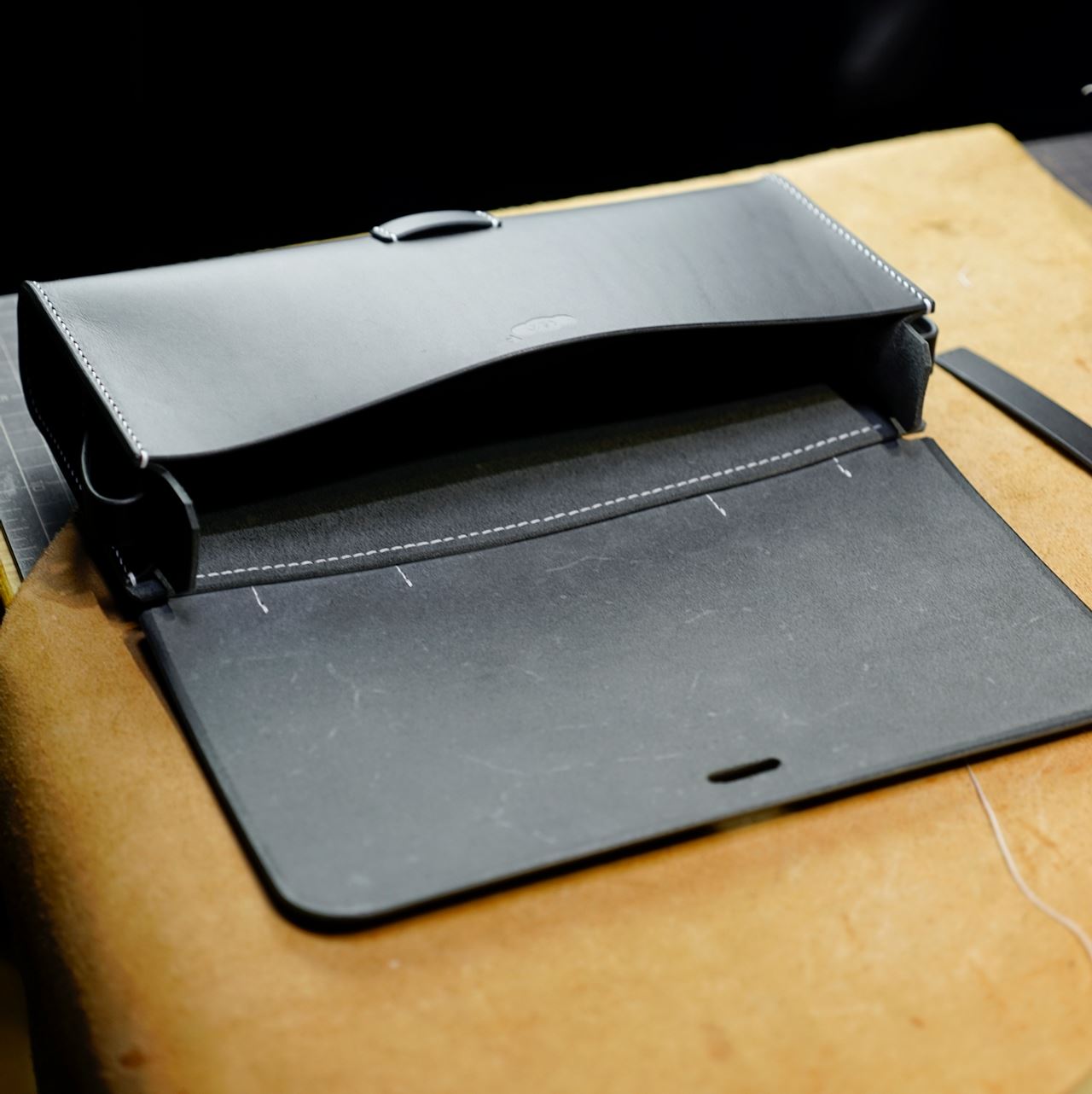 本当にイタリアンハードの黒は艶といい、革のハリ感といい、ビシッとした良い色ですね。柔らかなイメージの耳つきカバンがカッチリと仕上がりました。ステッチとのコントラストも最高です。