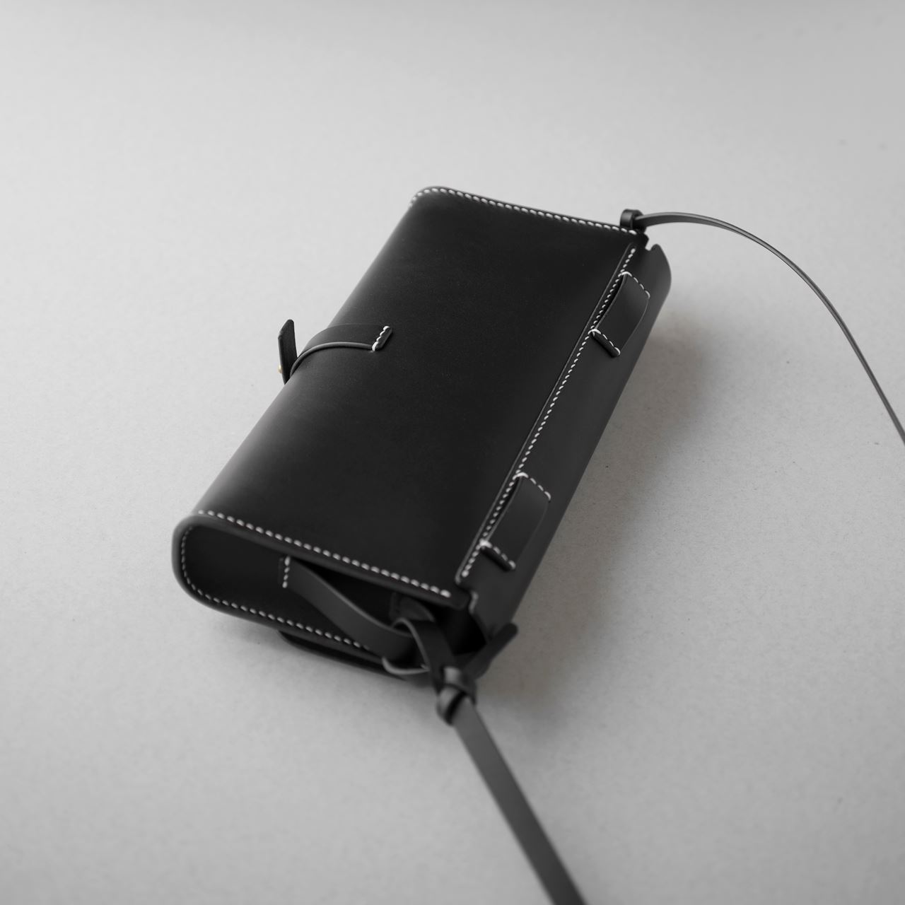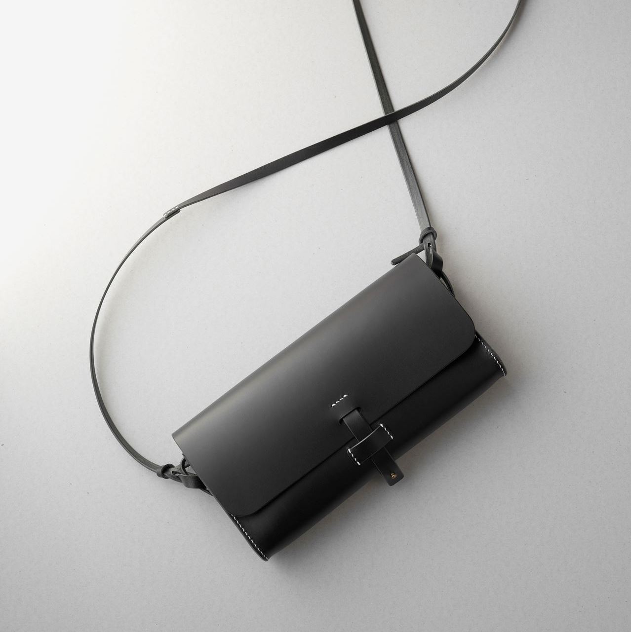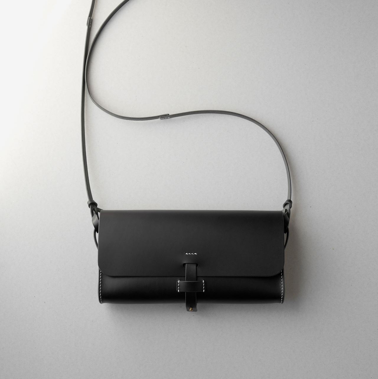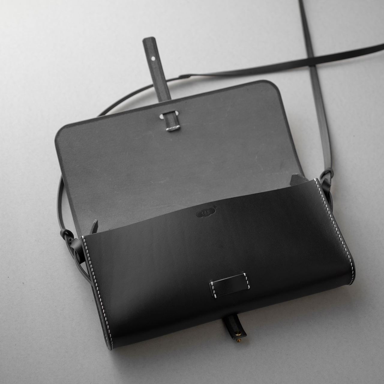 くも舎の耳つき肩かけカバンは、最上級のヌメ革を使用した横長の小さなバッグです。サイズは一般的な長財布や文庫本、携帯電話などが入る大きさです。カバンの側面には大きな耳がついていますので、長いベルトをつければショルダーバッグになります。