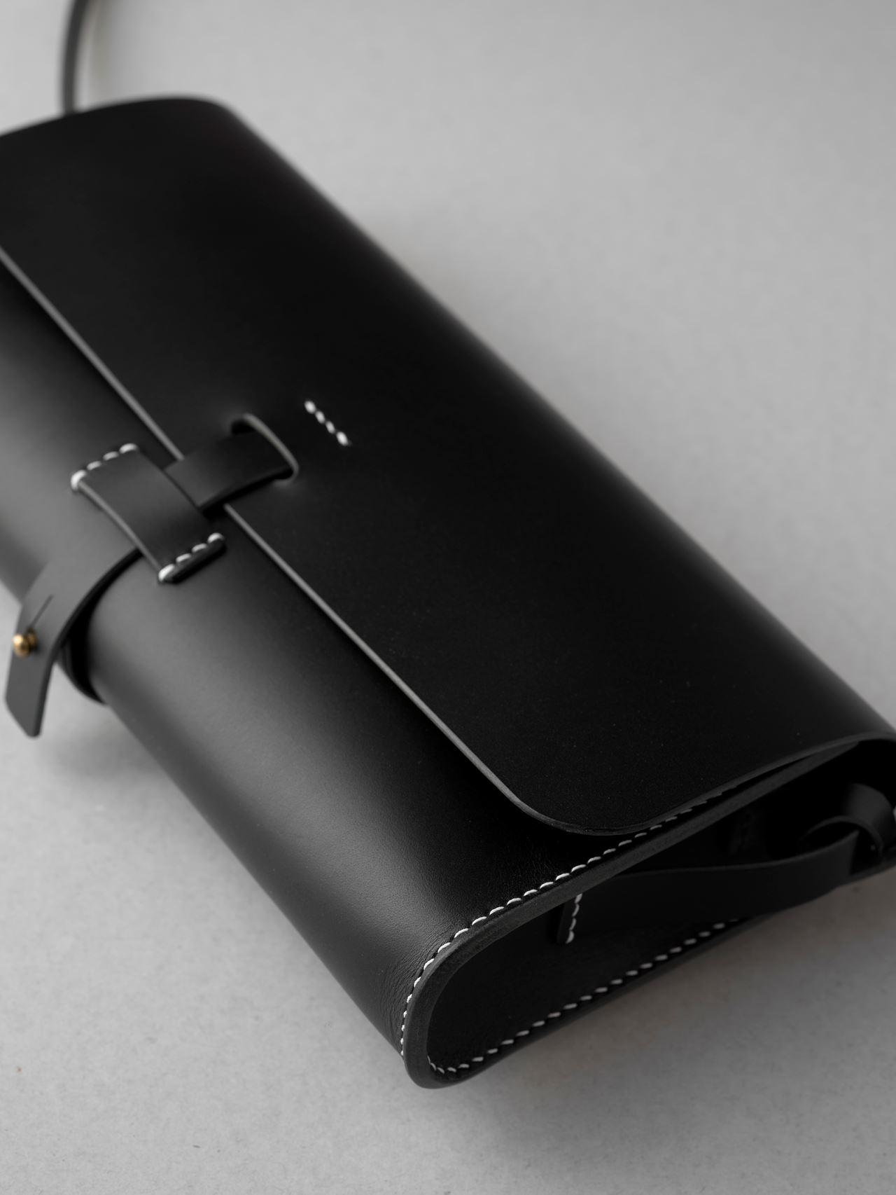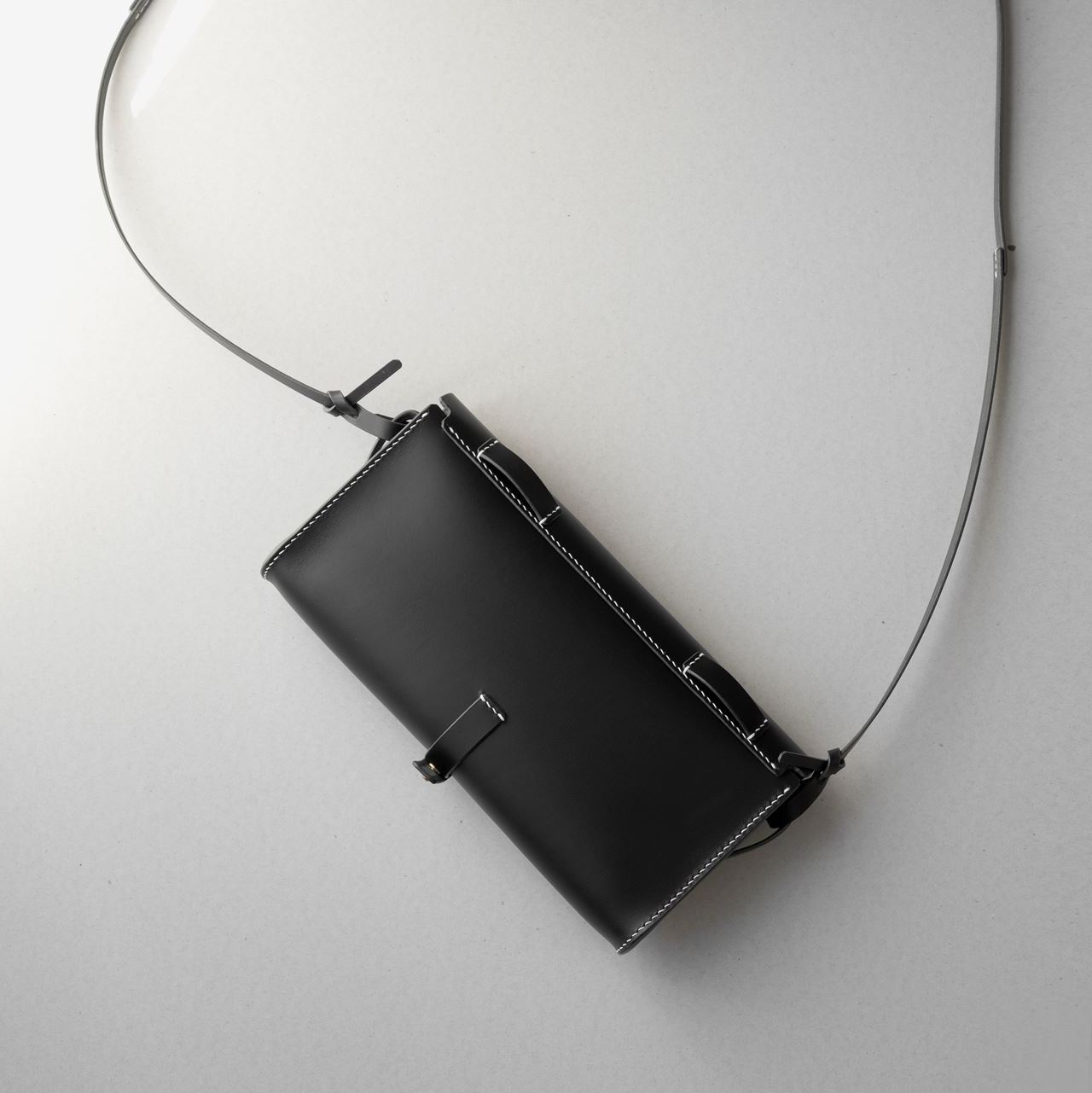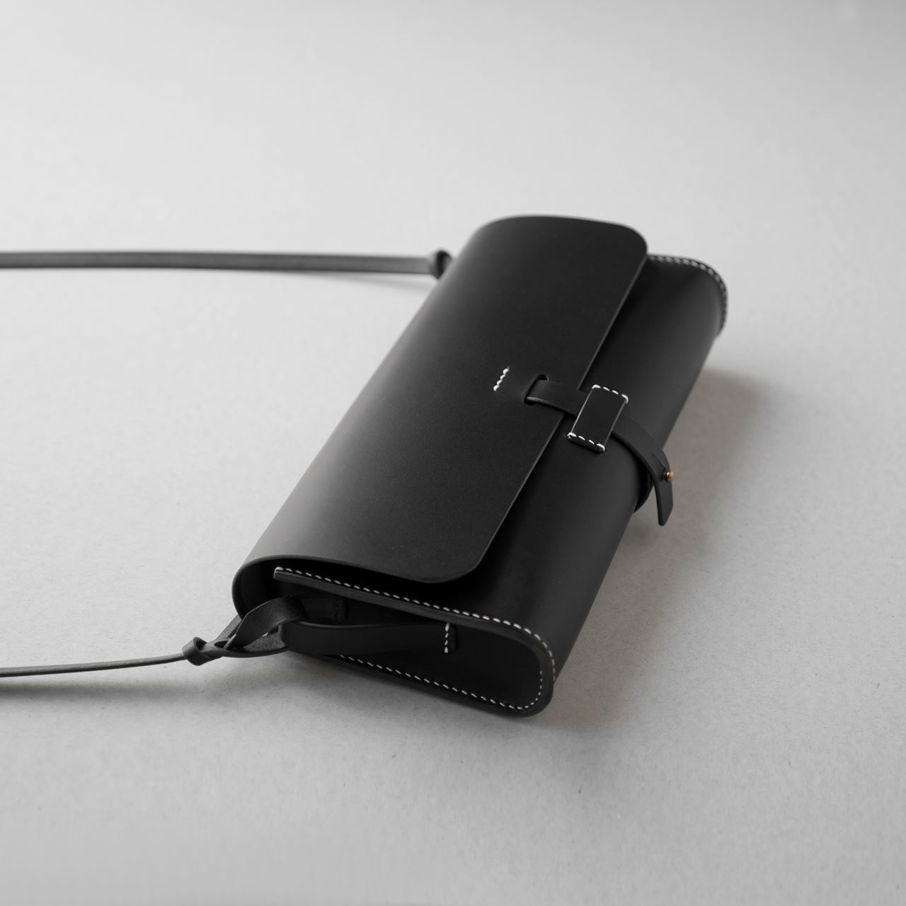 くも舎の耳つき肩かけカバンは、最上級のヌメ革を使用した横長の小さなバッグです。サイズは一般的な長財布や文庫本、携帯電話などが入る大きさです。カバンの側面には大きな耳がついていますので、長いベルトをつければショルダーバッグになります。