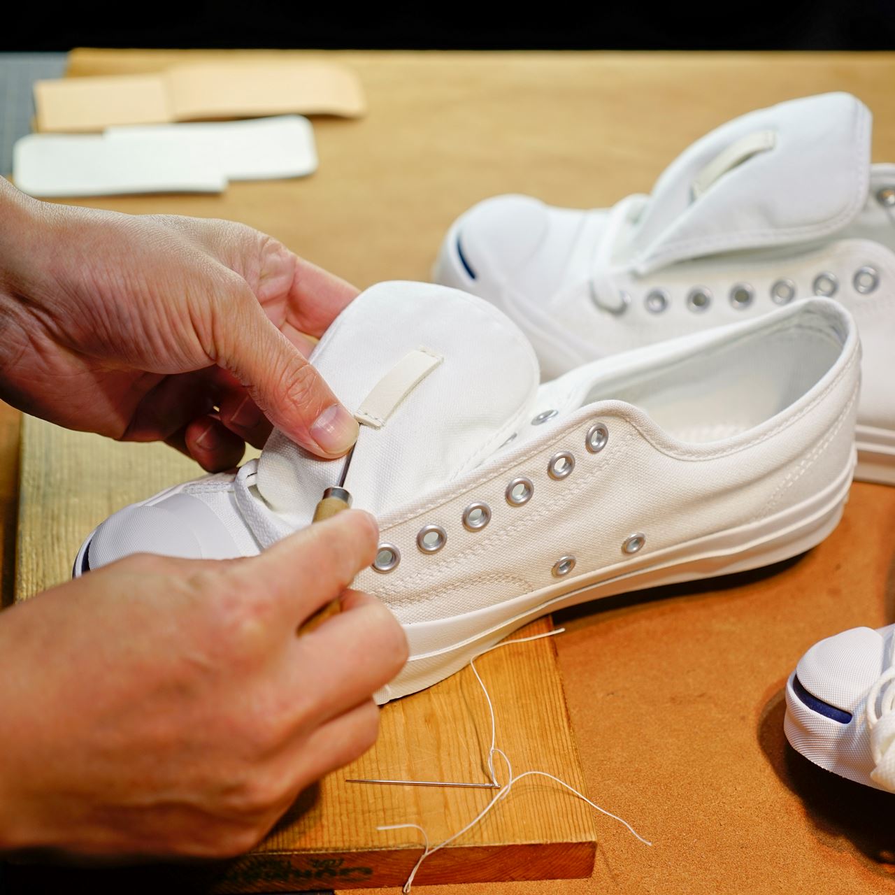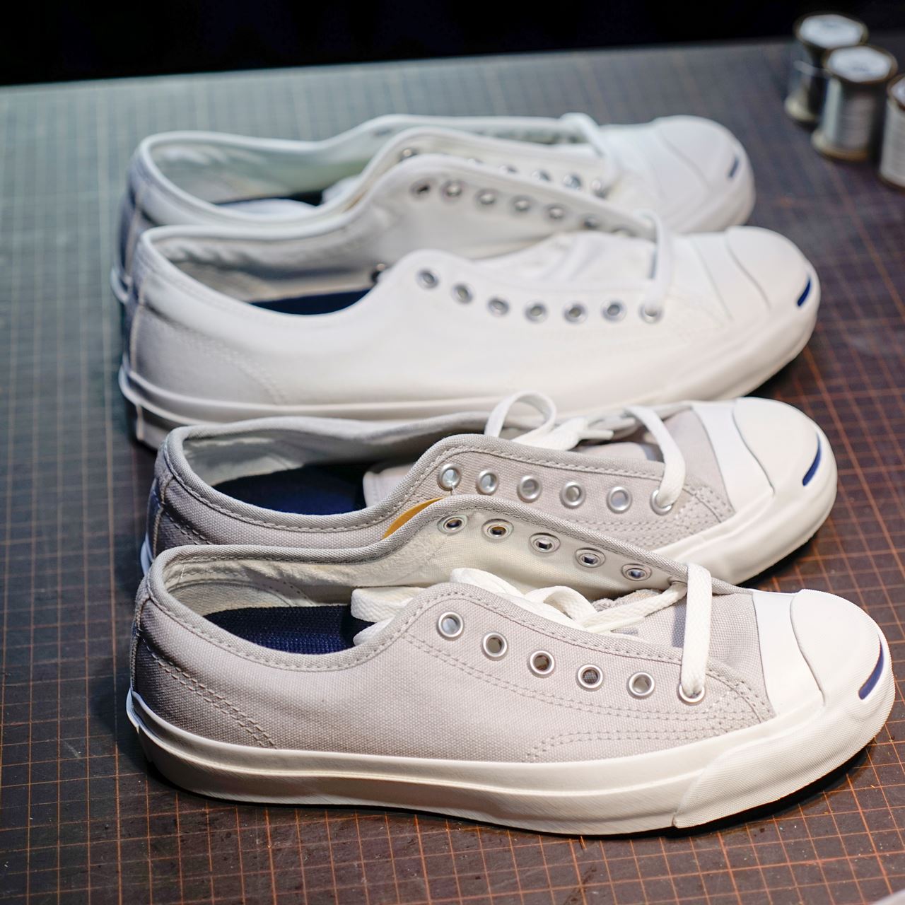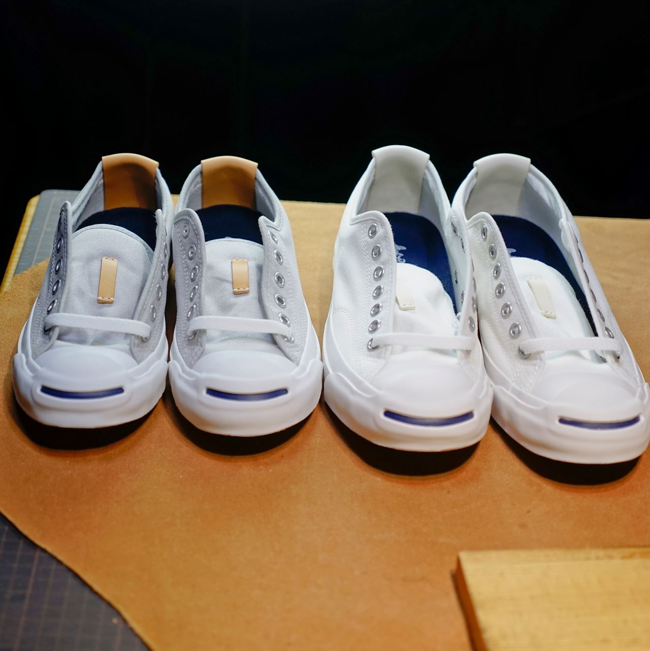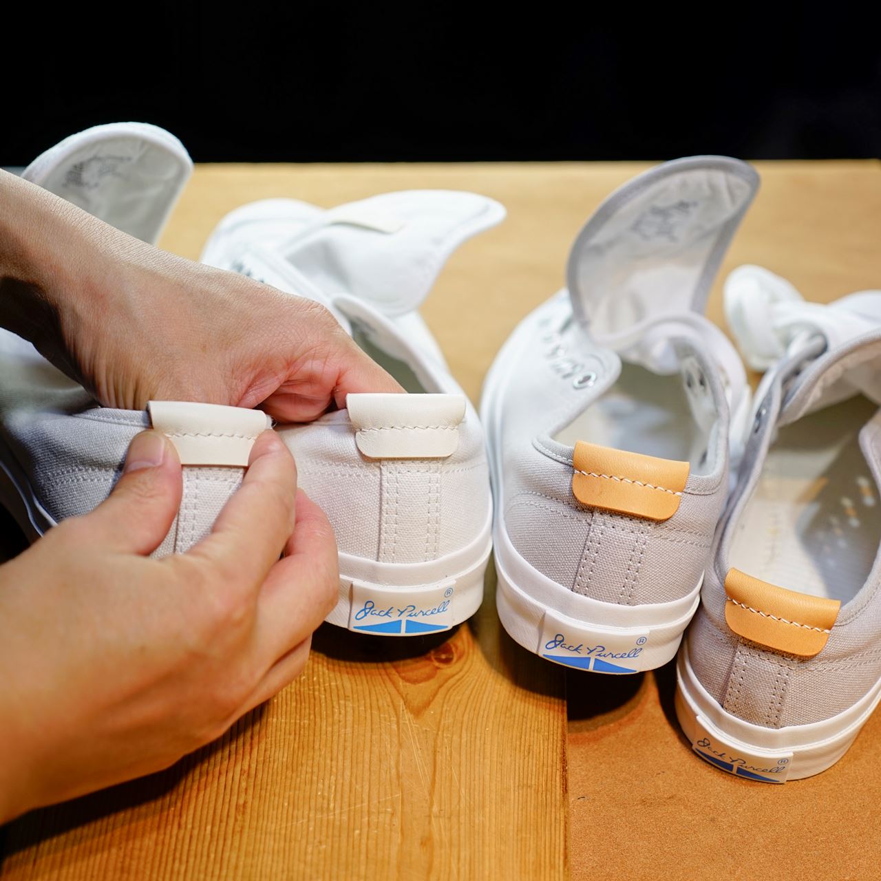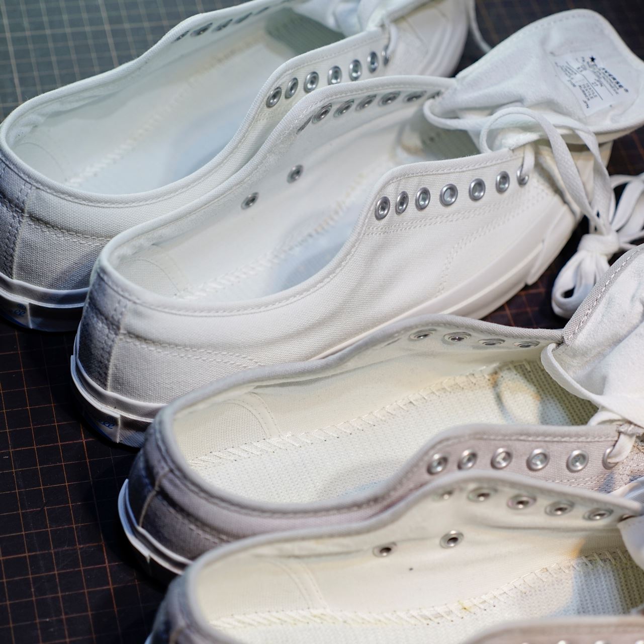 青ひげを2足準備します。一足はキャンバス白、もう一足はライトグレー(銀鼠)です。作業前にインソールを外します。