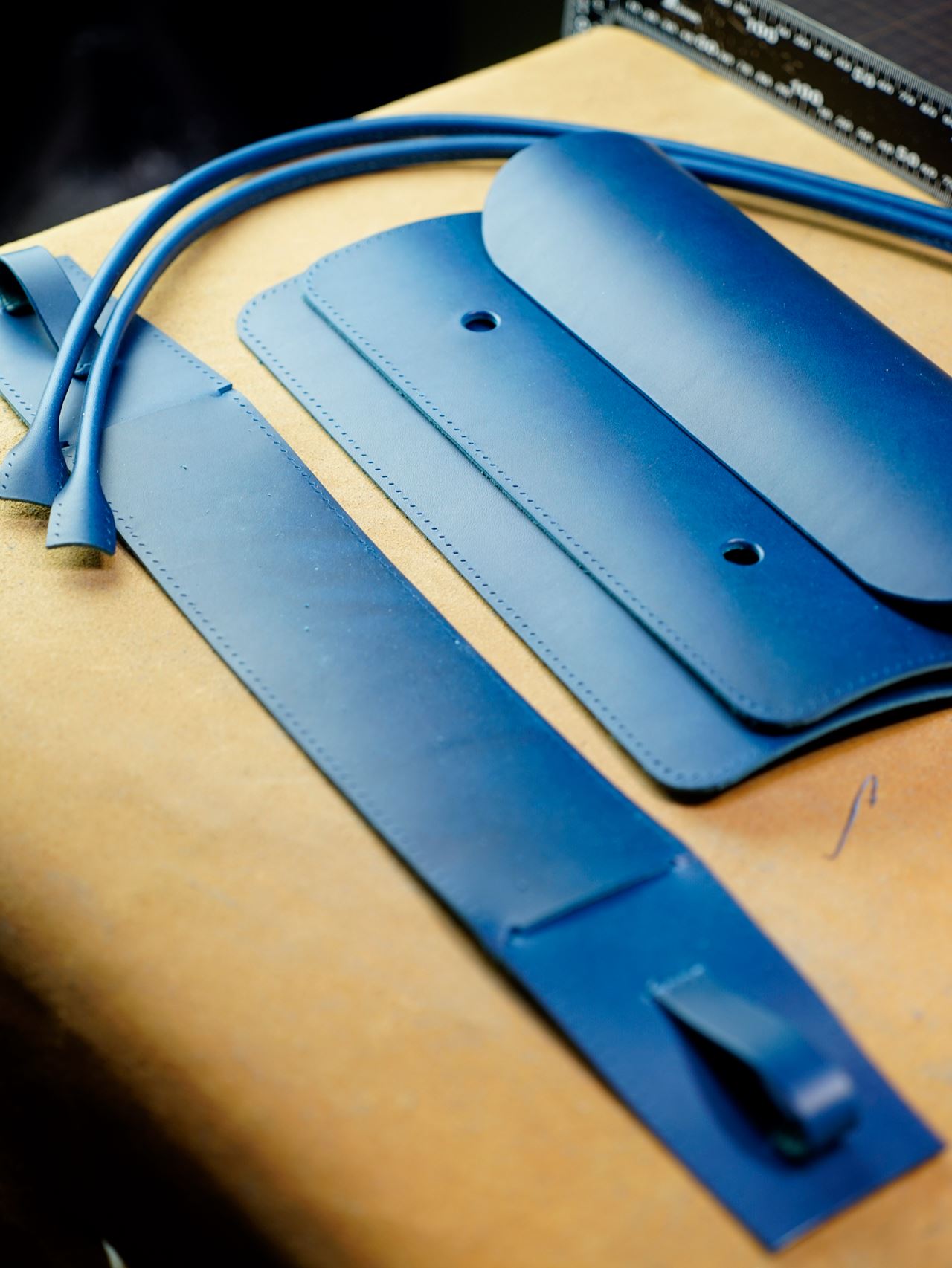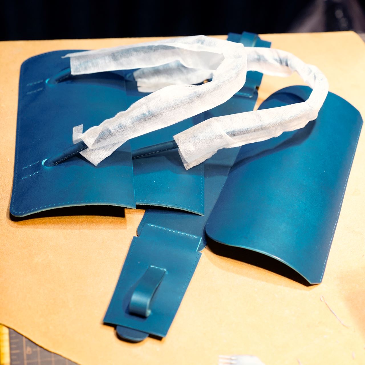だんだんとパーツの仕上げが進んできました。持ち手パーツに養生をして本体パーツに縫い付けます。