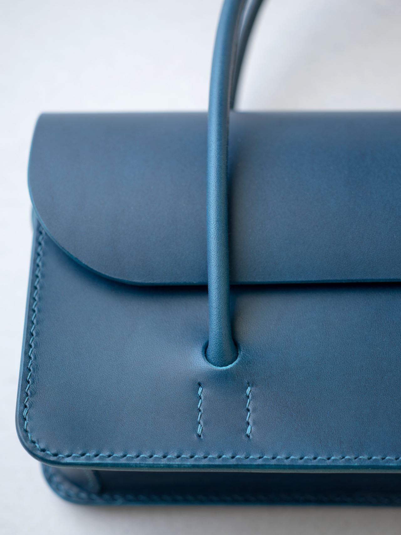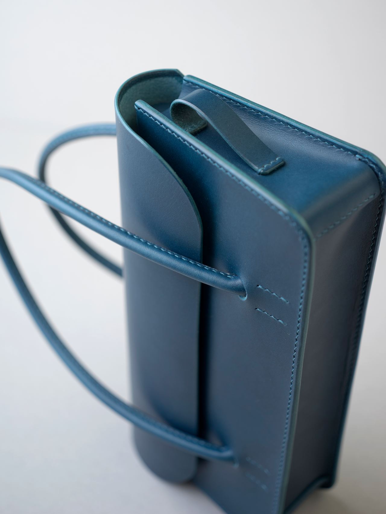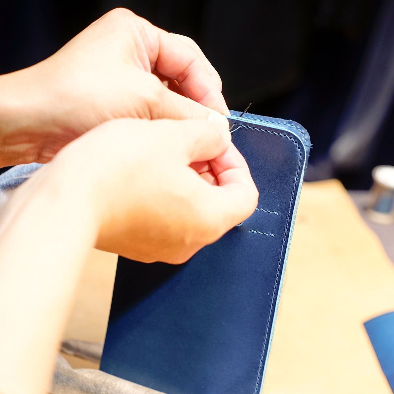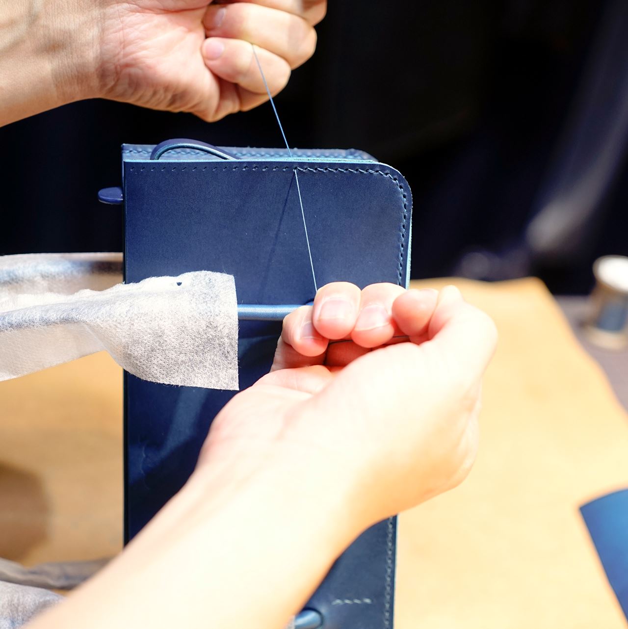 カバン本体の手縫い作業です。マチのパーツを立体的に仕上げていくと箱のような形ができ上がります。
