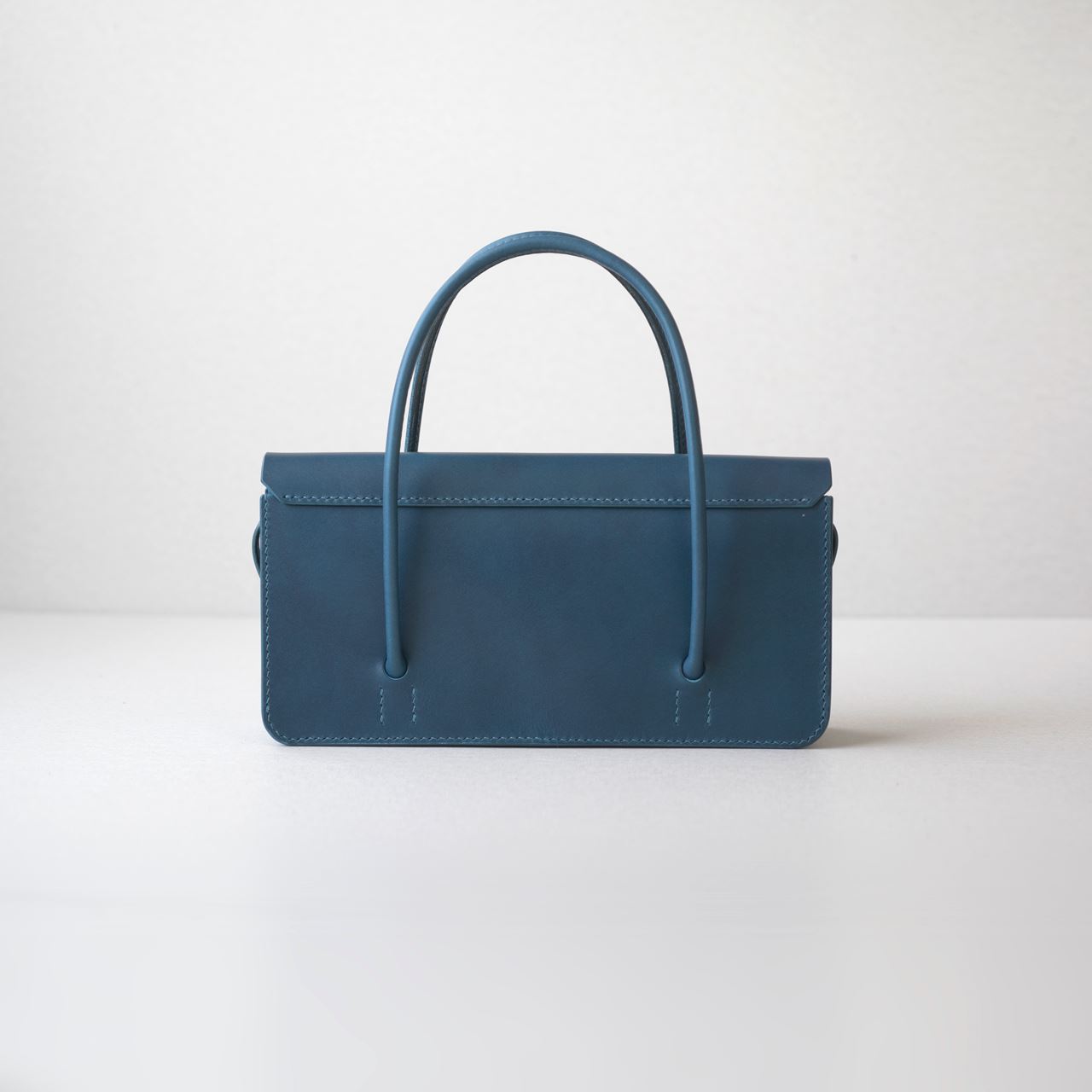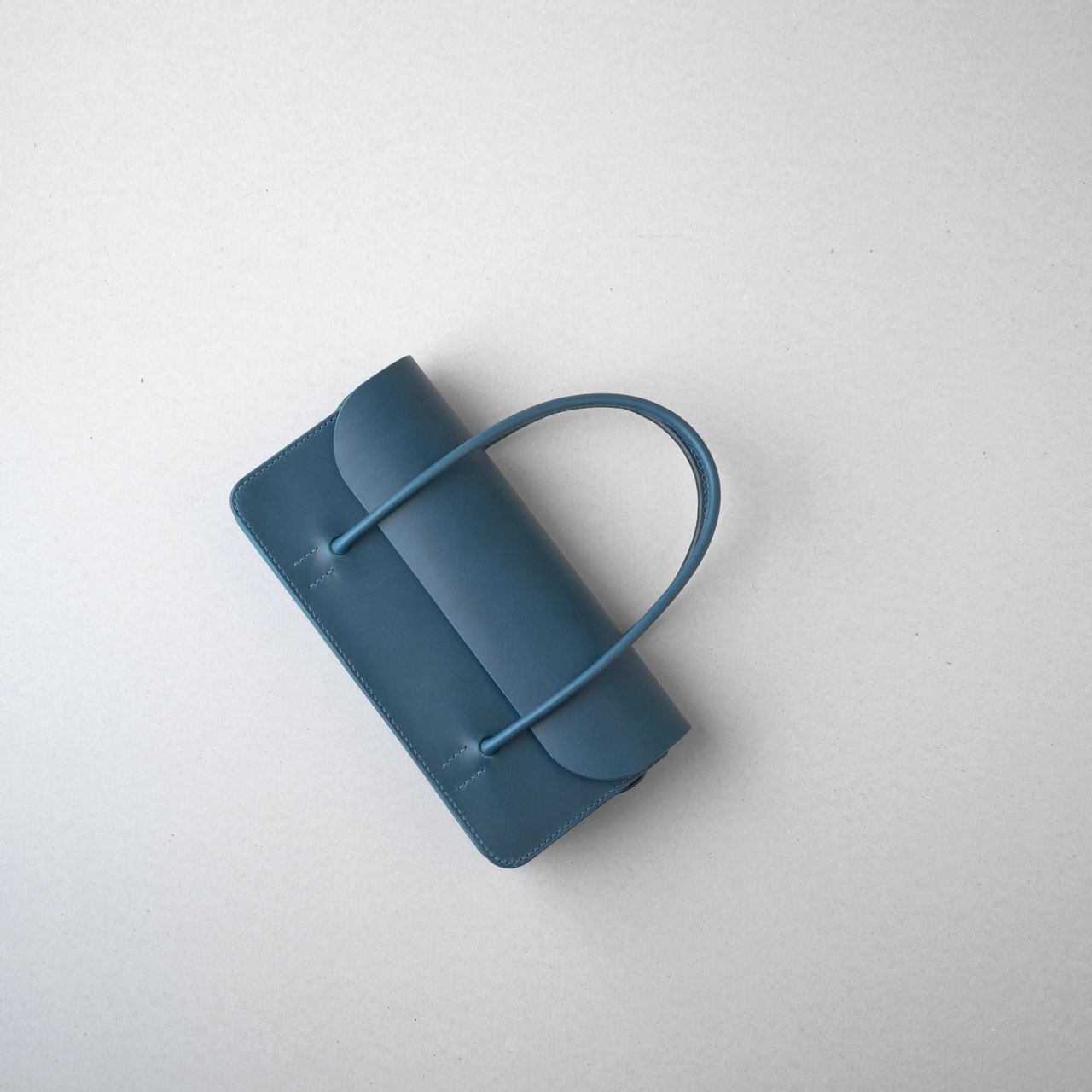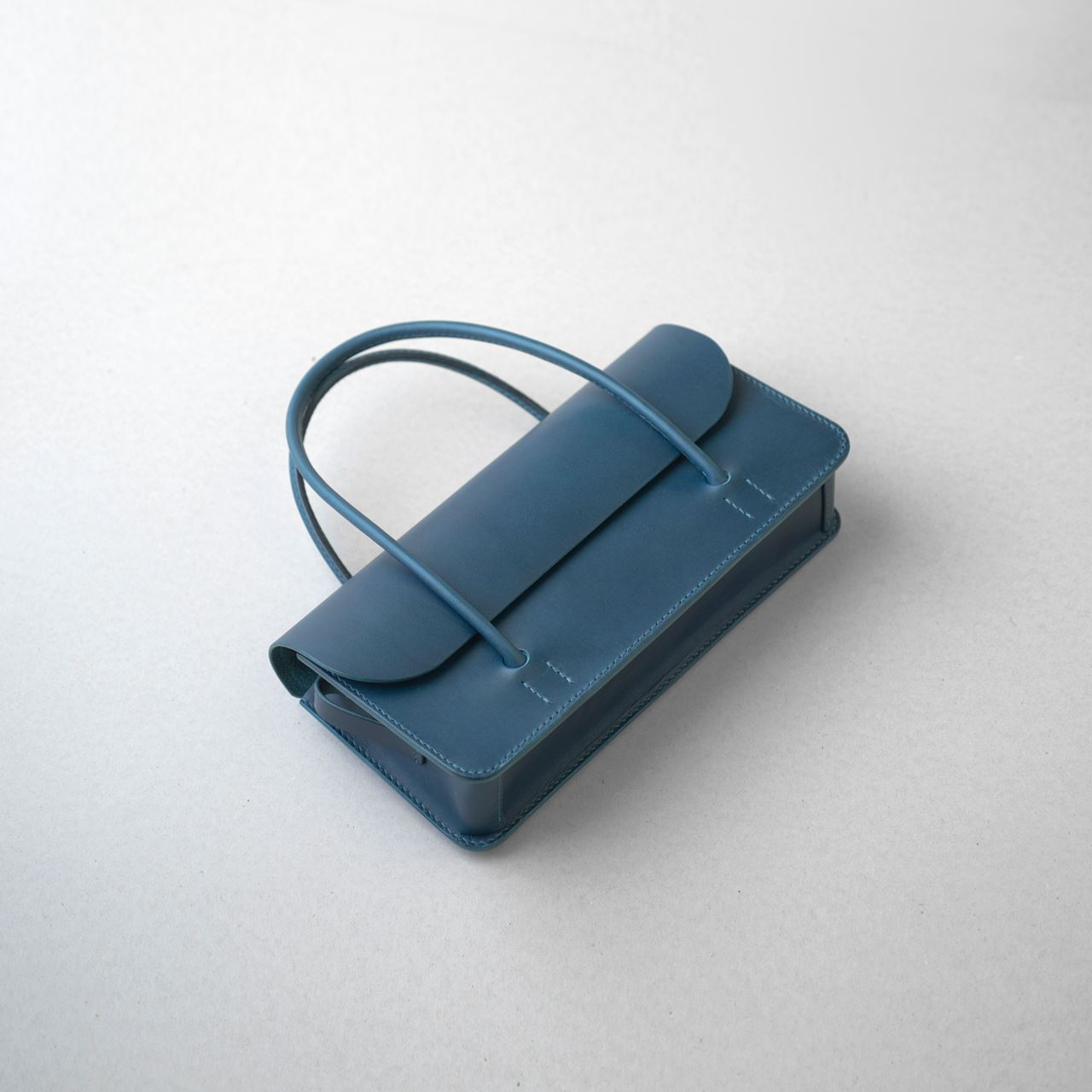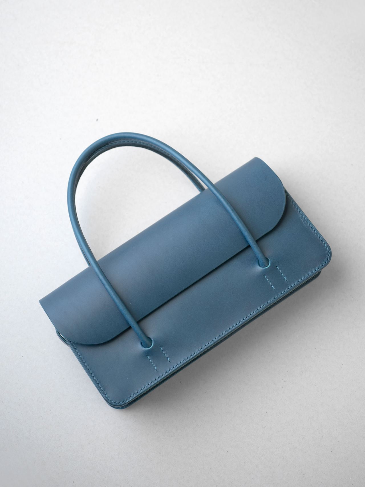 厚手の植物タンニン鞣し革と麻糸の手縫いでつくった、横長の小さな手さげカバンです。サイズは一般的な長財布や文庫本、携帯電話などが入る大きさです。