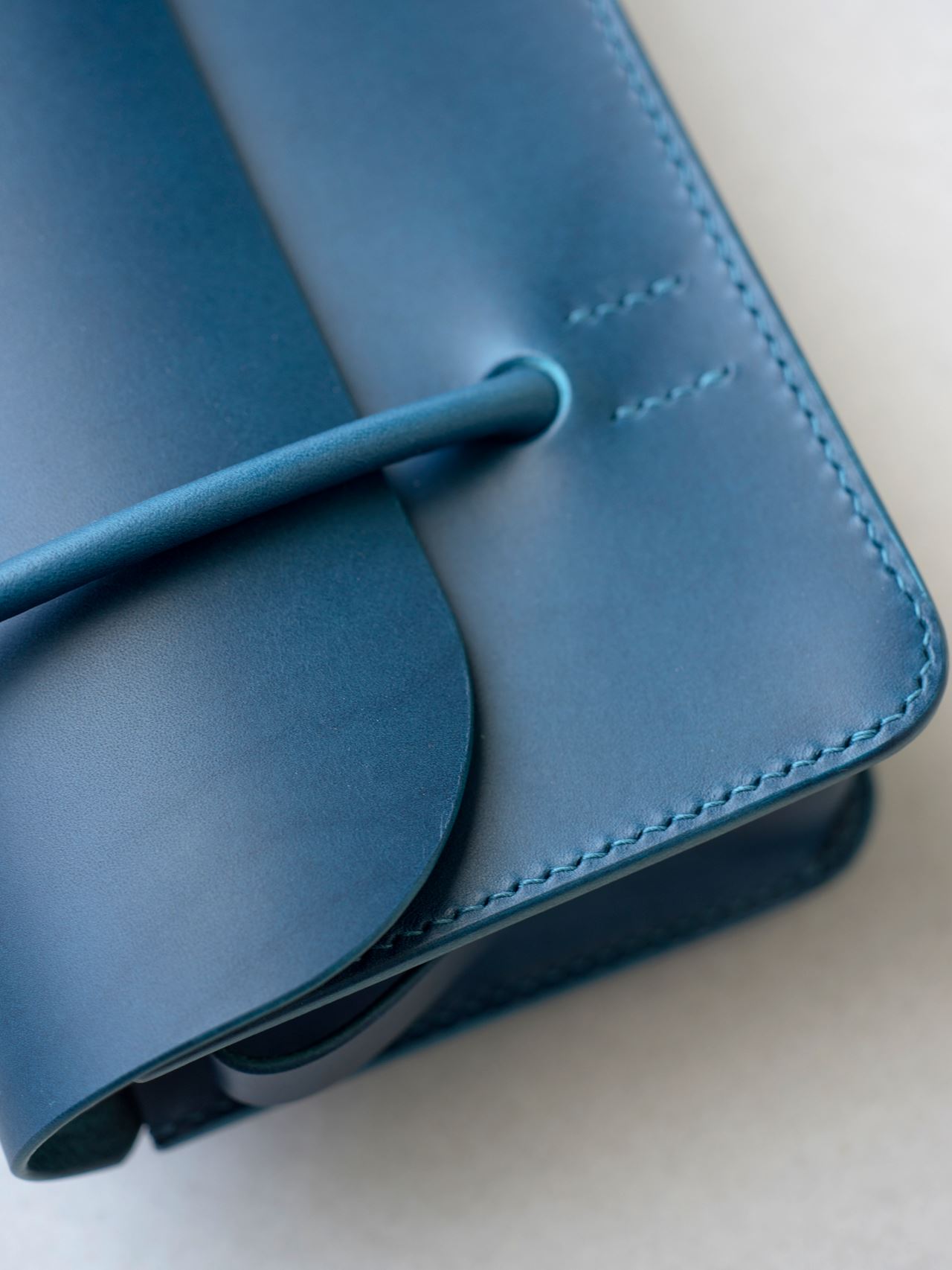 手縫いした合わせ面のコバ(革の断面)を綺麗に仕上げます。ヘリ落とし→やすり掛け→ヘチマ磨きを何回か繰り返して滑らかなコバにしていきます。コバが仕上がったら最後にかぶせ蓋の縫い付けを行います。