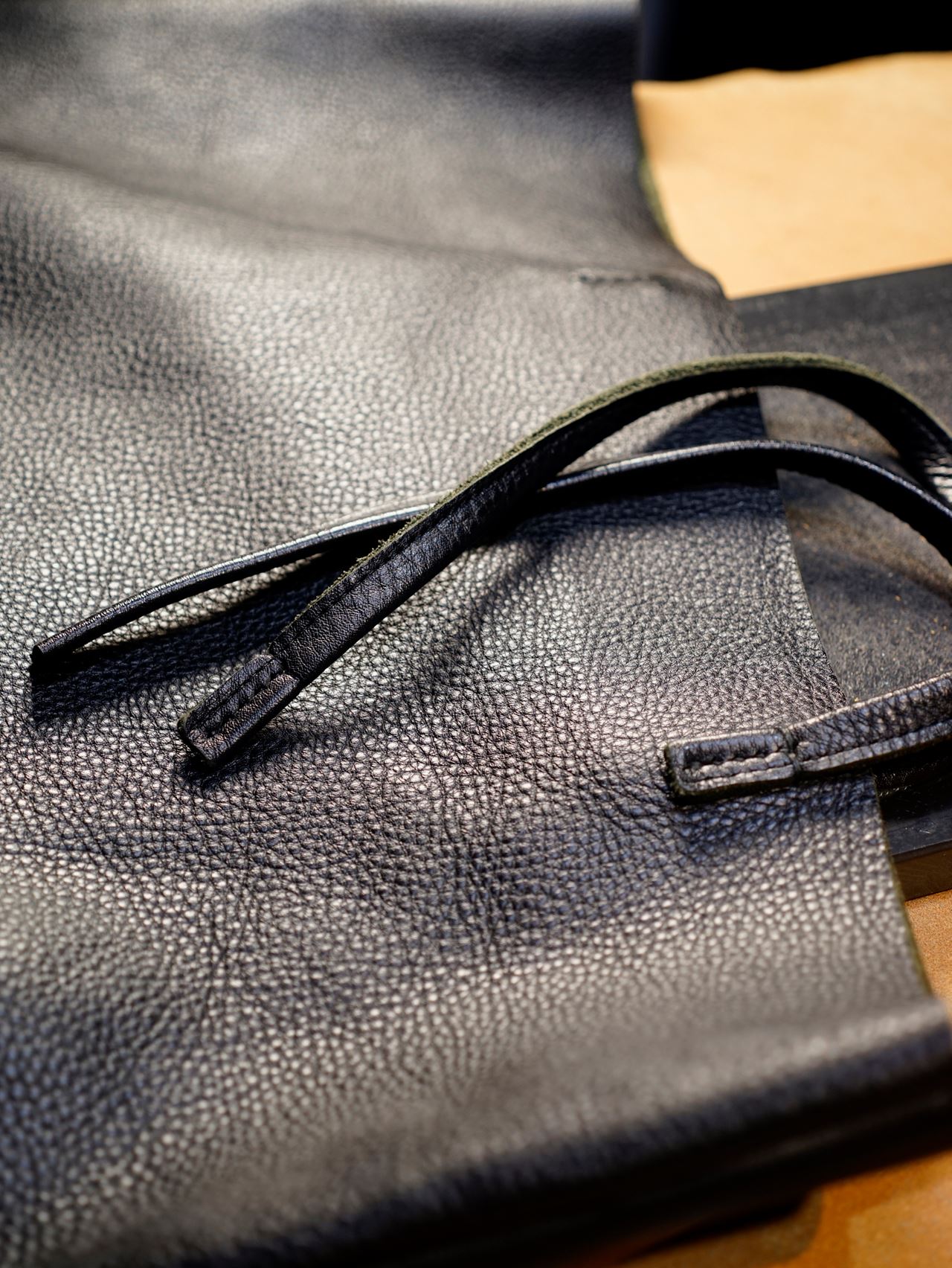 トートバッグ業務型SLは、タフな扱いにも耐えられるよう、水・汚れ・傷に強くて柔らかい、クローム鞣しのシボ革を使用したシンプルなトートバッグです。沢山の道具を放り込めるようマチも大きく、B4ファイルが横にすっぽり入る大きさになっています。