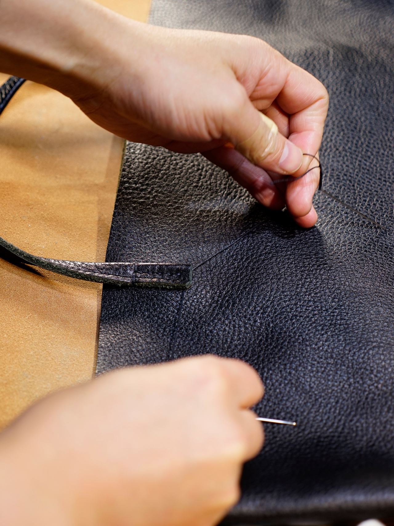 持ち手に印をつけて片側だけ手縫いのステッチを解きました。6cmほど短く詰めて目打ち→手縫いで元の位置に。