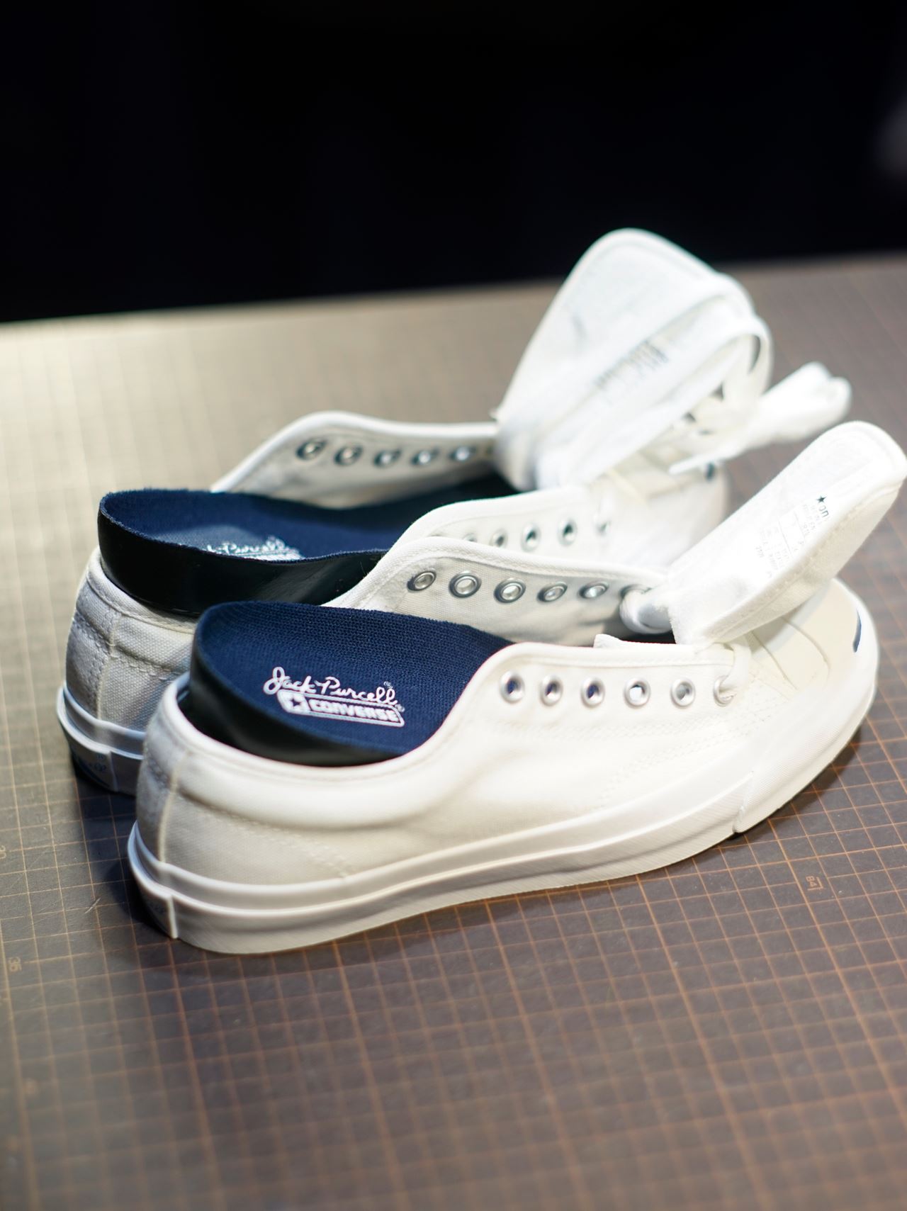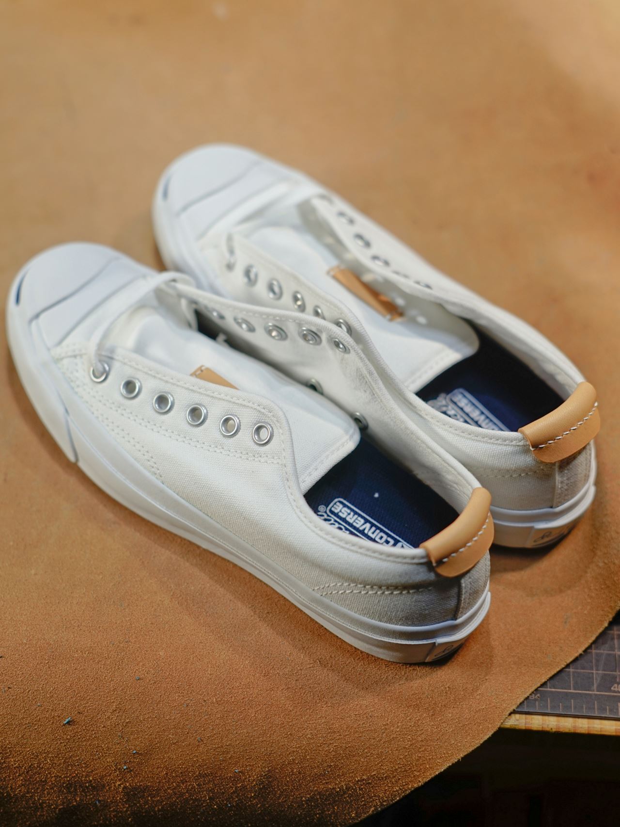 青ひげを2足準備します。一足はキャンバス白、もう一足はライトグレー(銀鼠)です。作業前にインソールを外します。