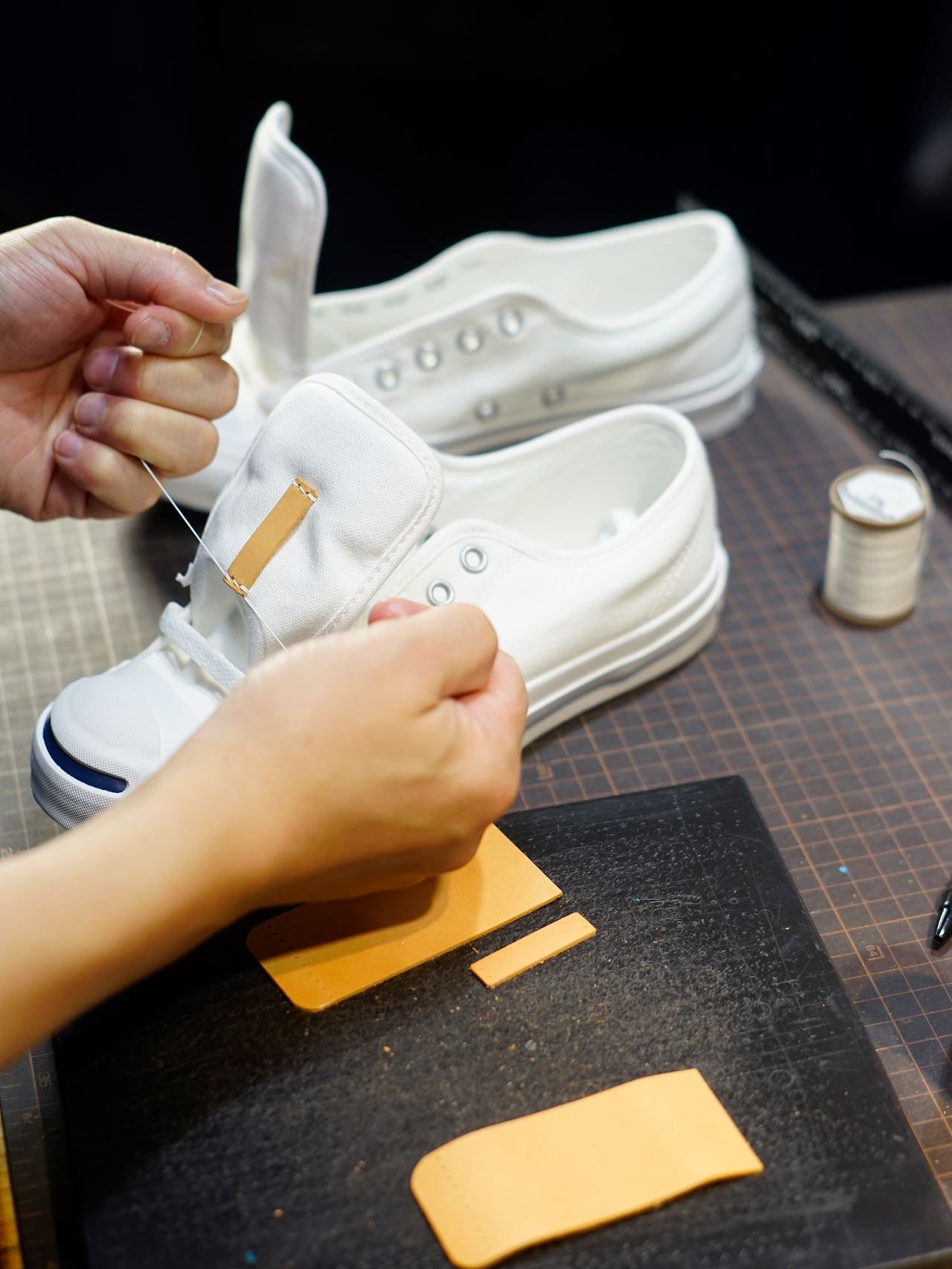 生成り革を縫い付けます。ベロの落ち込みを防ぐベルトループとかかとのパーツを手縫いします。