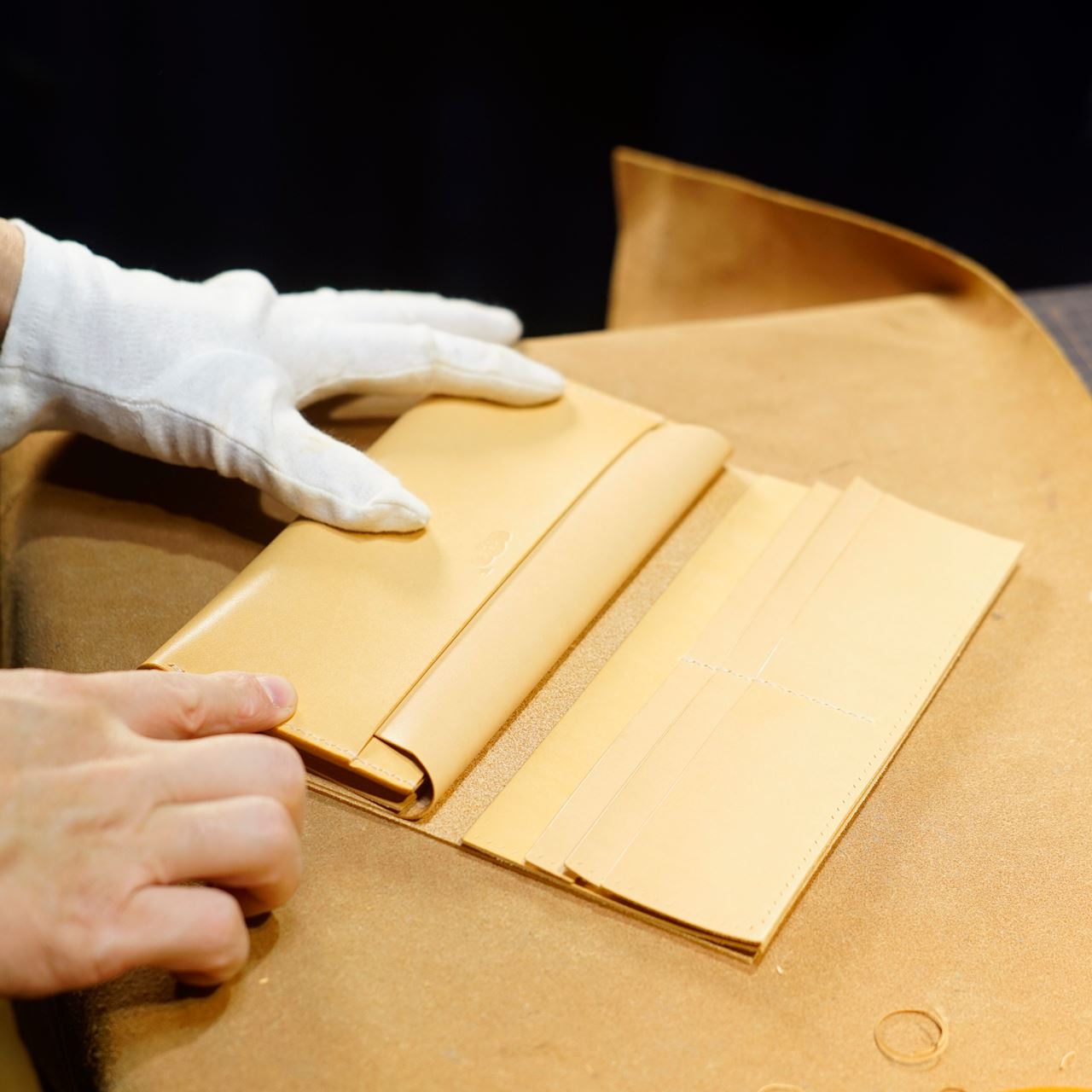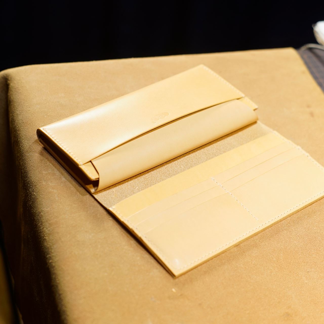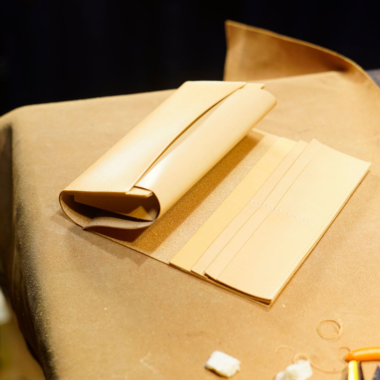 パーツを仮合わせして、おおまかな財布のイメージをチェックします。すべて生成り革というのも新鮮です。