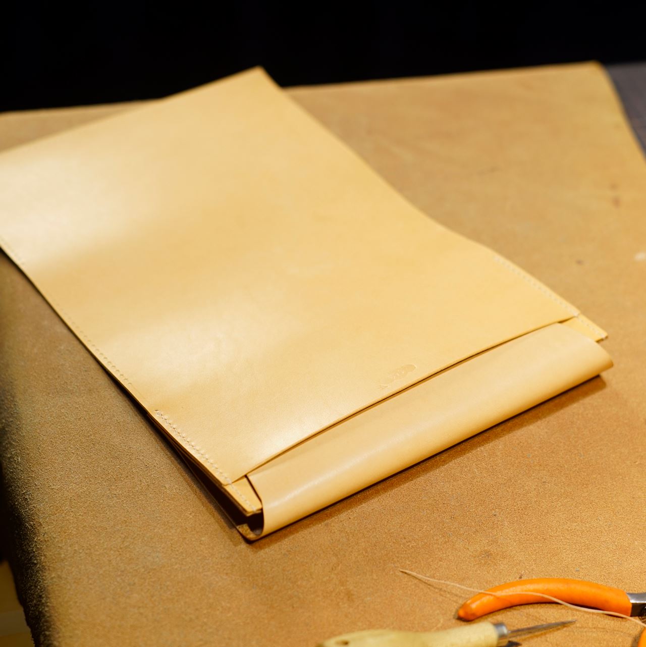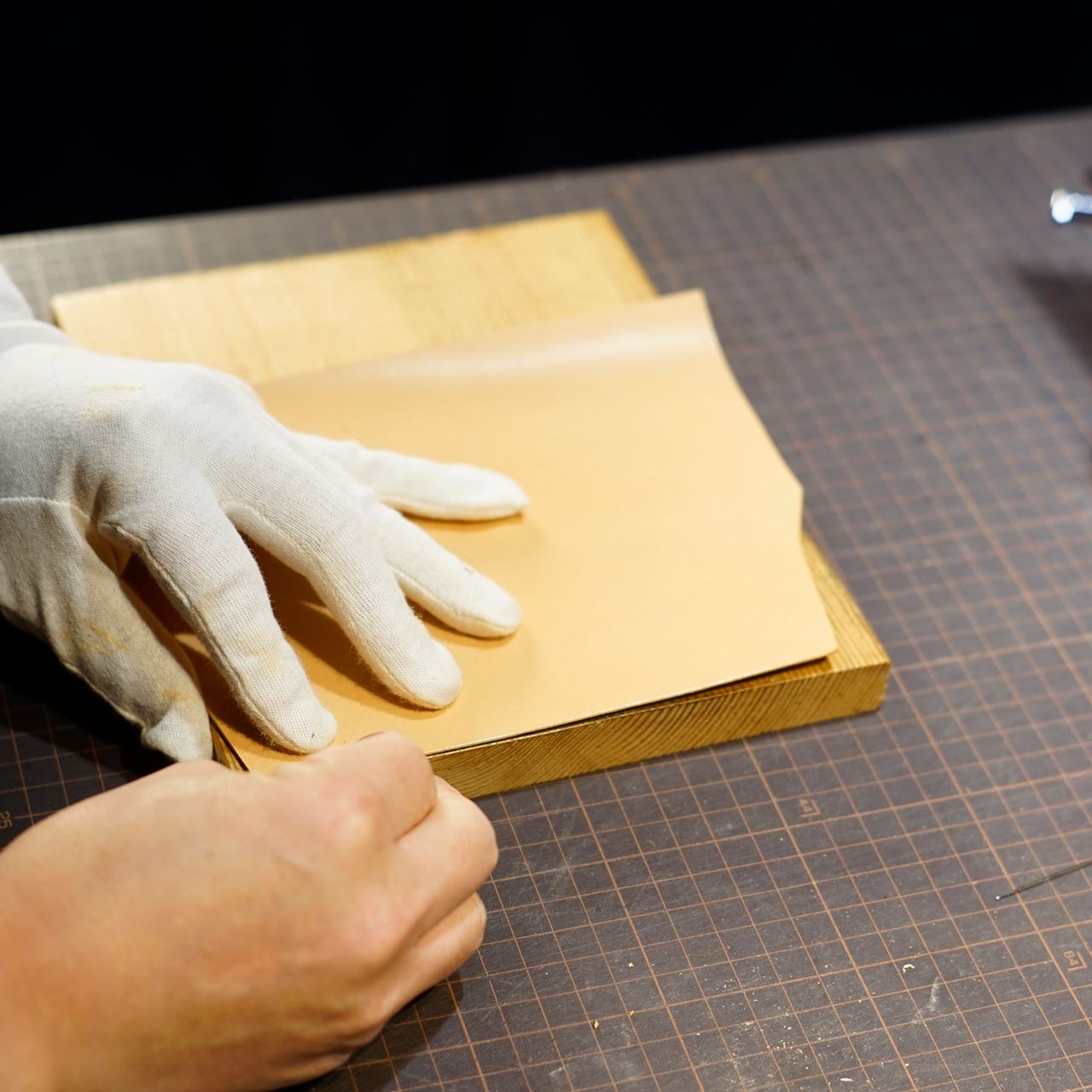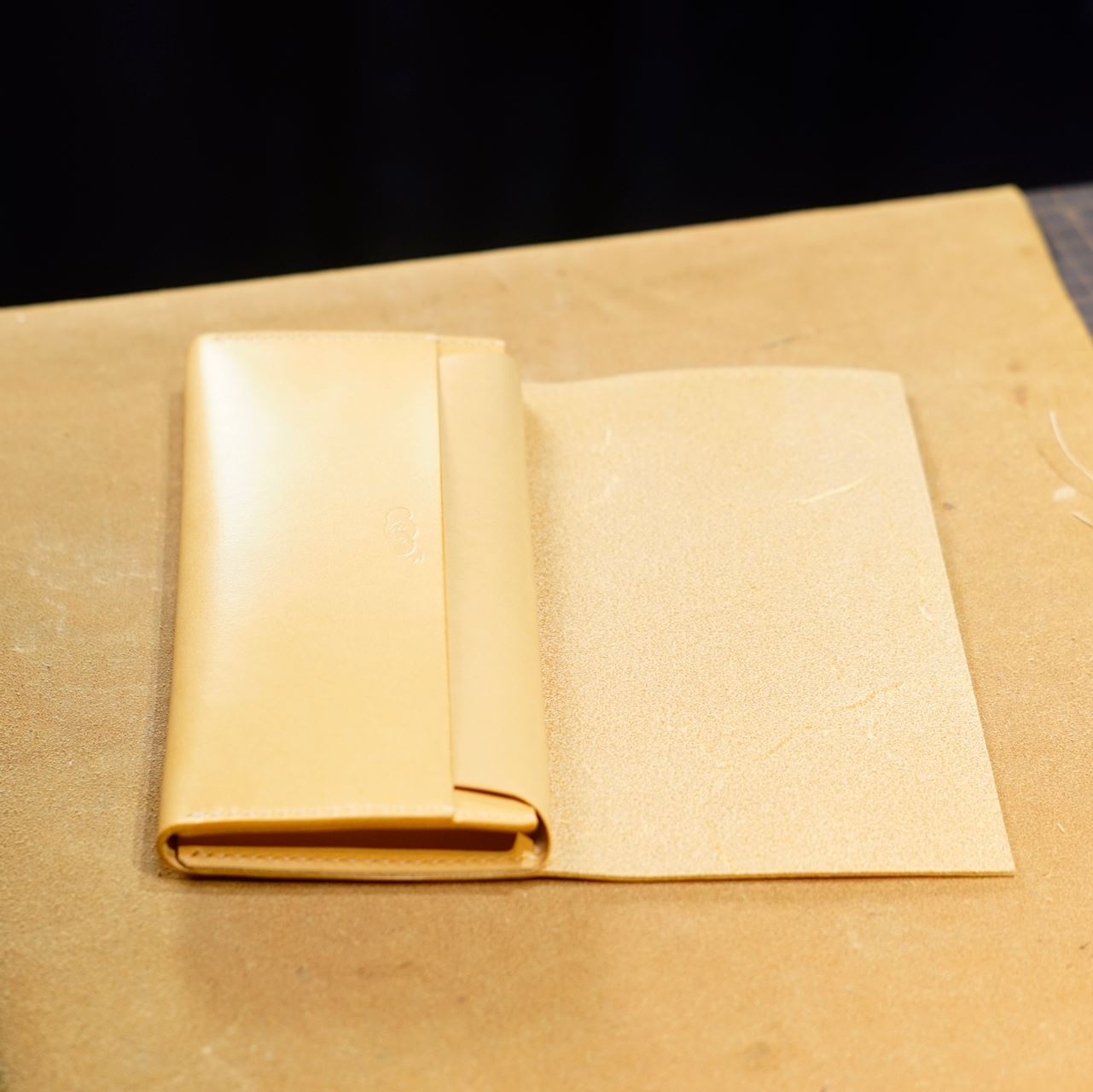 パーツを仮合わせして、おおまかな財布のイメージをチェックします。すべて生成り革というのも新鮮です。