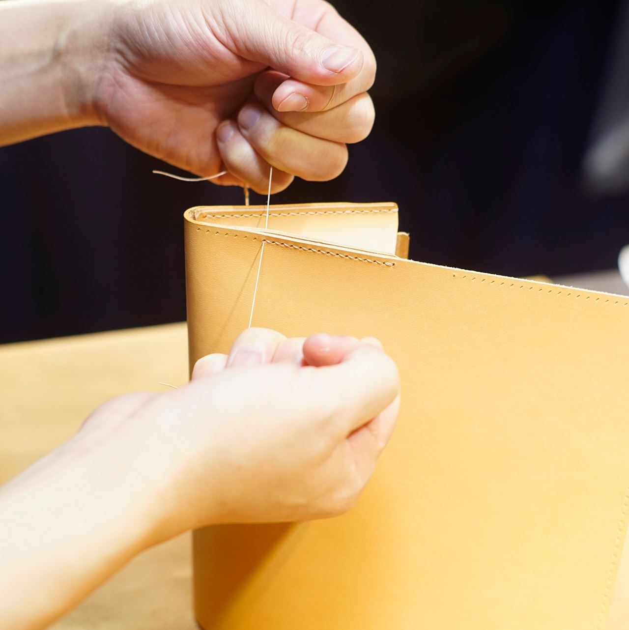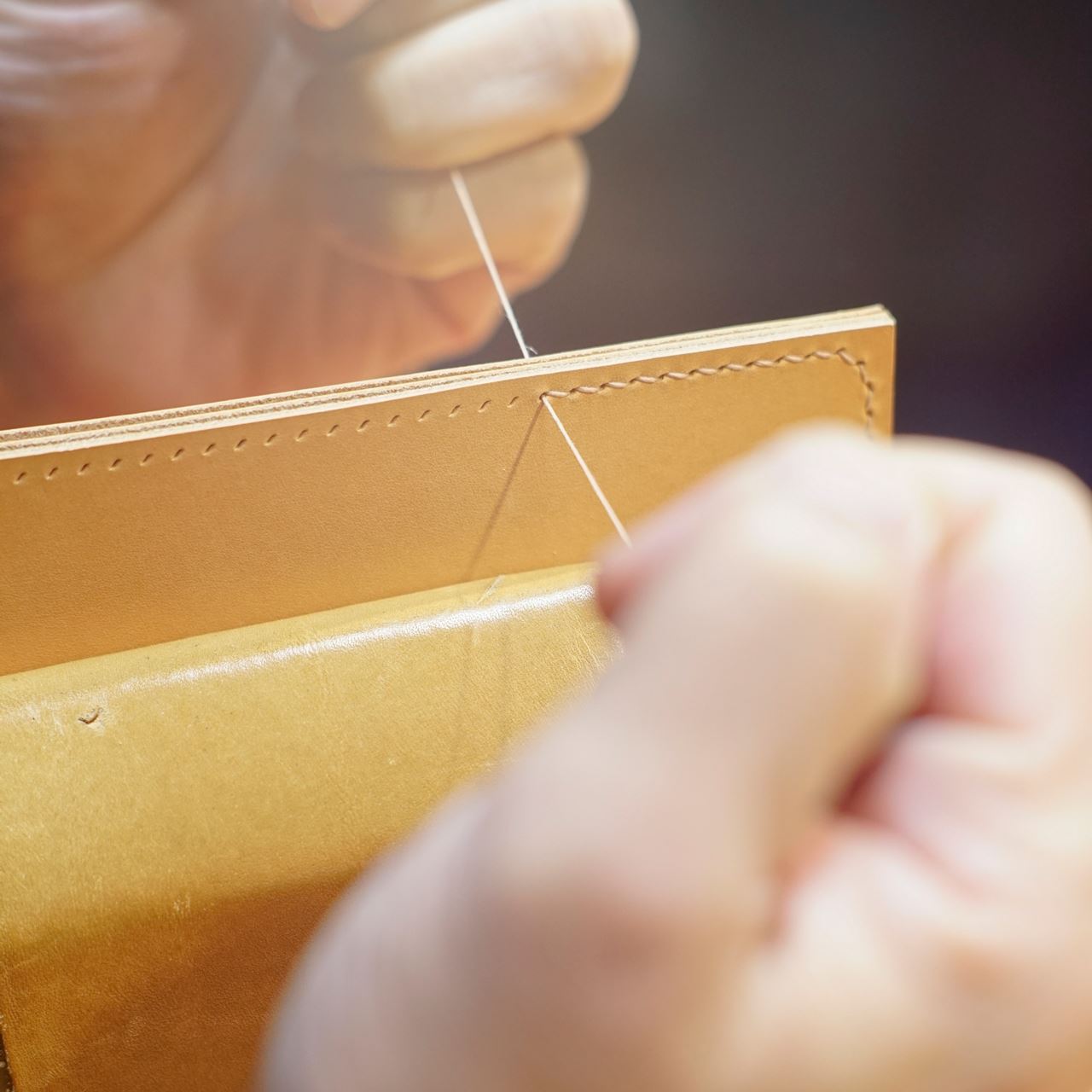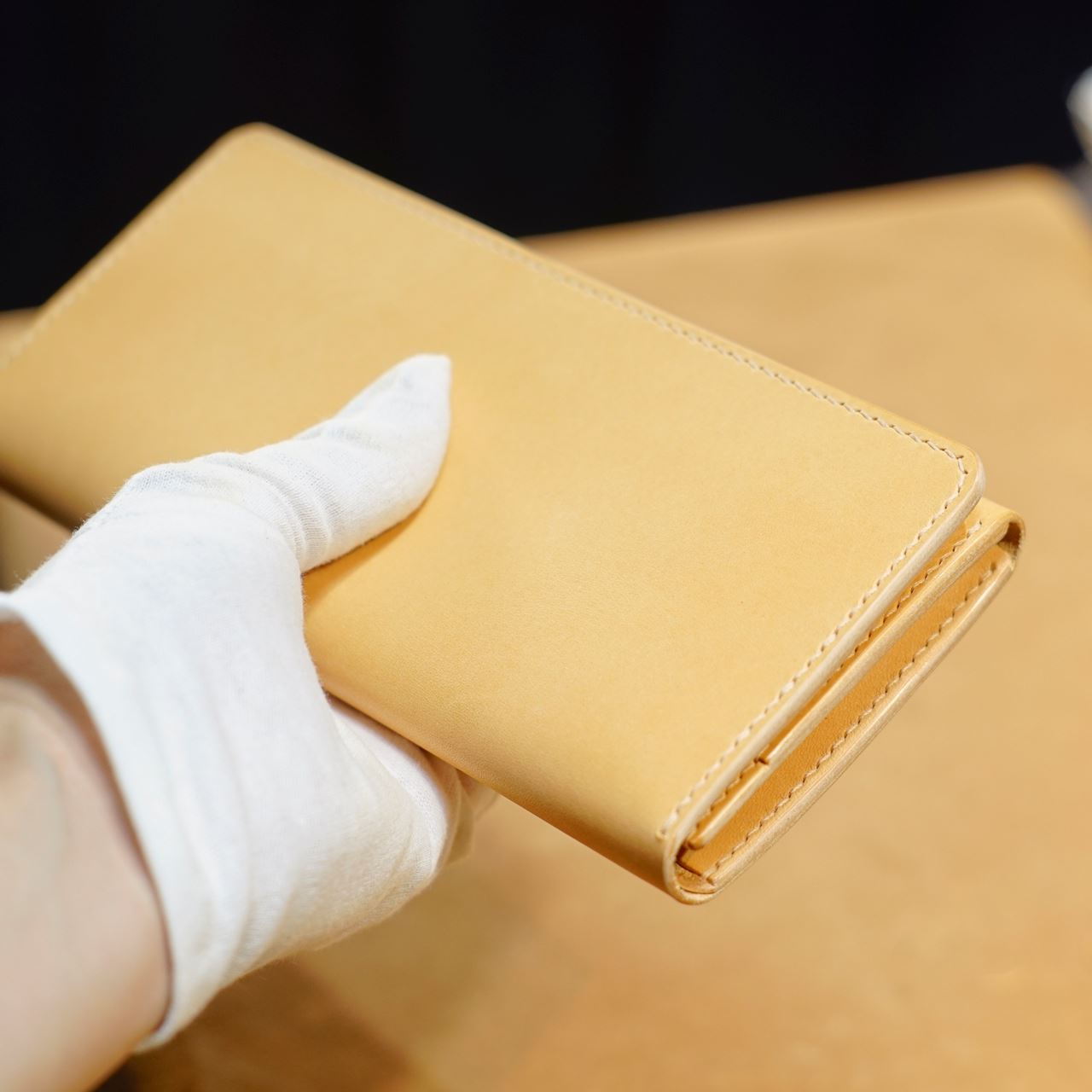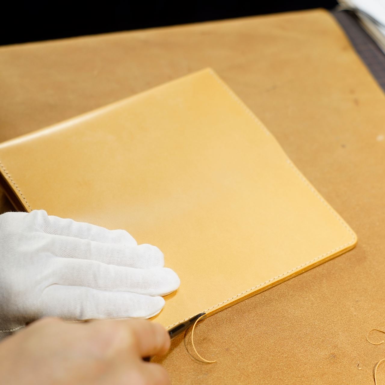 コバ(革の断面)のヘリ落としから、やすり掛けを繰り返して磨き上げていきます。最後にヘチマ磨きで完成となります。