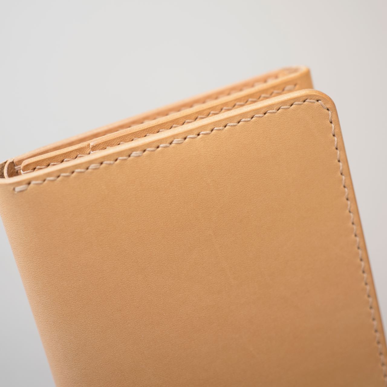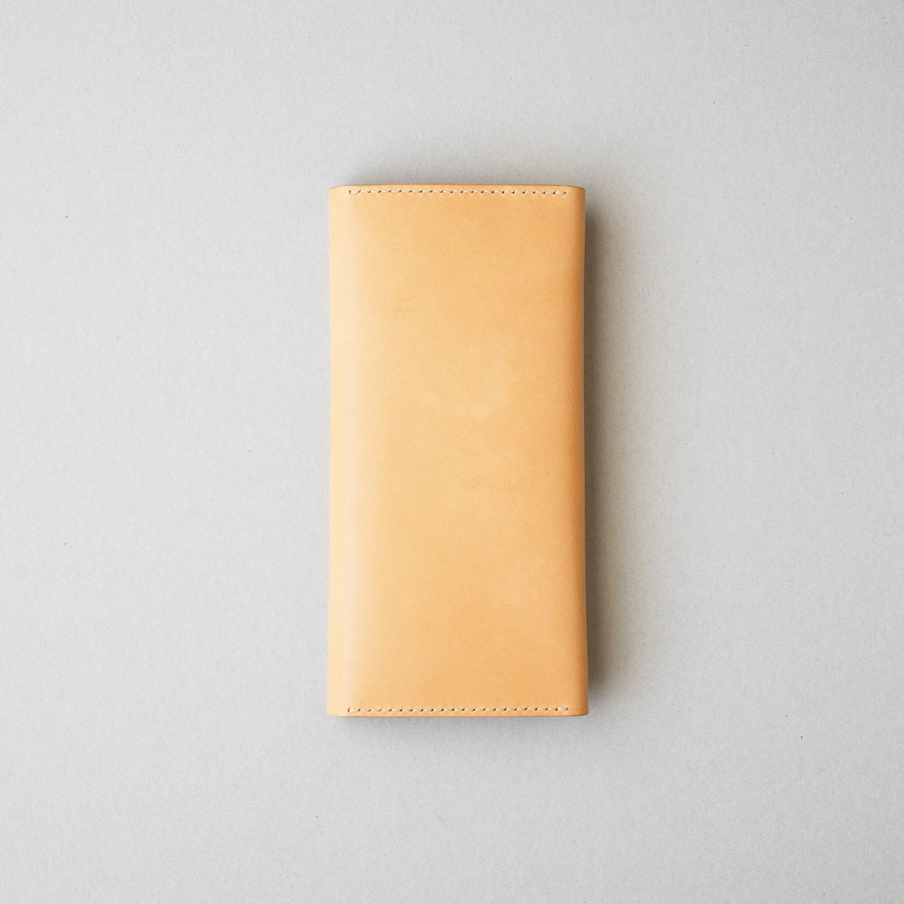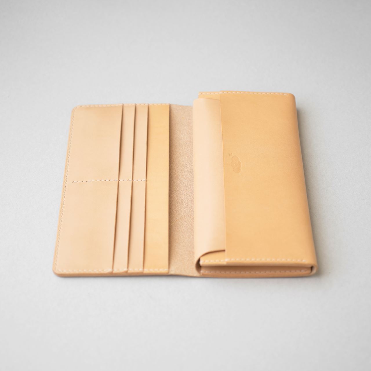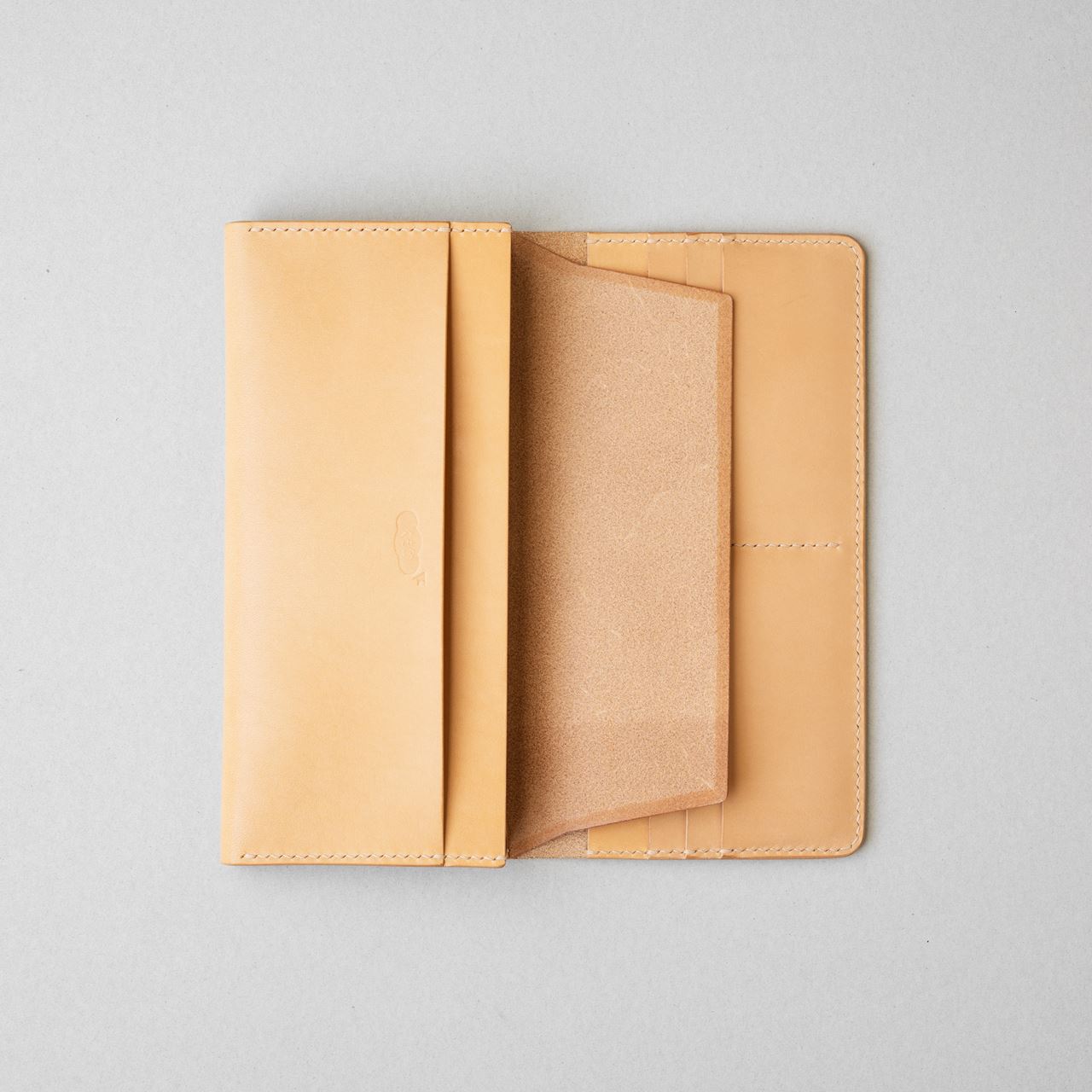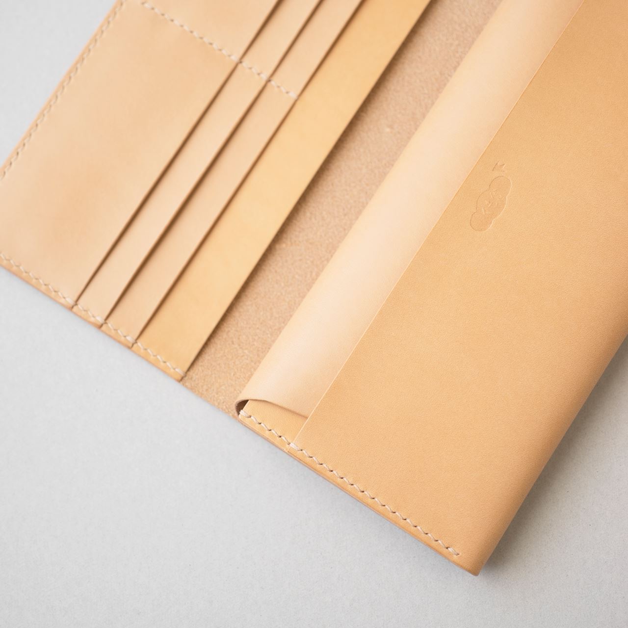 カードが6枚に、お札入が3か所、大き目のコインケース一か所のいたってシンプルな長財布です。コインを入れても広いコインケース内で広がってかさばりません。金具を一切使わず革の特性を利用した蓋でコインが落ちません。