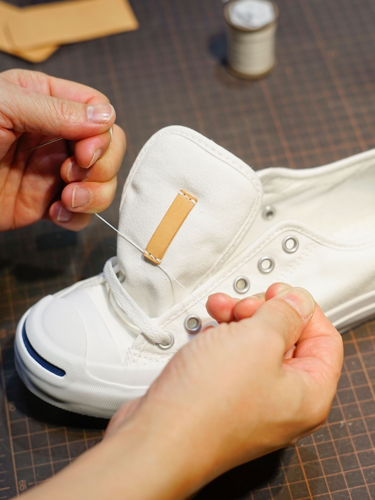 生成り革をベロに左右縫い付けます。縫い糸はロウ引き済みの六花リネン糸0.5mmの白になります。やっぱり生成り革と白ステッチは抜群の相性です。