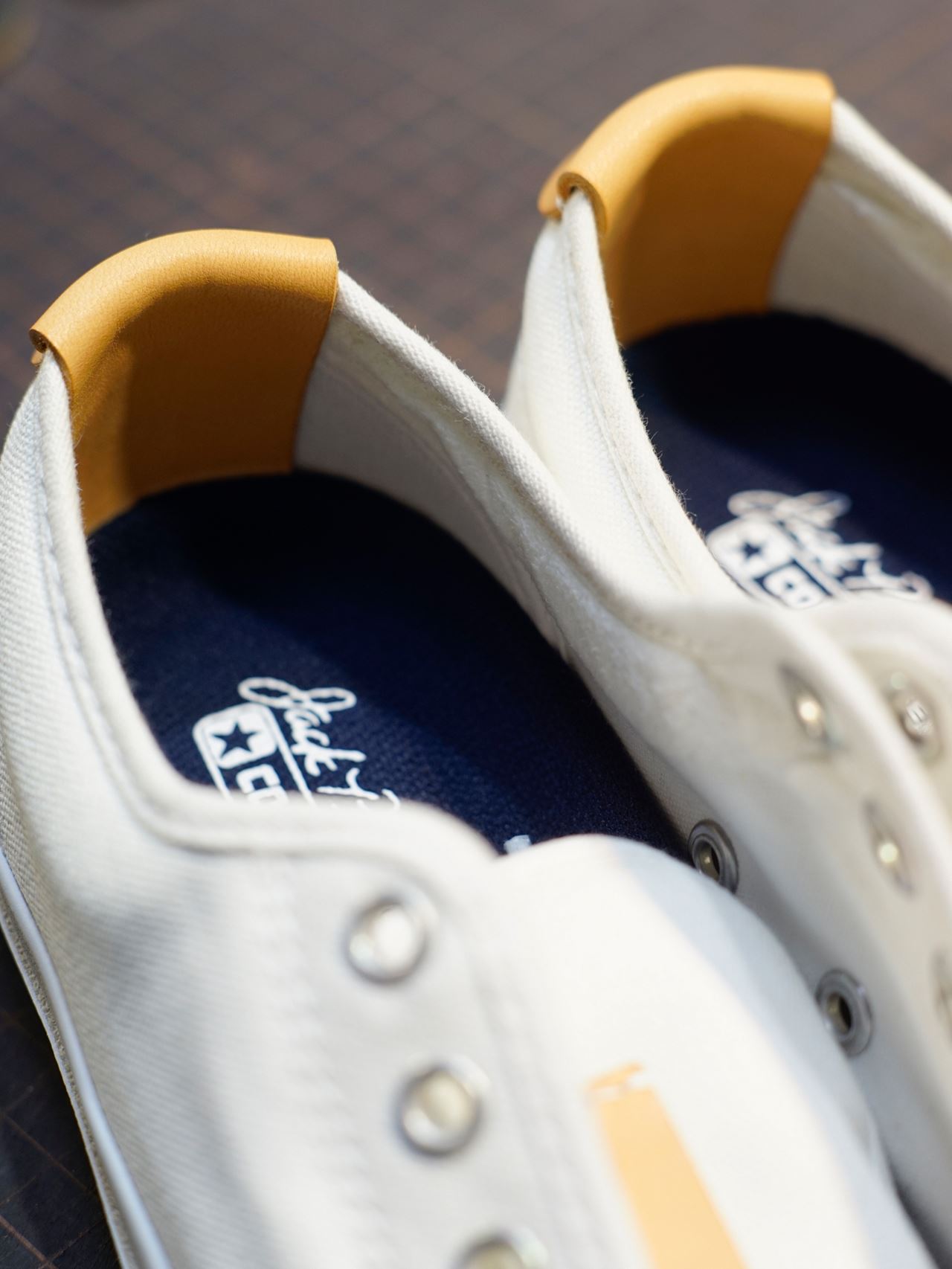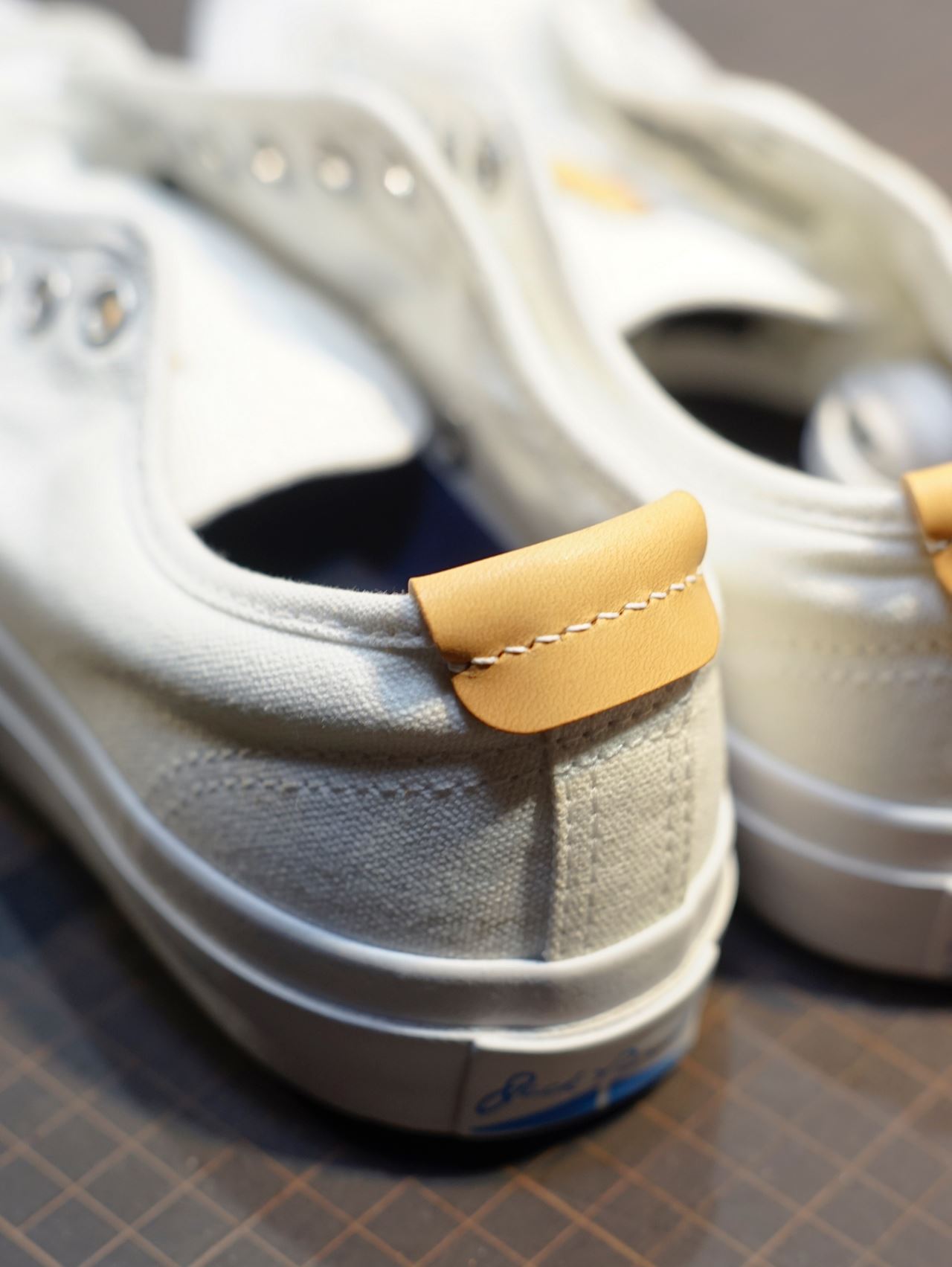 青ひげ改はキャンバススニーカーの定番『青ひげ』の弱点①かかと部分の破れ②ベロ部分の落ち込みを補うべく、革パーツで使い勝手や補強を施したスペシャル版『青ひげ』です。