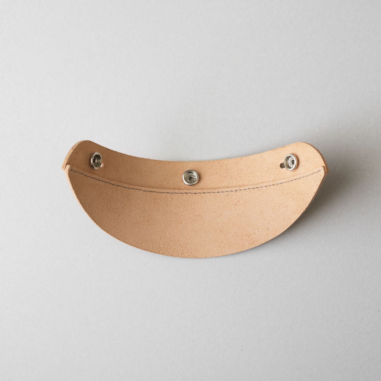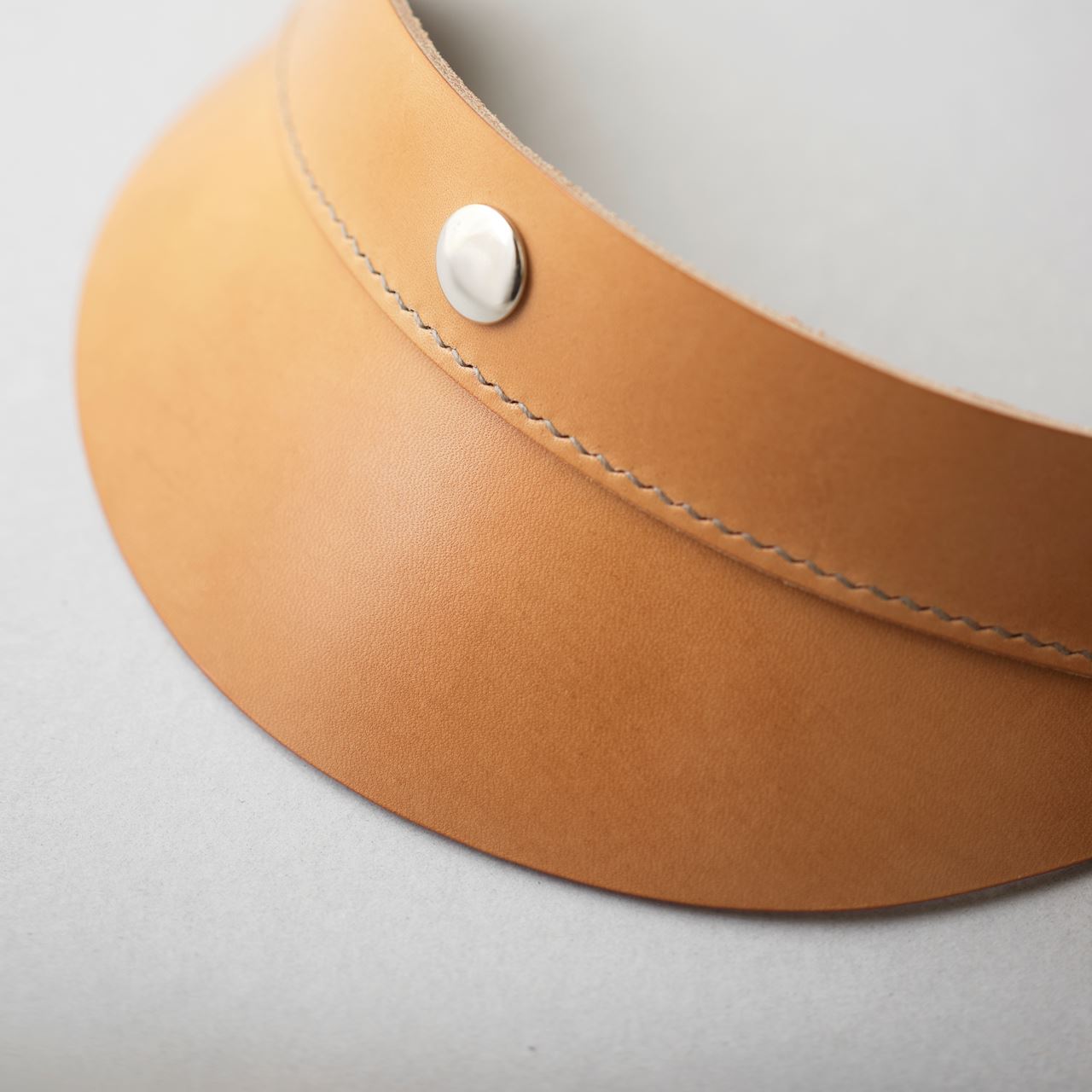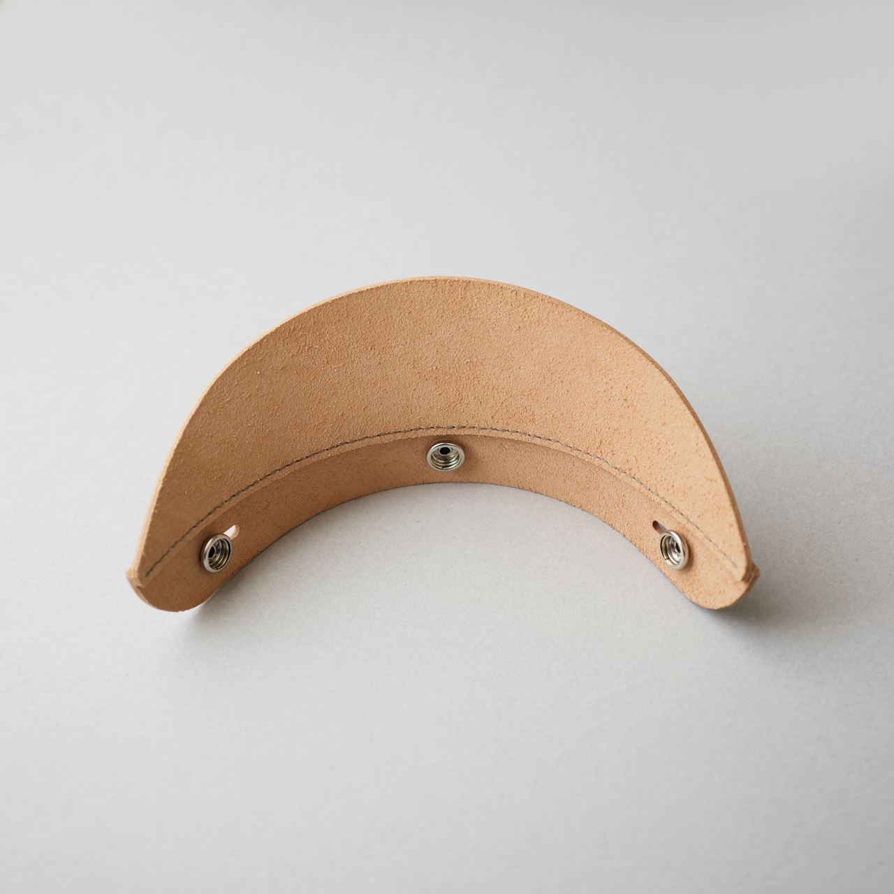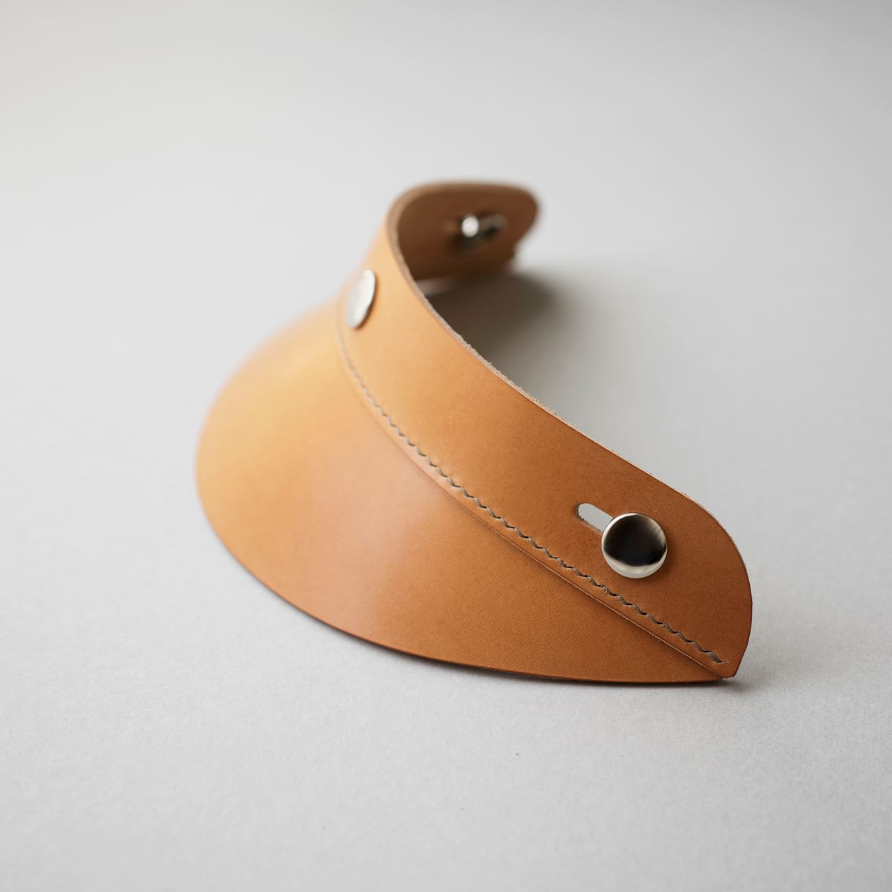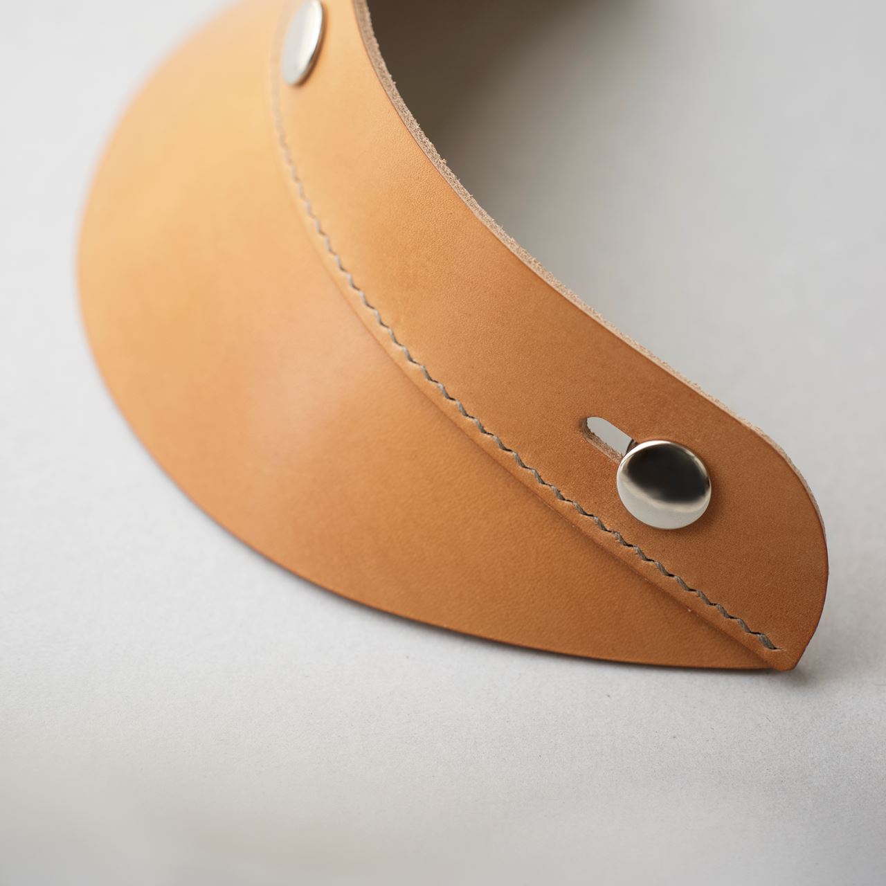 ジェットヘルメットなどに取り付けるタイプのバイザーです。漉きなしの厚みのあるヌメの1枚革を使用しています。ひさし部との連結は丈夫なリネン糸を手縫いで仕上げております。コバは切りっぱなしでエッジの立ったシャープな作りです。植物タンニン鞣し革の経年変化を楽しめると思います。両端のホックは可動しますので、大抵のヘルメットには取り付け可能です。