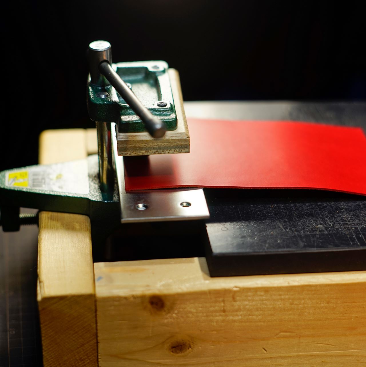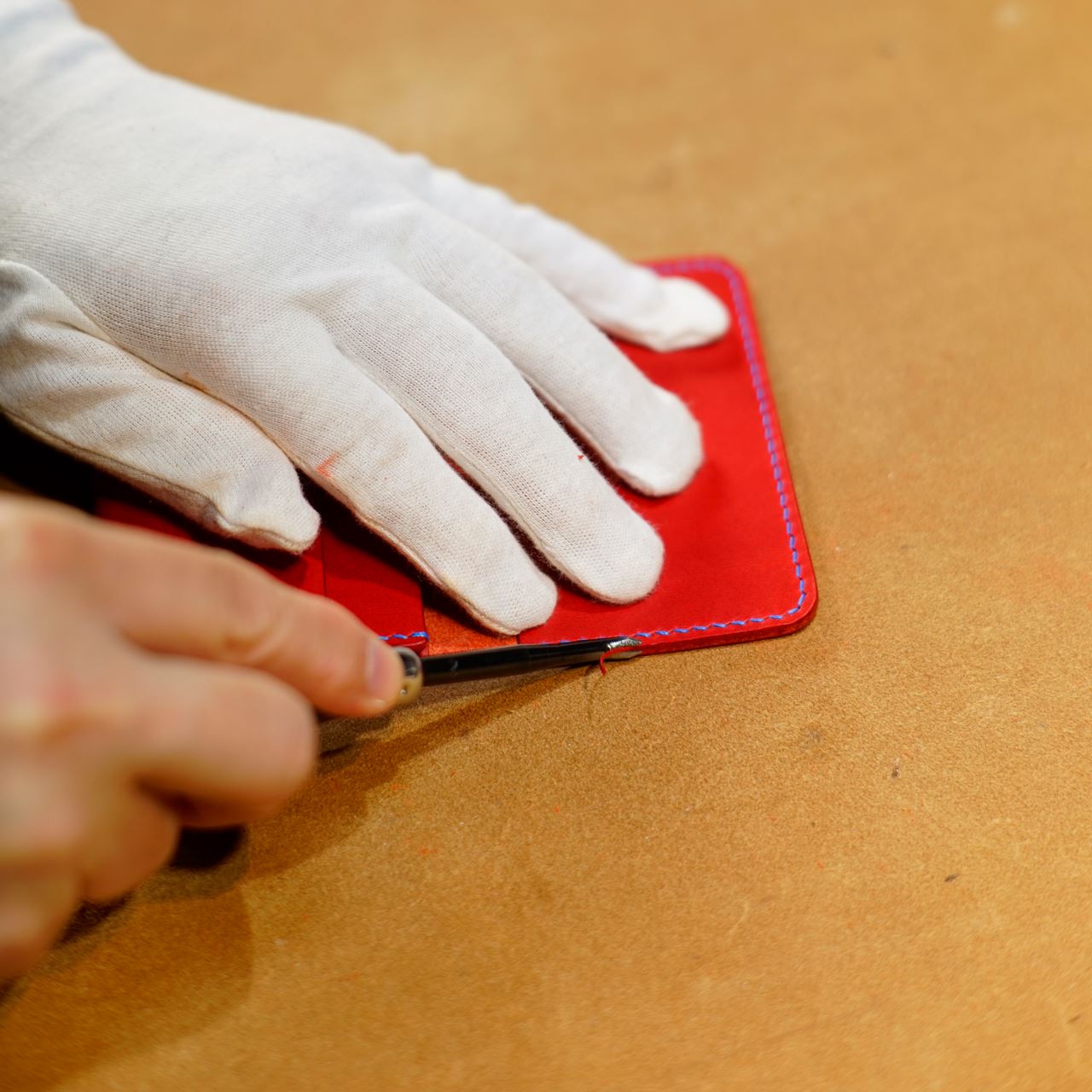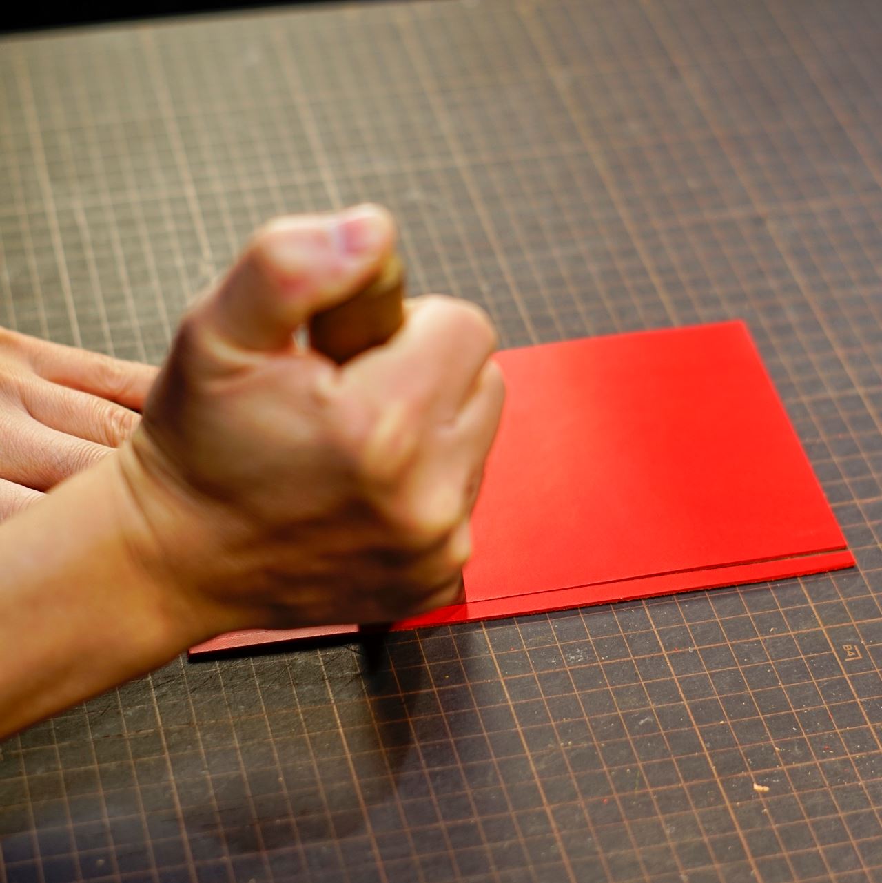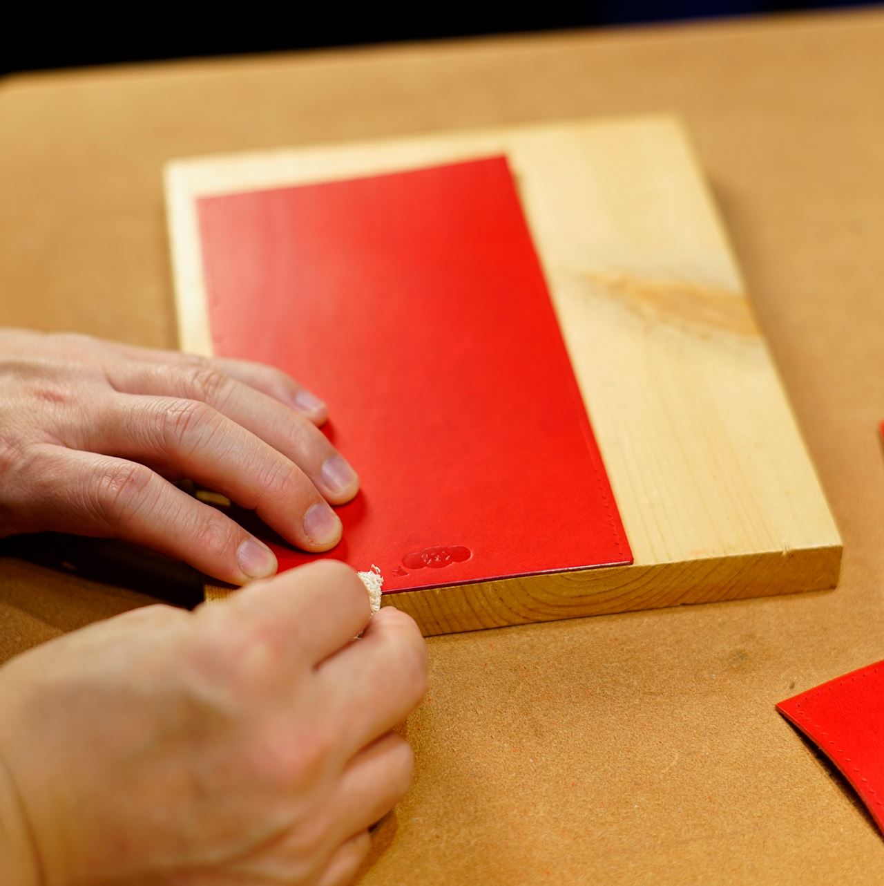 今回ご指定の革はイタリアンハードの赤になります。革をカットして刻印を打刻します。