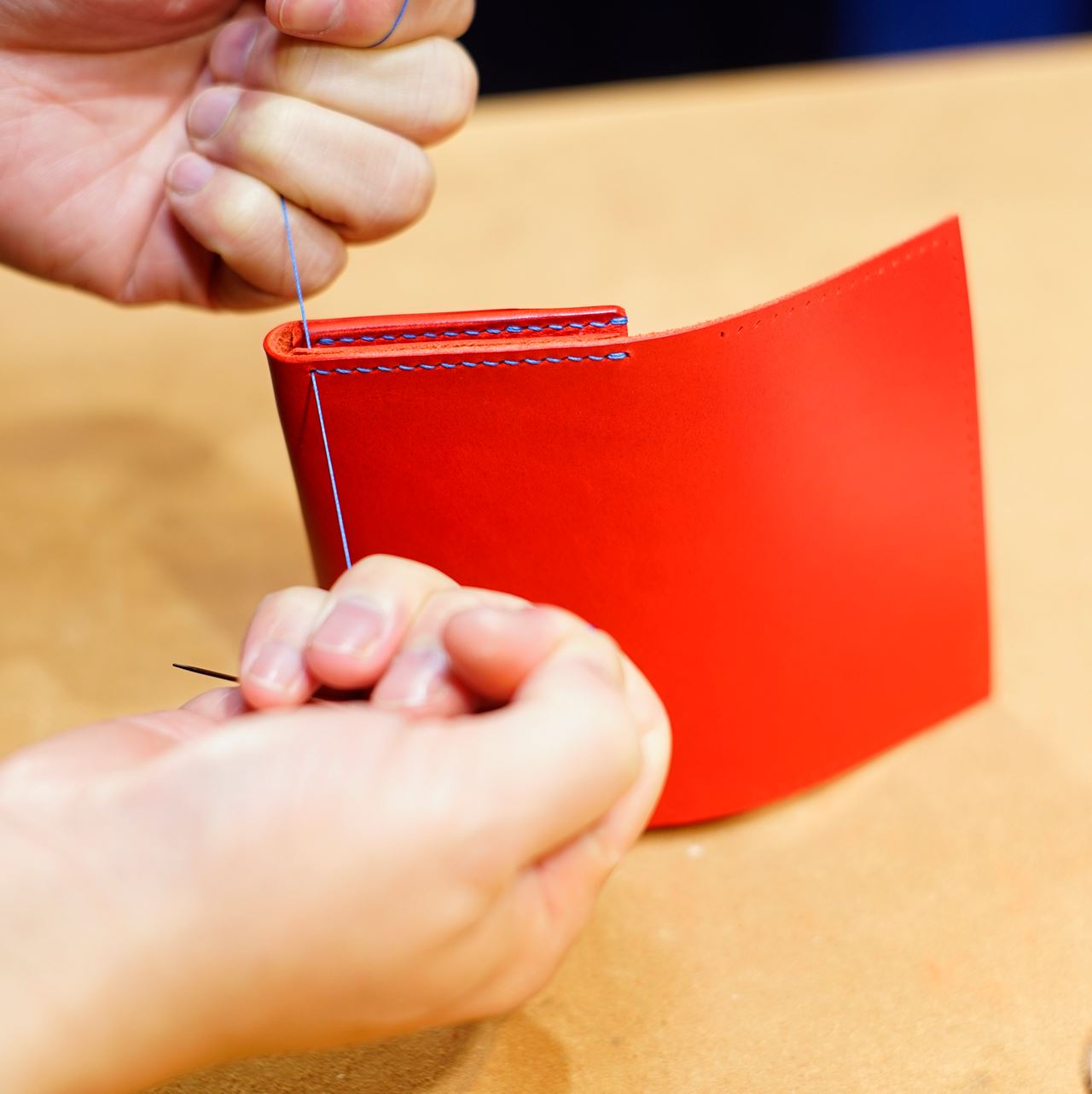 全てのステッチが終了しましたので、最後にコバ(革の断面)磨きで仕上げれば完成となります。
