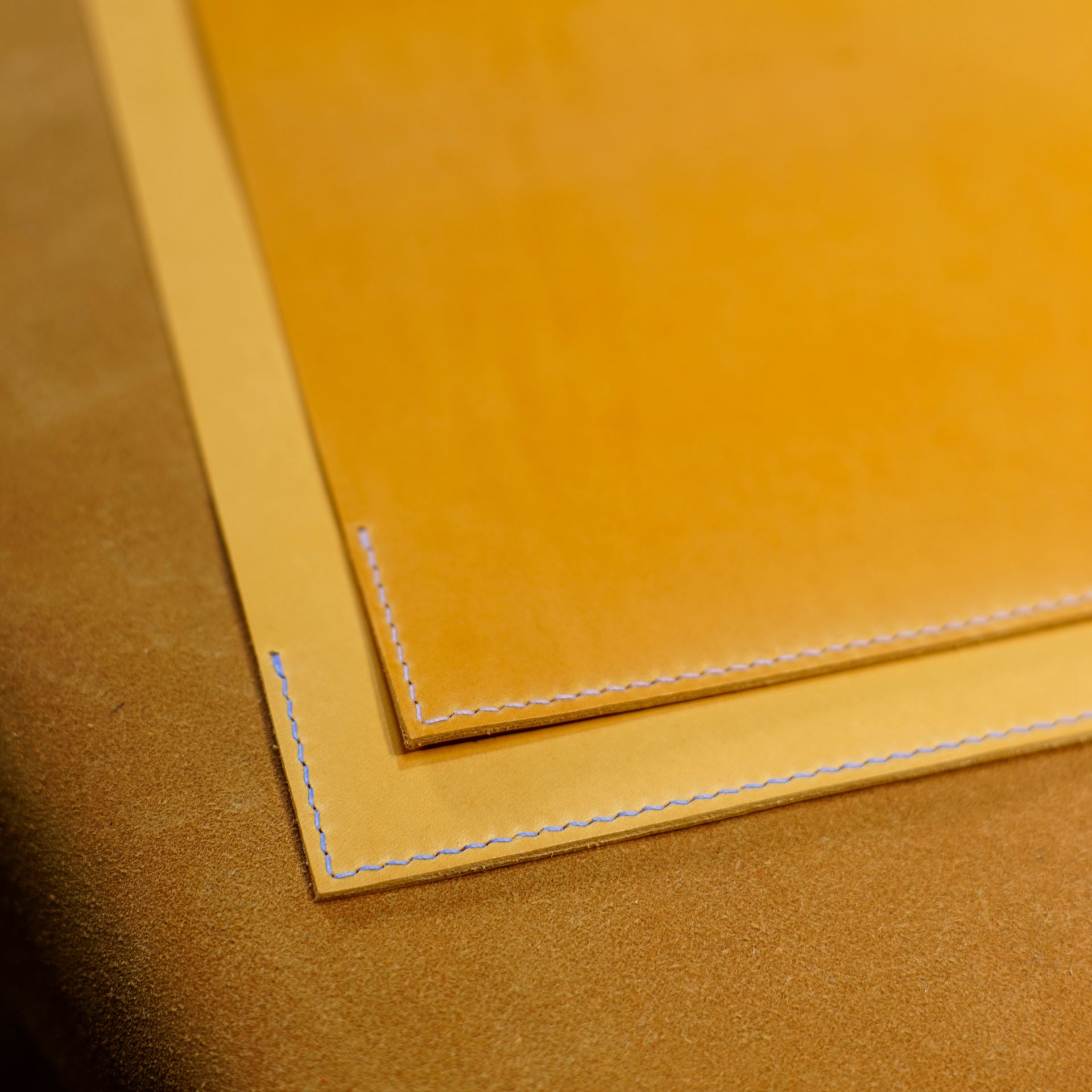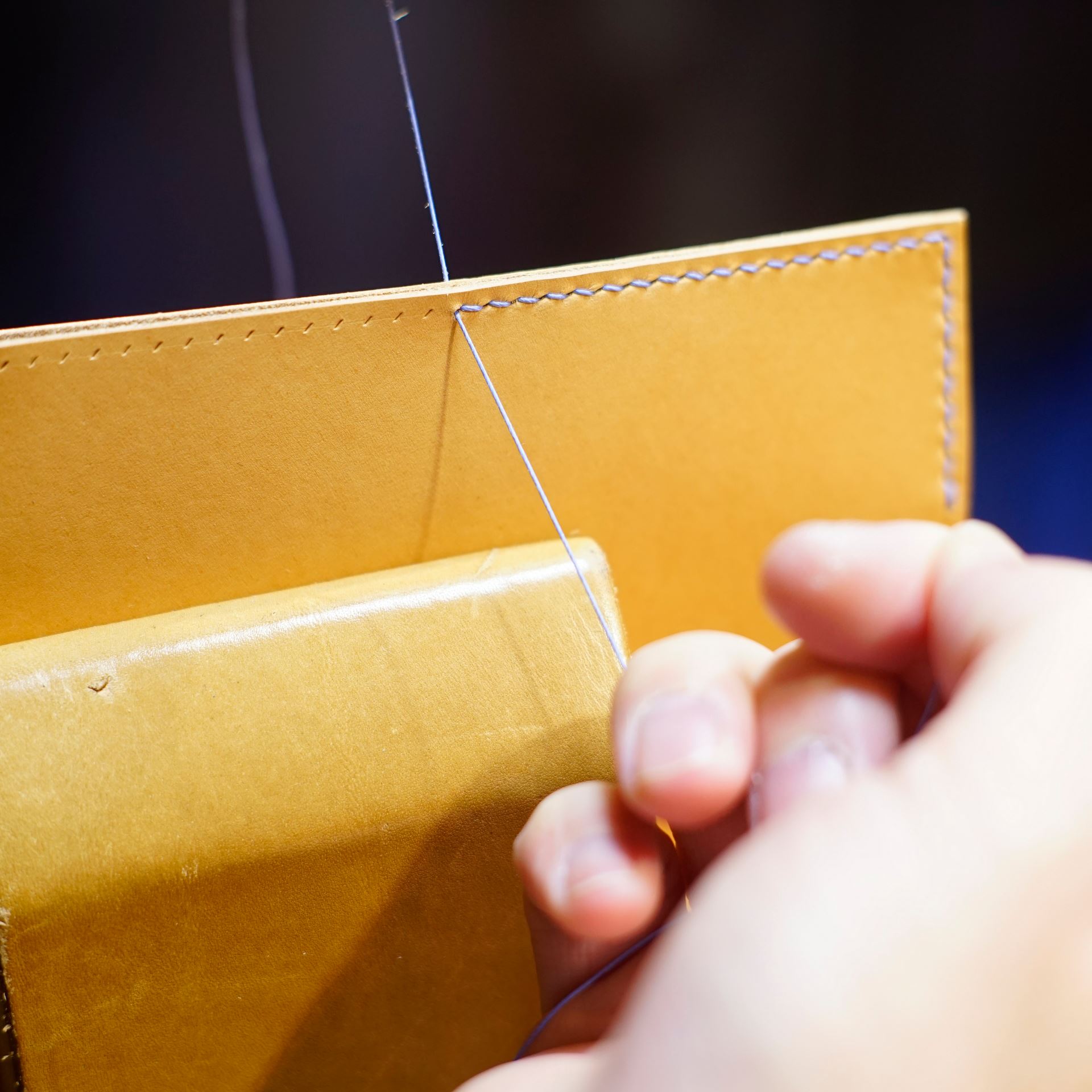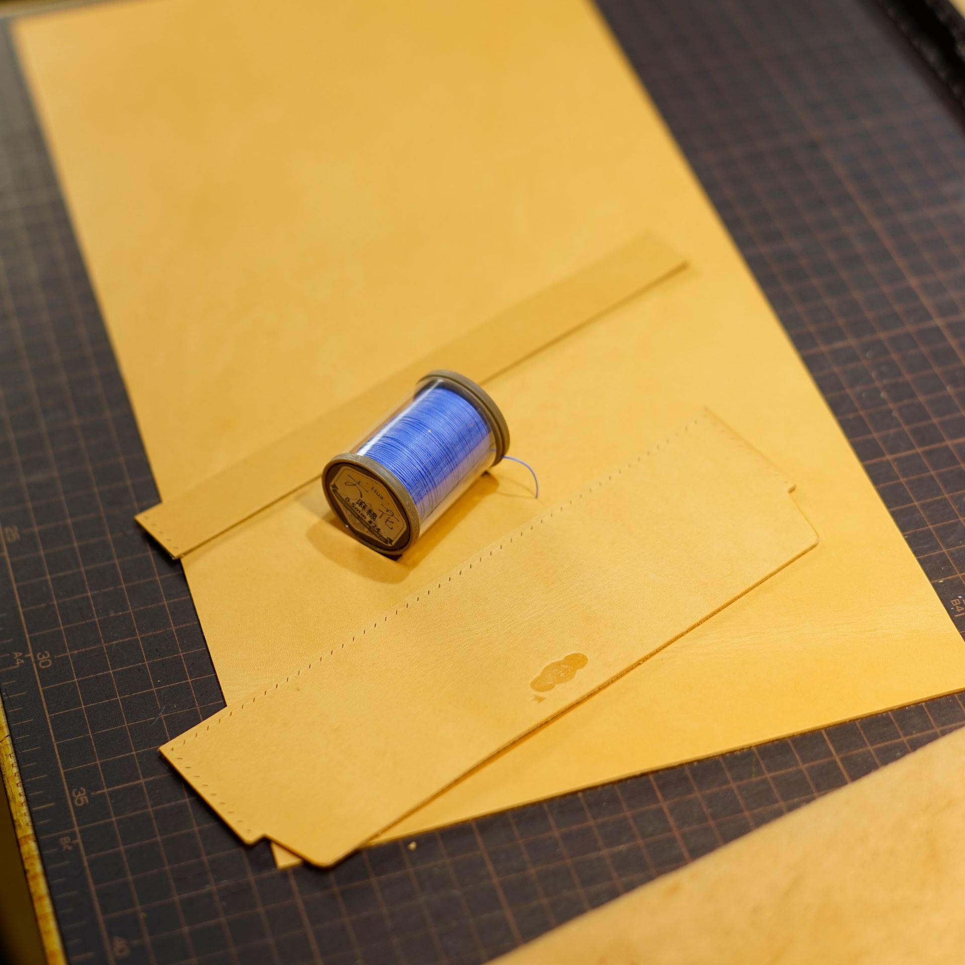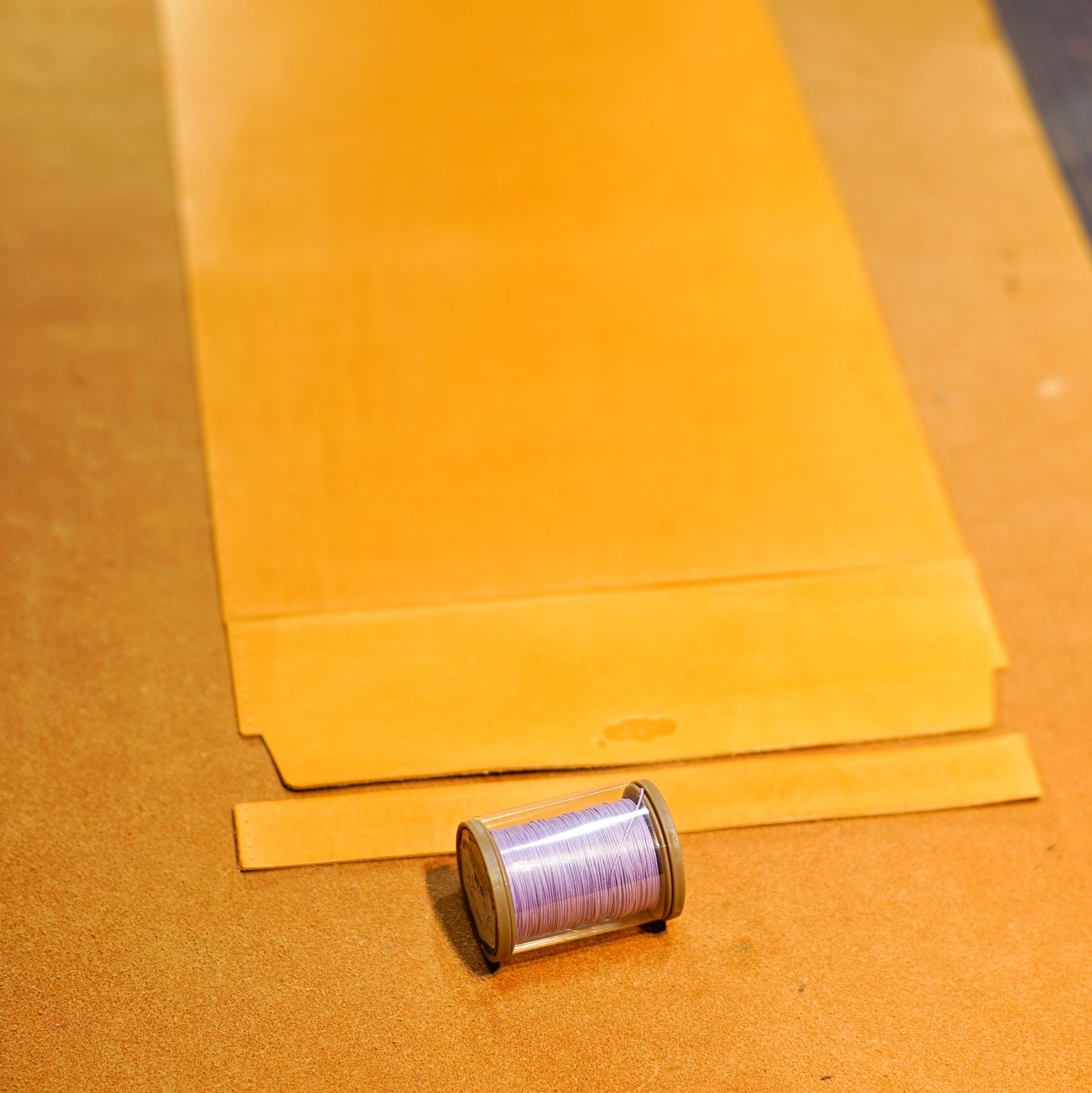 生成り革と生成りヴィンテージの革をカットして、くも舎刻印、目打ち、軽いコバ磨きを済ませます。生成りには24勿忘草、ヴィンテージには33白藤のステッチを入れます。