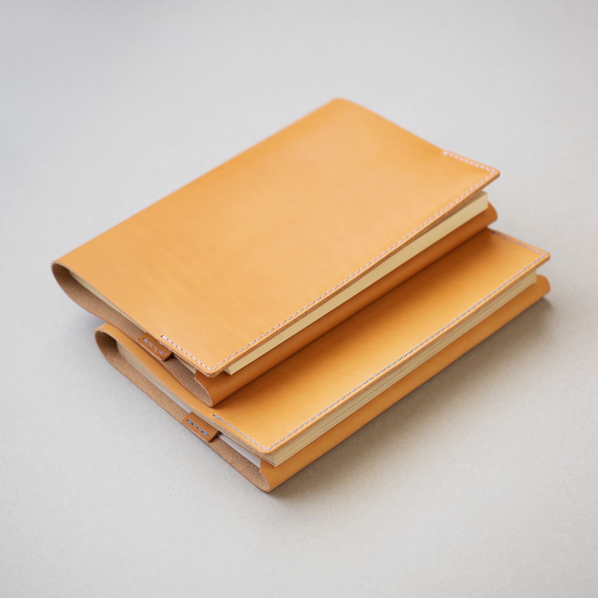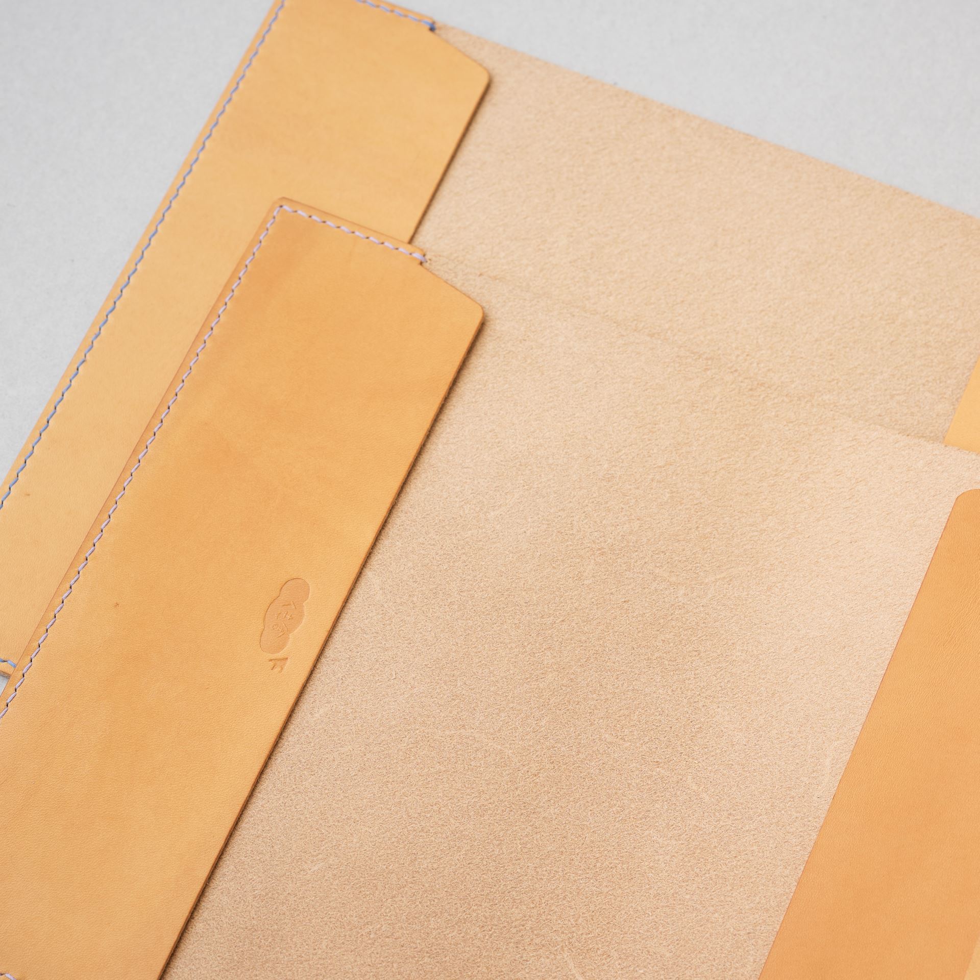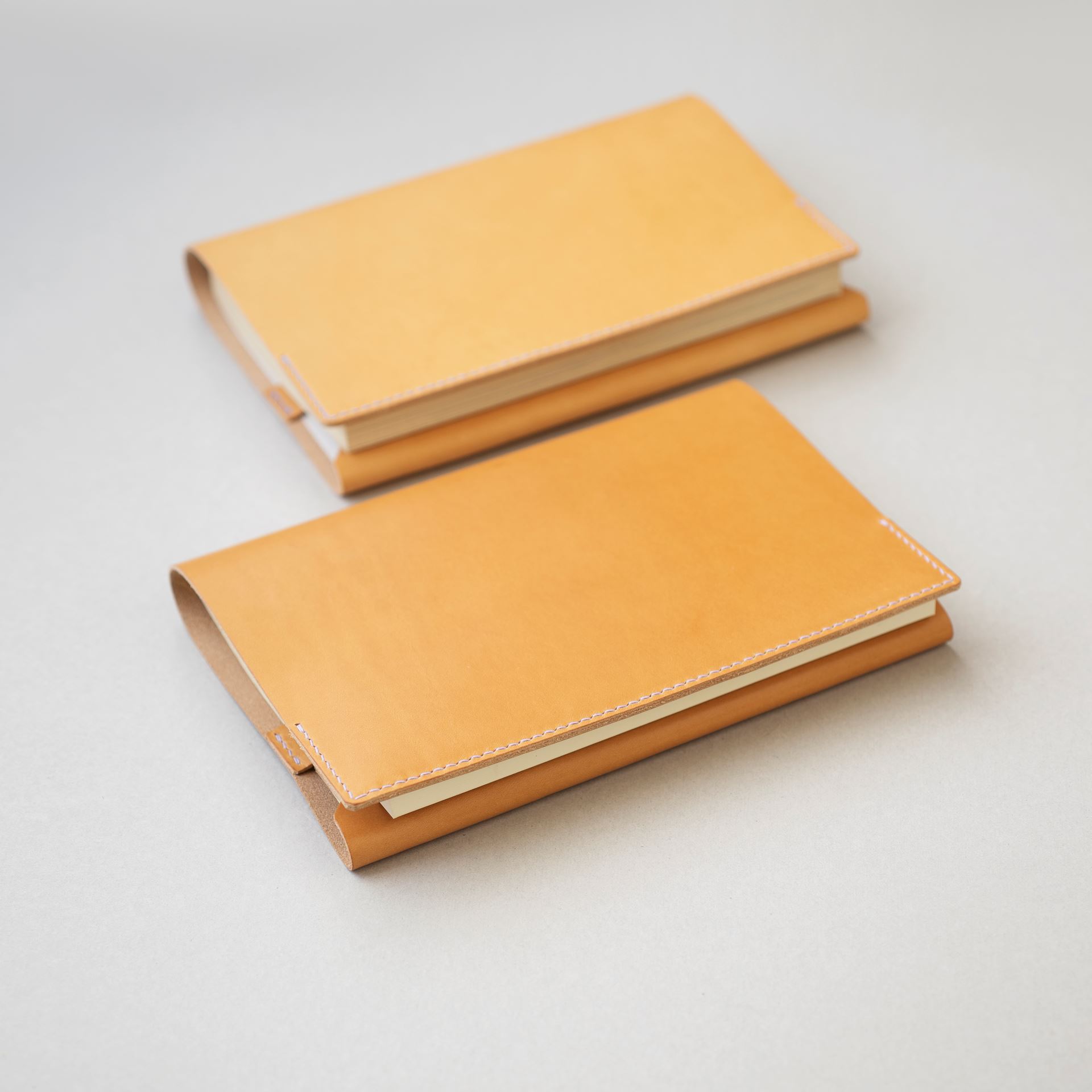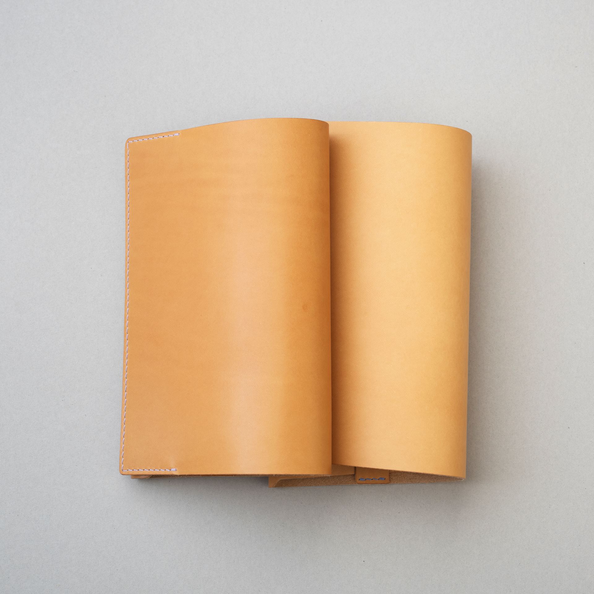 植物タンニン鞣し革に麻糸で手縫いを施したシンプルなつくりです。差込部にステッチを入れることで、ブックカバー1型をよりスマートに、本を読みやすく進化させました。