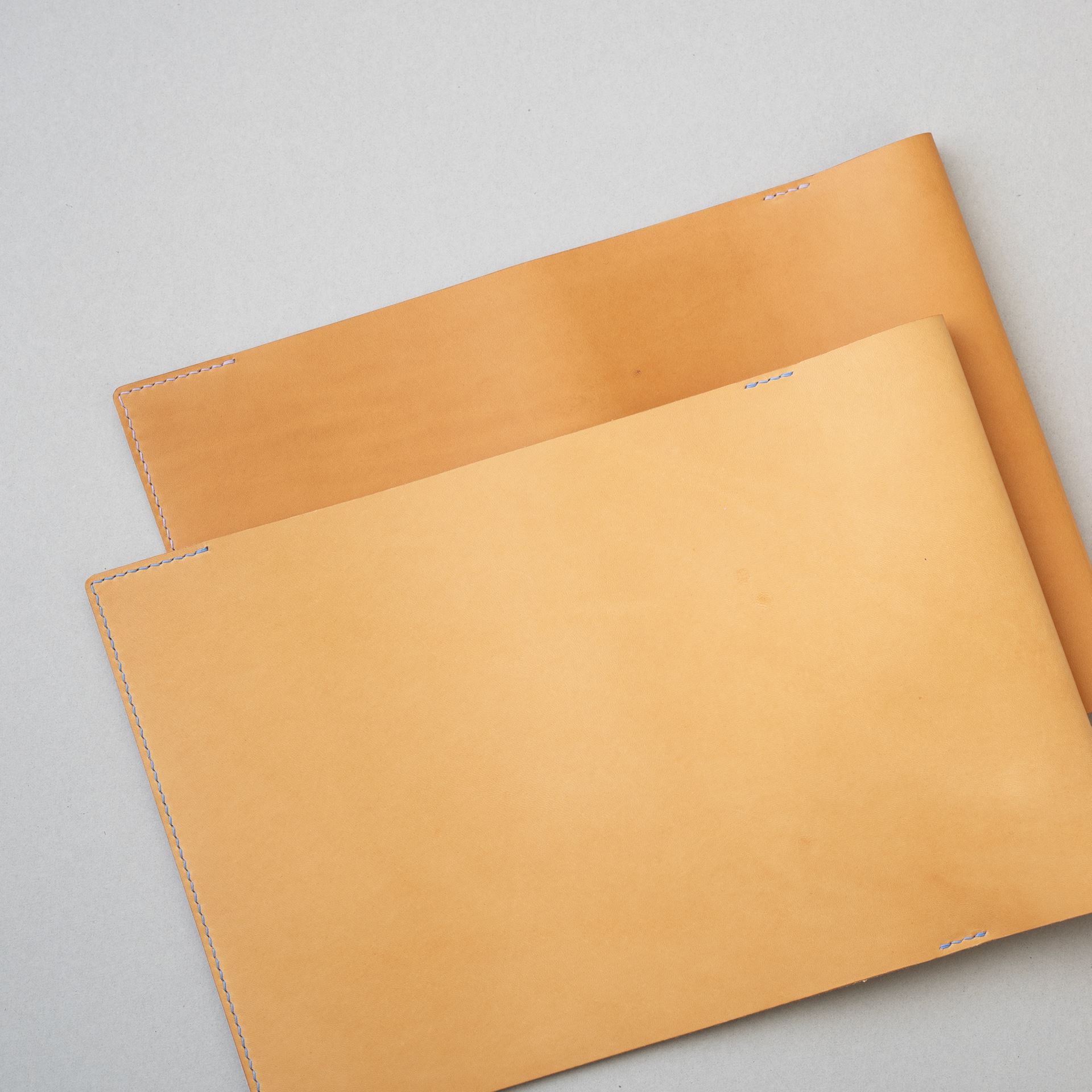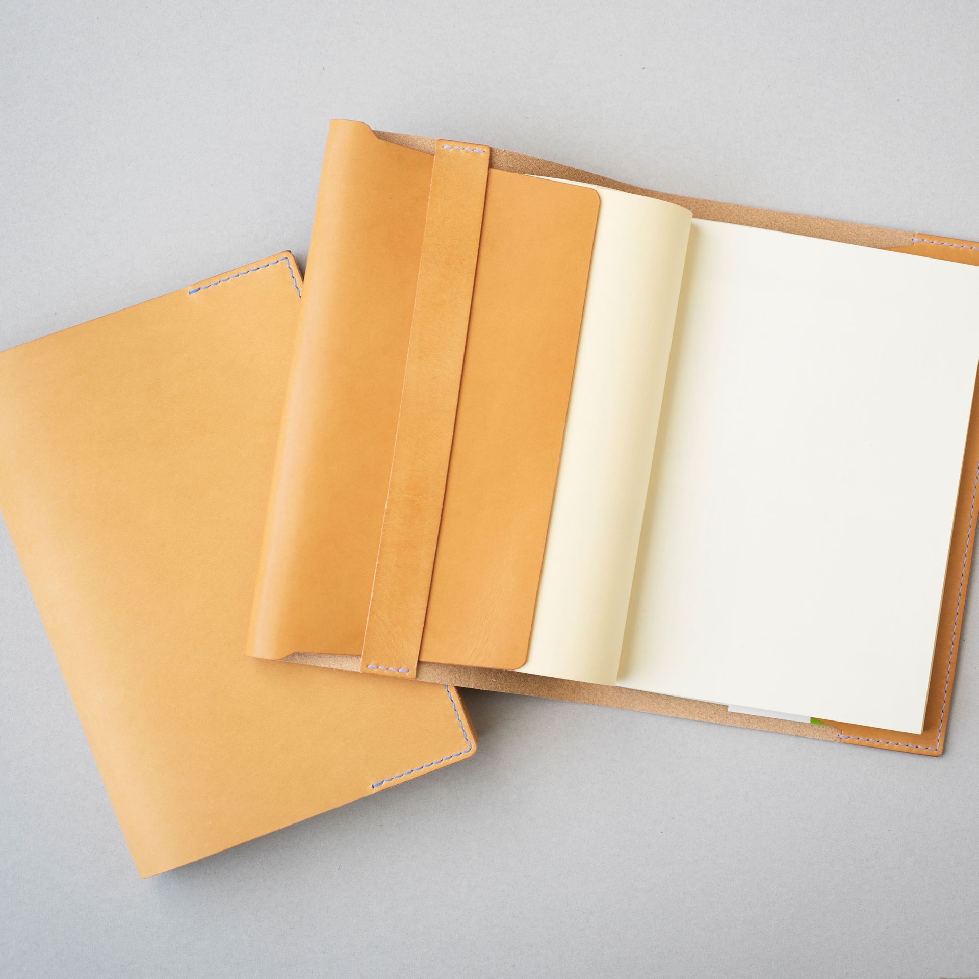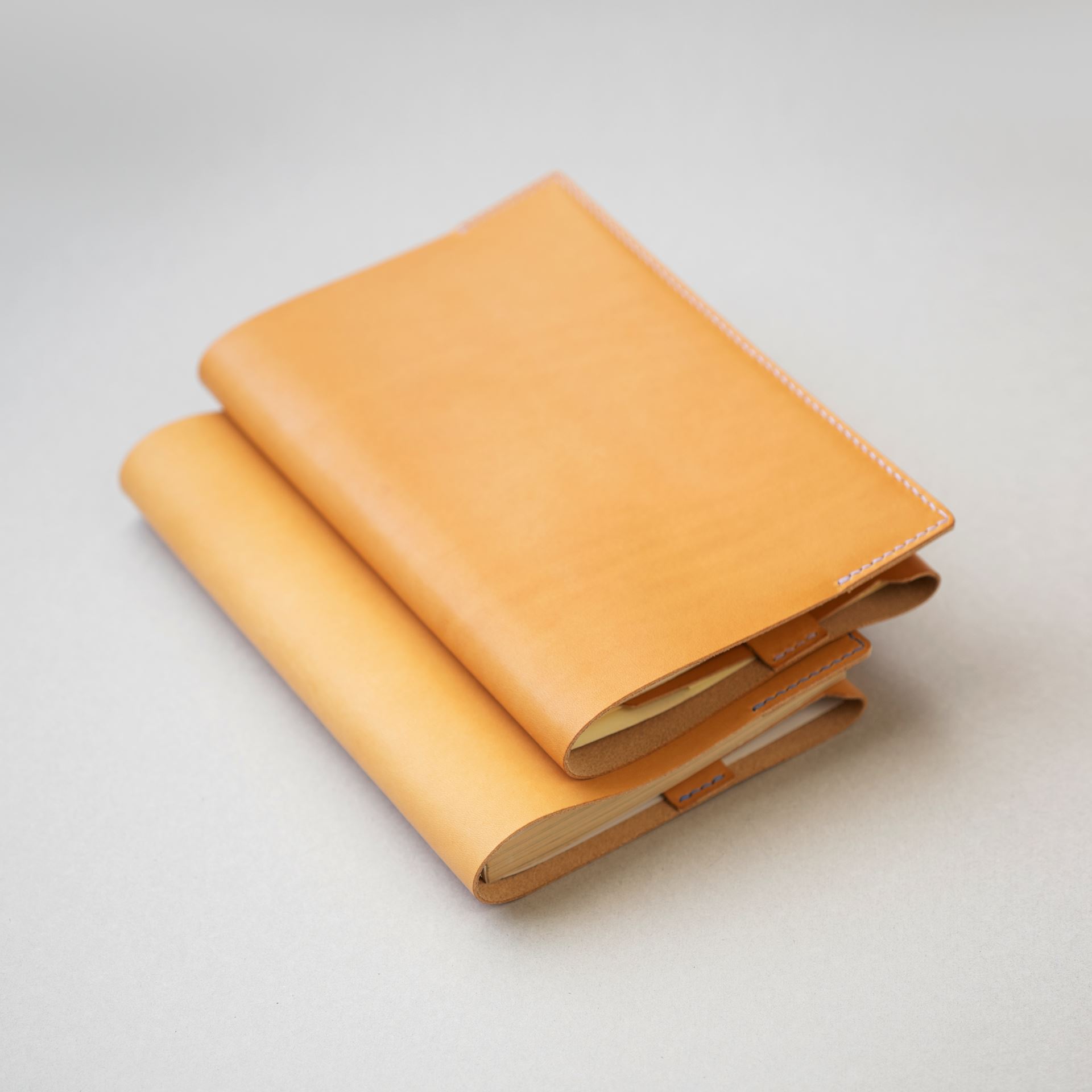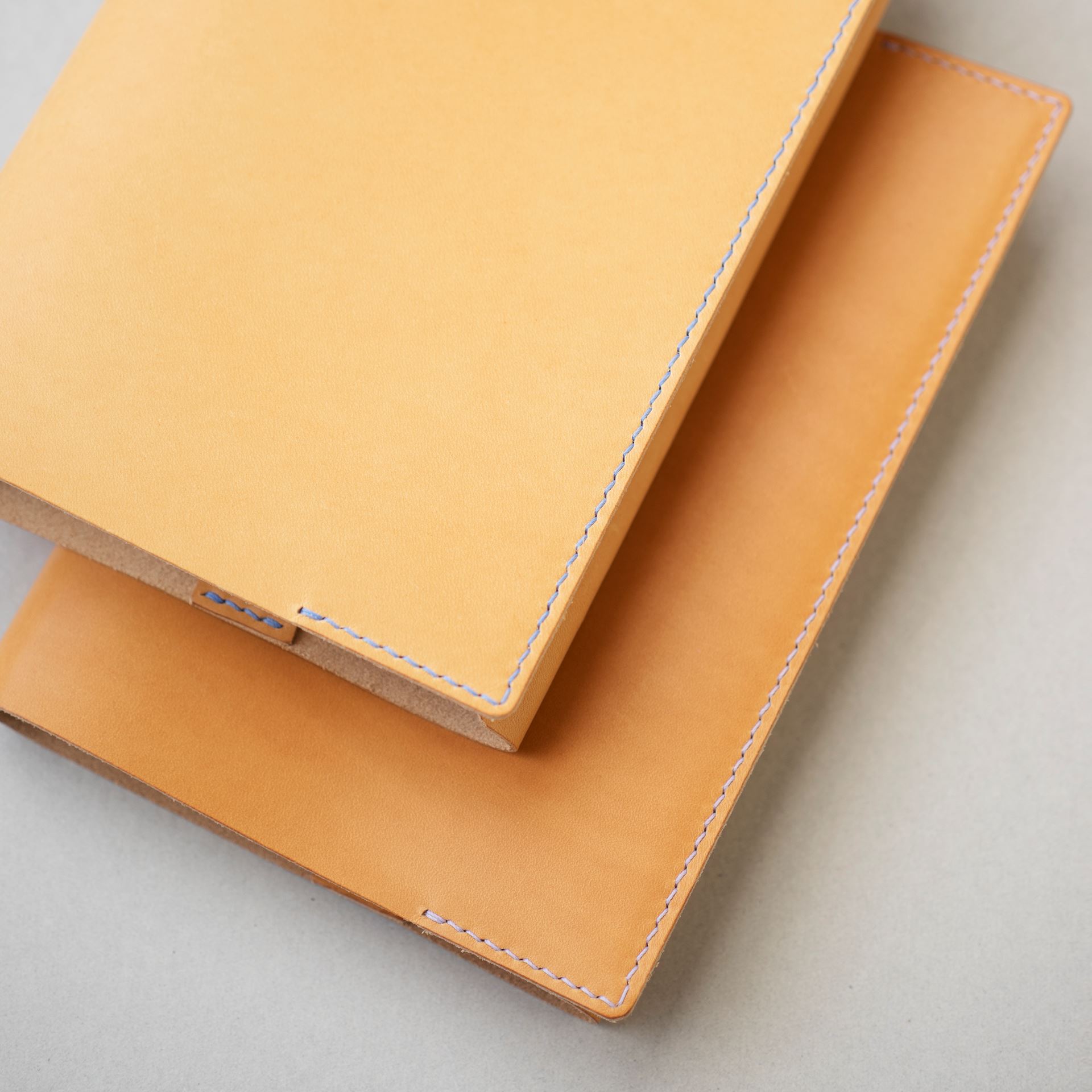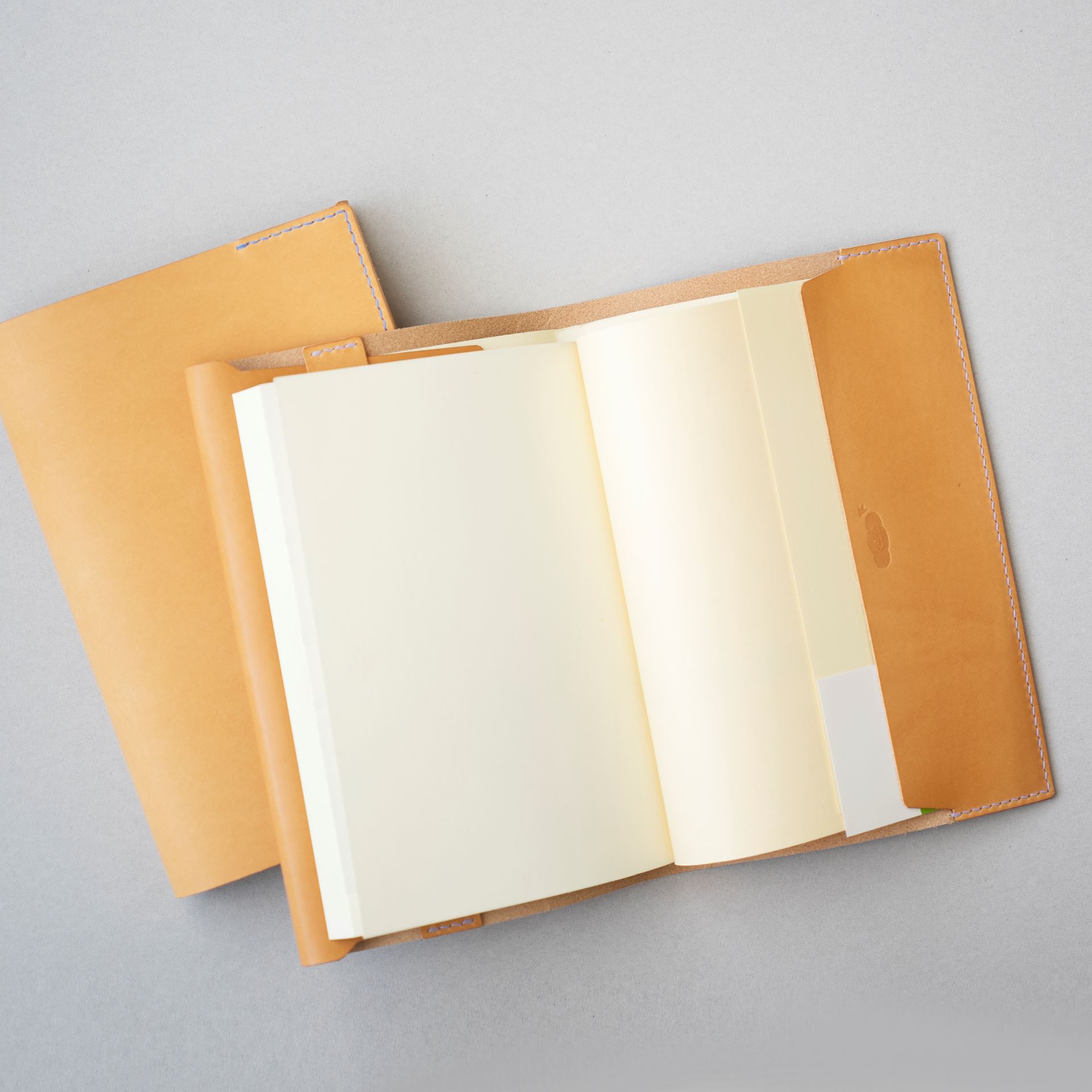 植物タンニン鞣し革に麻糸で手縫いを施したシンプルなつくりです。差込部にステッチを入れることで、ブックカバー1型をよりスマートに、本を読みやすく進化させました。