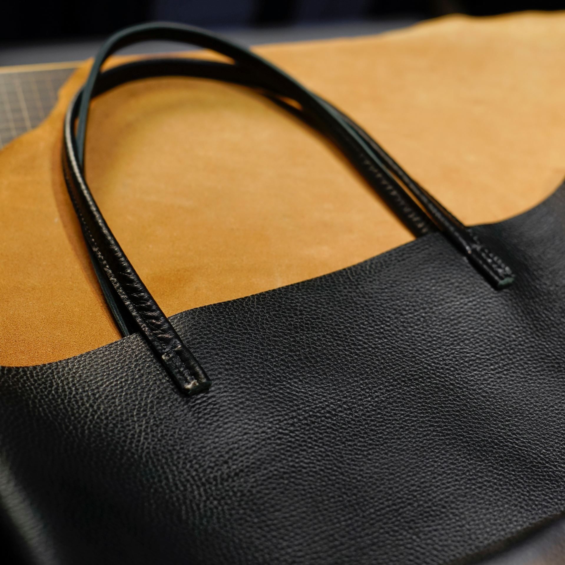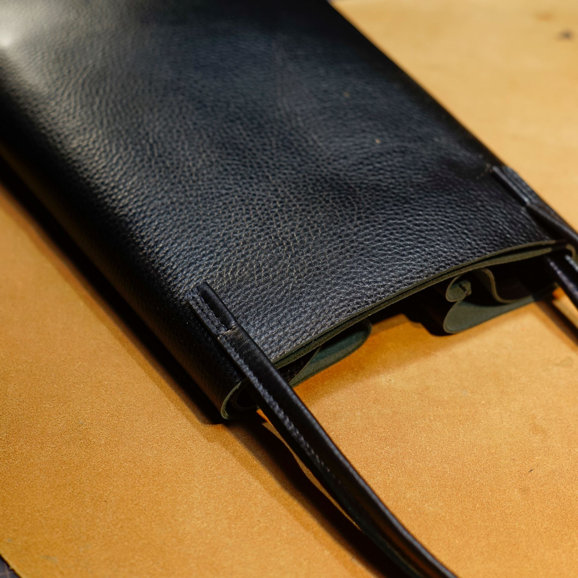 トートバッグ業務型SLが完成しました。イタリアンハードなどのヌメ革と比べると、クタっとした柔らかさがあります。くるりと丸めて梱包して発送となります。