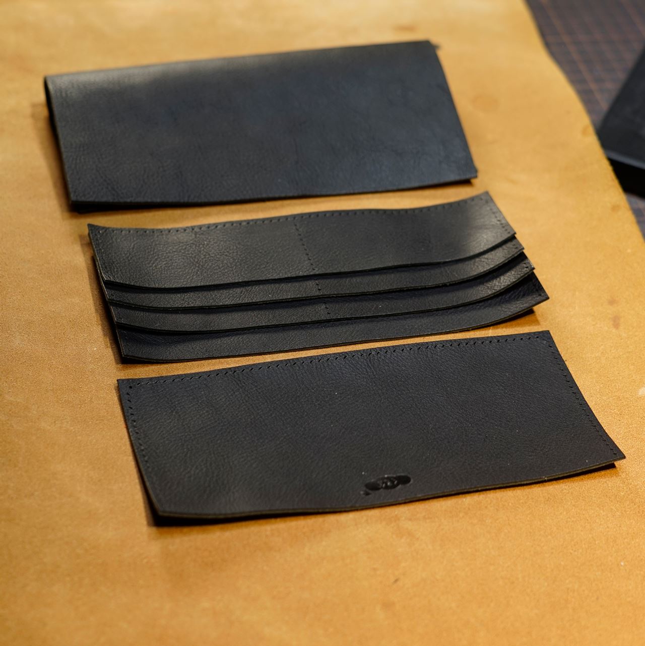 カットしたパーツに刻印を打刻してカード挿し側のパーツから手縫いします。