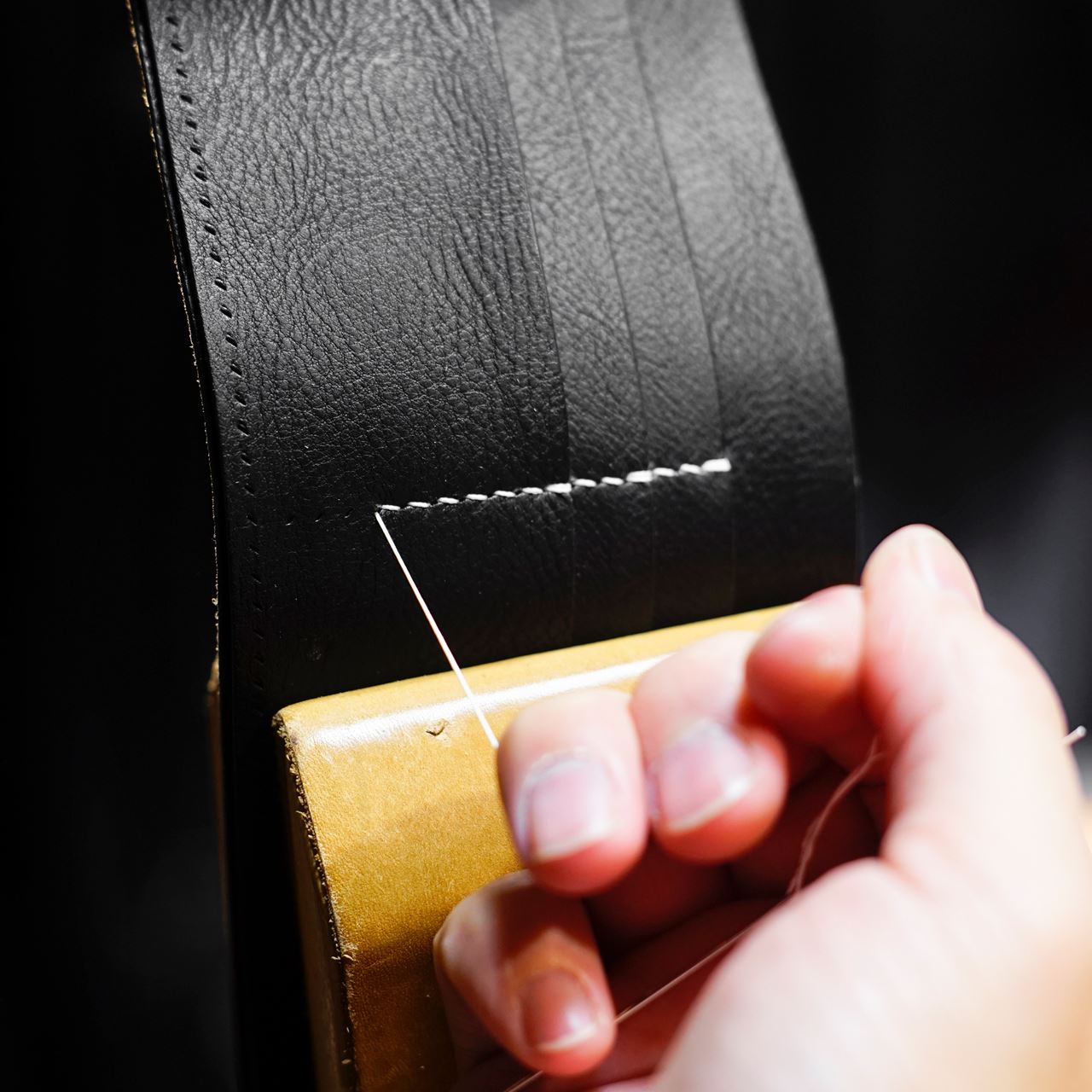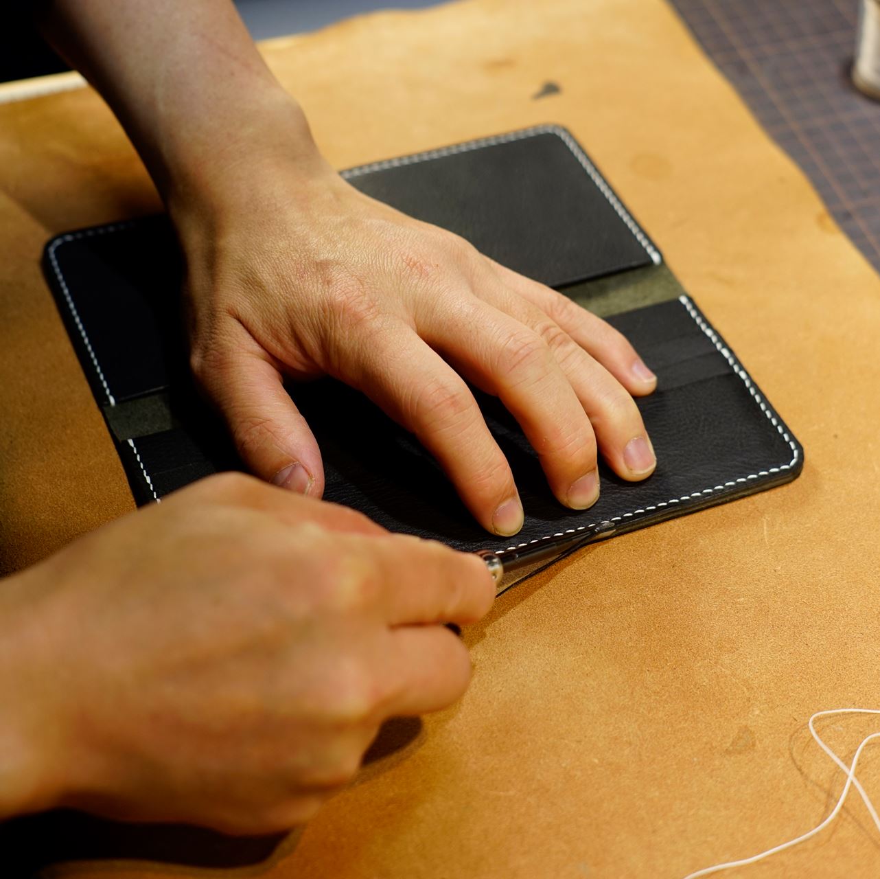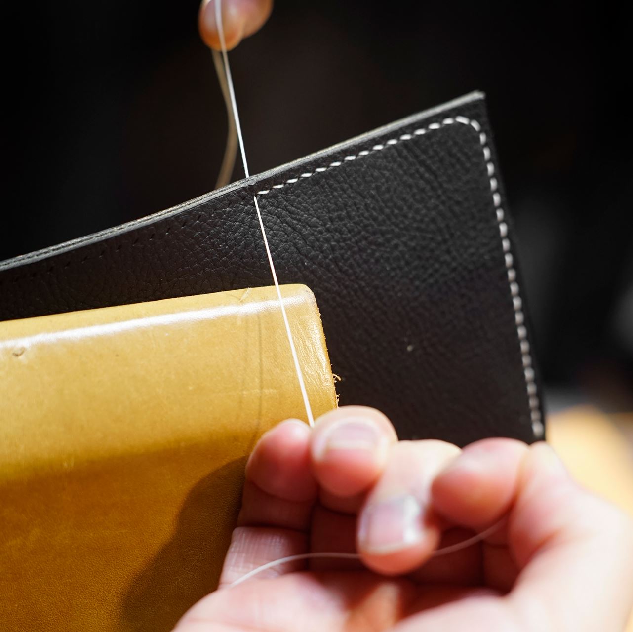 ぐるりと四方を六花リネン糸の07白でステッチしていきます。全て縫い上がったのでコバ磨きを施して仕上げていきます。